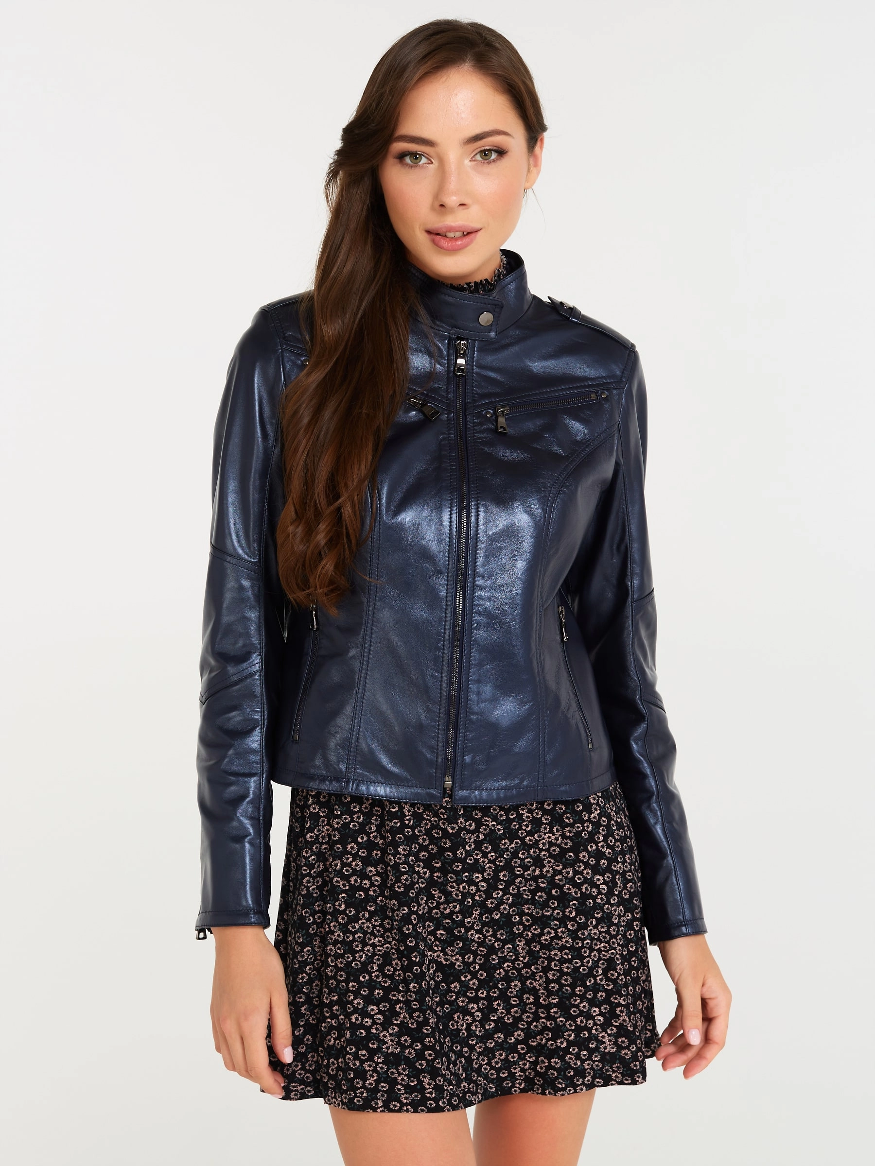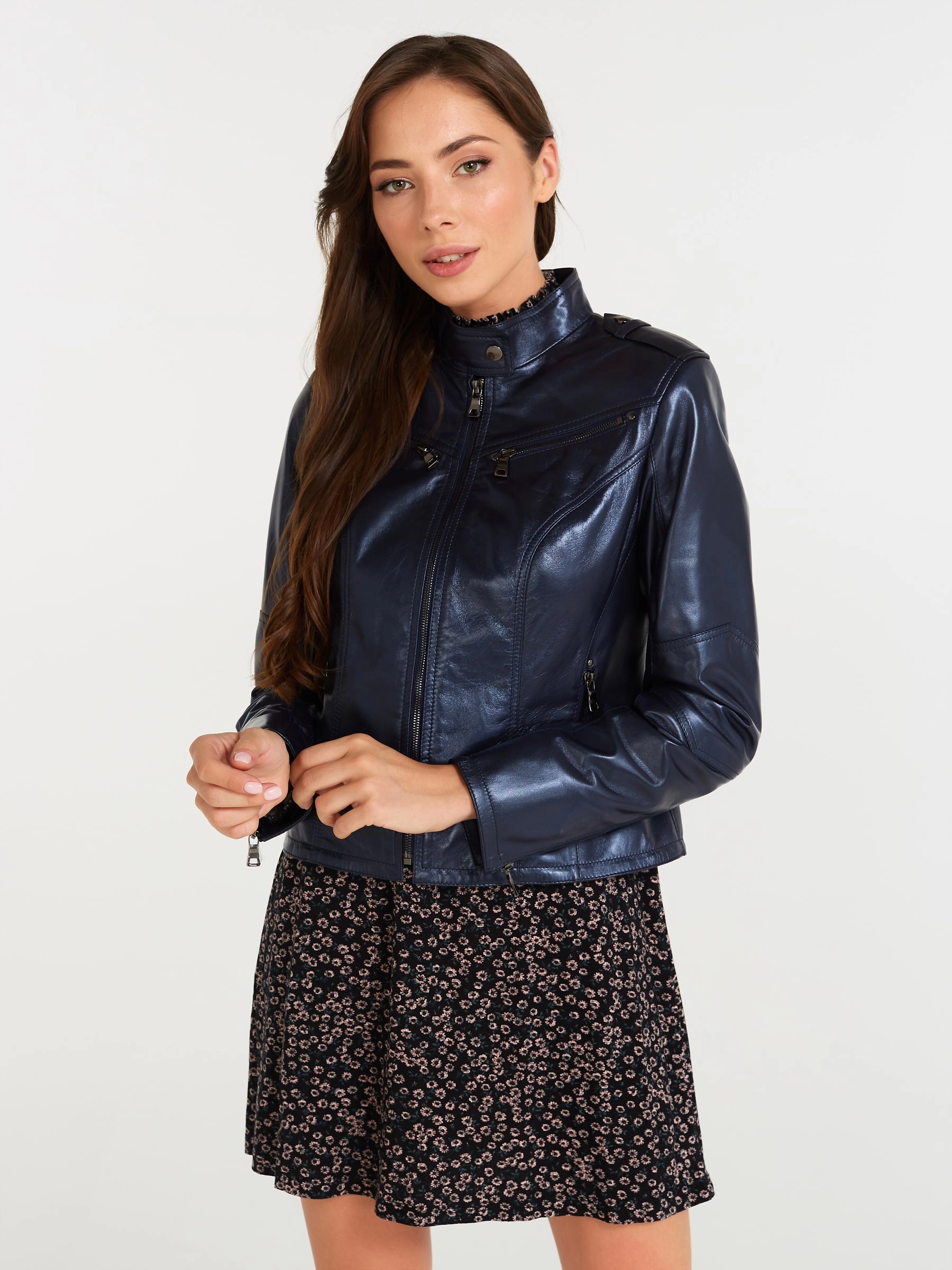 Кожаная куртка женская 399, синий перламутр, размер 46, артикул 90410