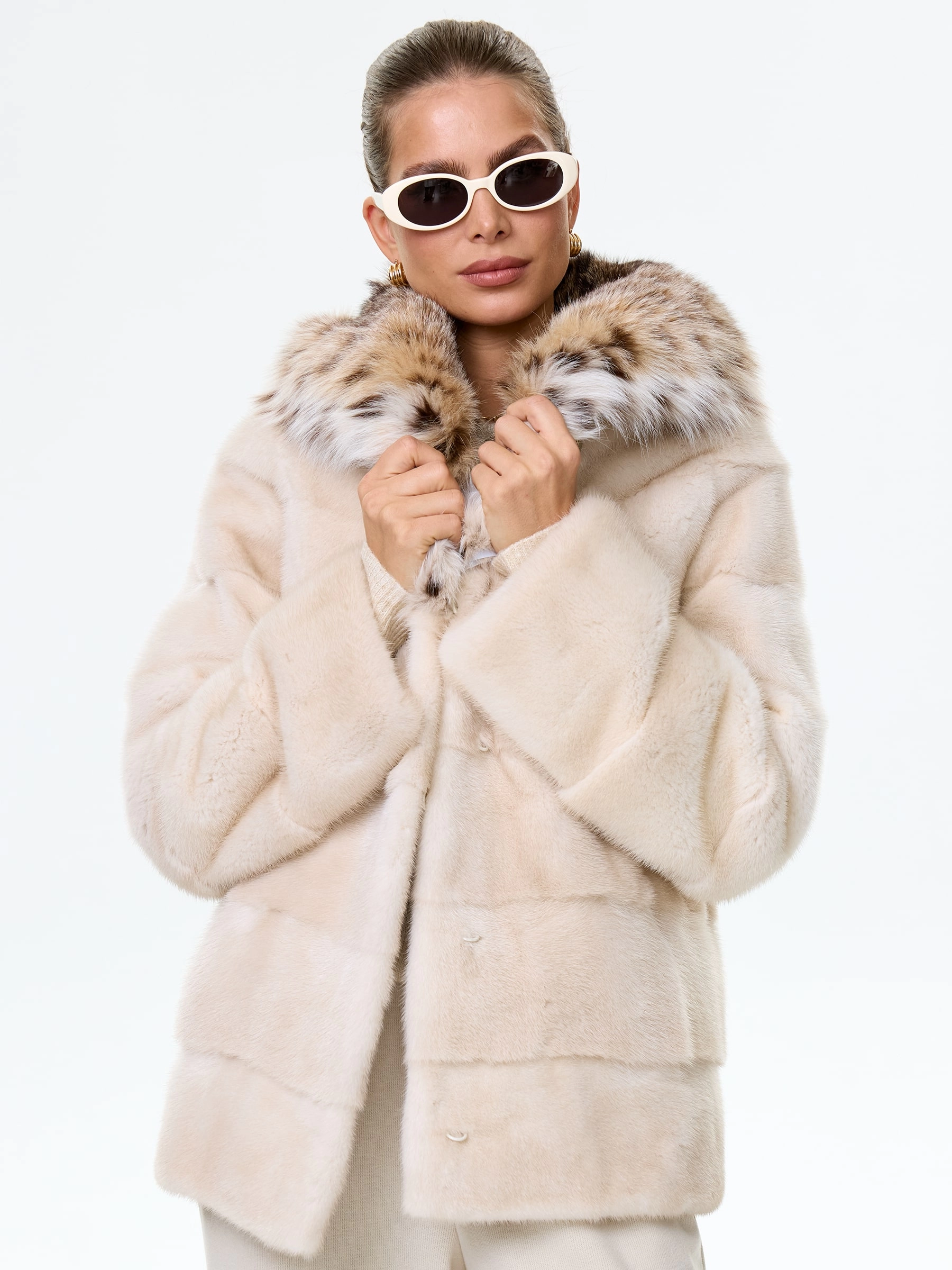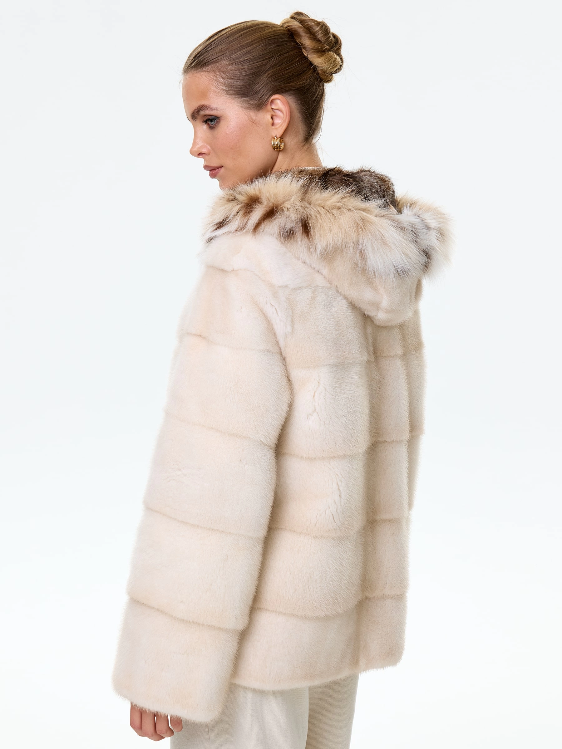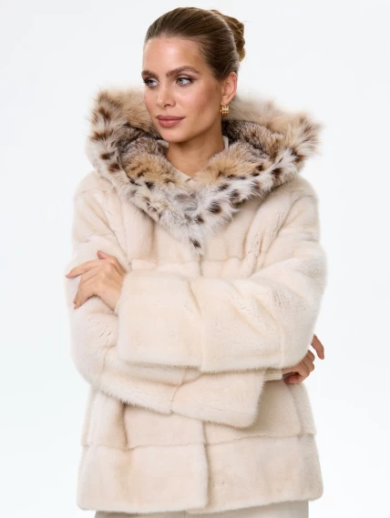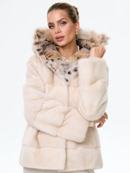 Куртка женская с капюшоном из меха норки и отделкой рысевидной кошкой Юля(к), жемчужная, размер 48, артикул 34140