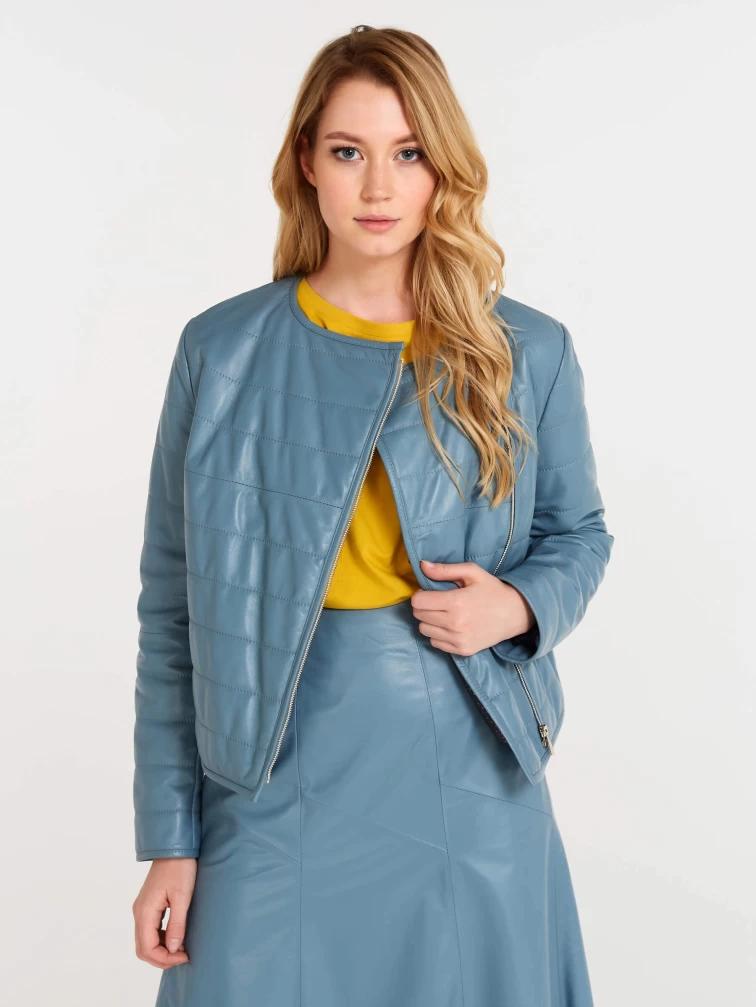 Товар утепленная кожаная женская косуха без воротника 306, голубая, размер 46, артикул 23610 выполнен из натуральной кожи с застежкой молния. Рассчитан на сезон: демисезон. Длина изделия 53 см, силуэт полуприлегающий.