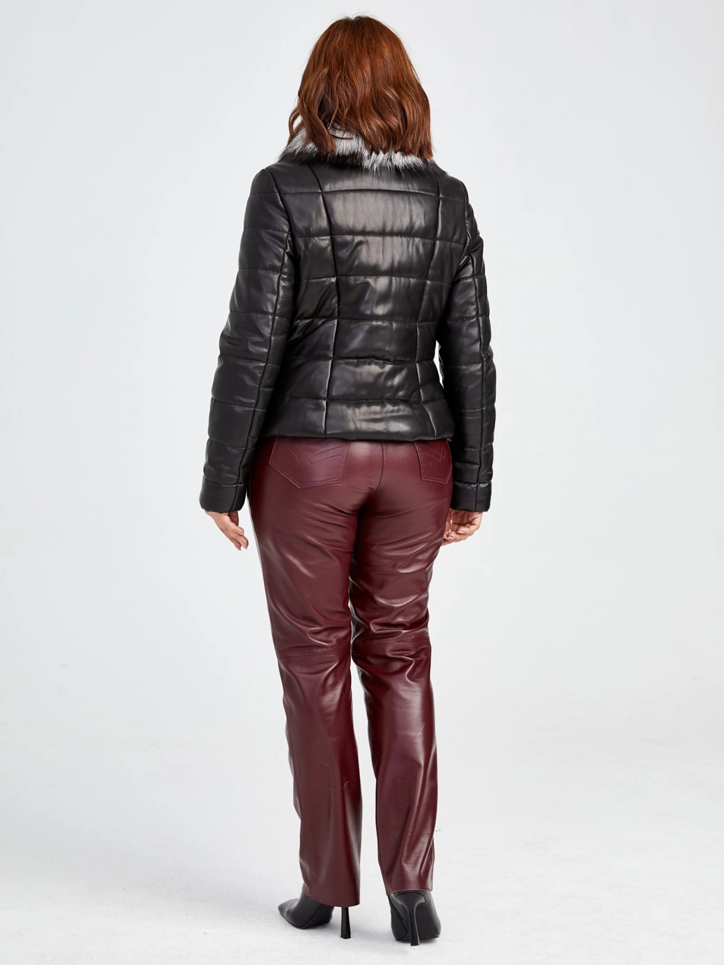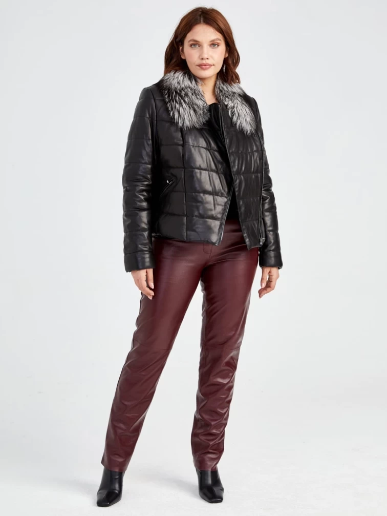 Современная утеплённая кожаная куртка-косуха. Кожаные детали скомбинированы с итальянской плащёвкой. Утеплитель синтепон. Воротник из меха серебристо-чёрной лисы. Карманы-листочки на молнии.
