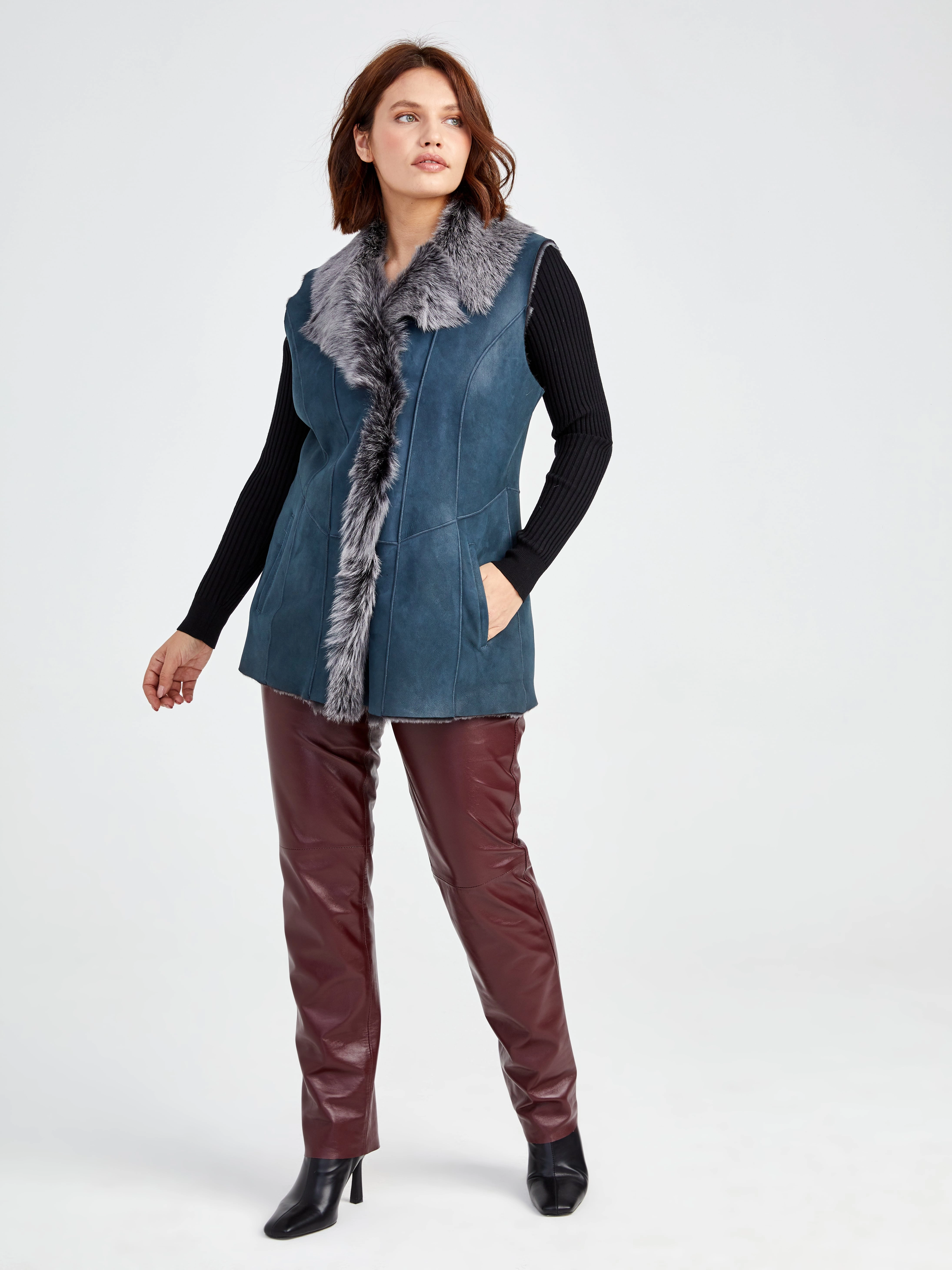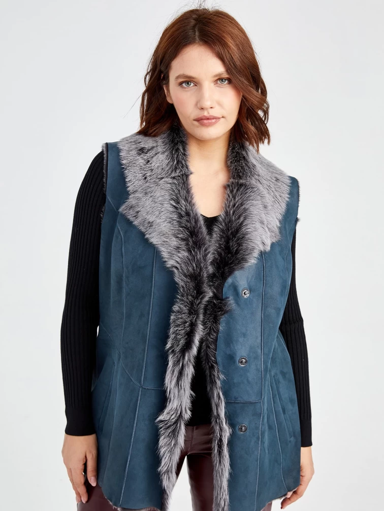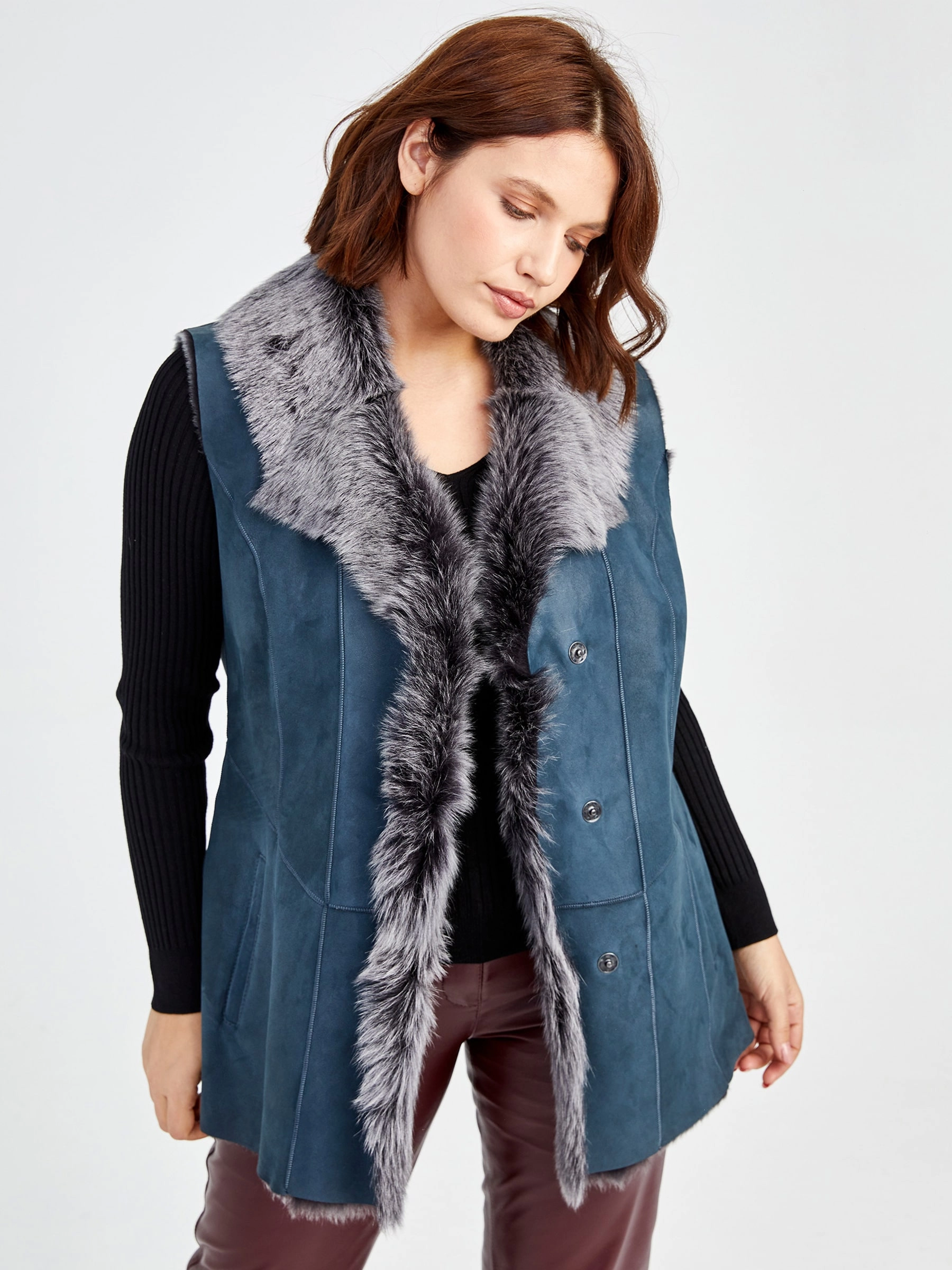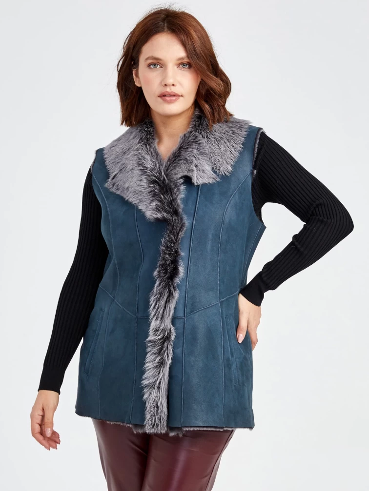 Товар меховой жилет из тосканы женский 02, синий, размер 52, артикул 62240 выполнен из овчина "тоскана" с застежкой пуговицы. Рассчитан на сезон: осень-зима. Длина изделия 70 см, силуэт полуприлегающий.