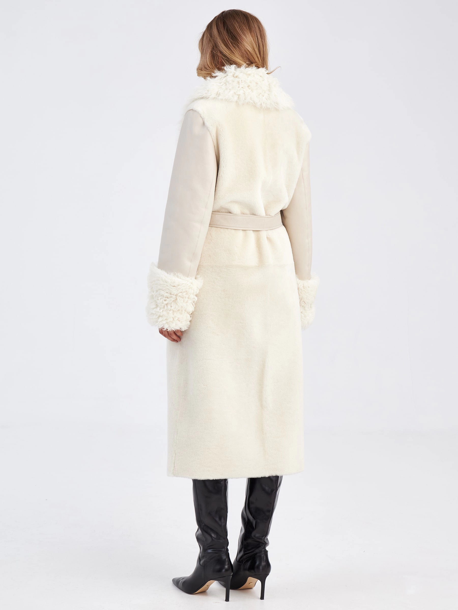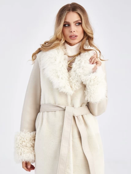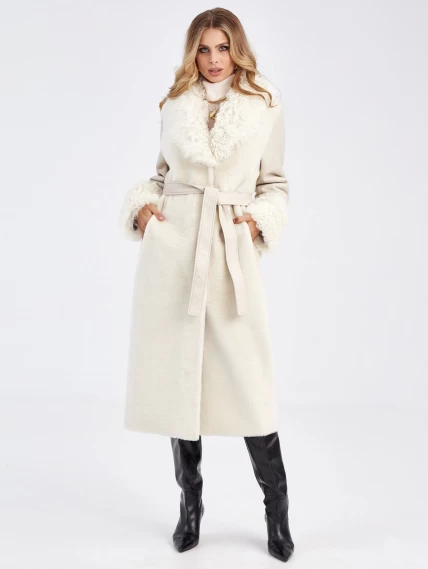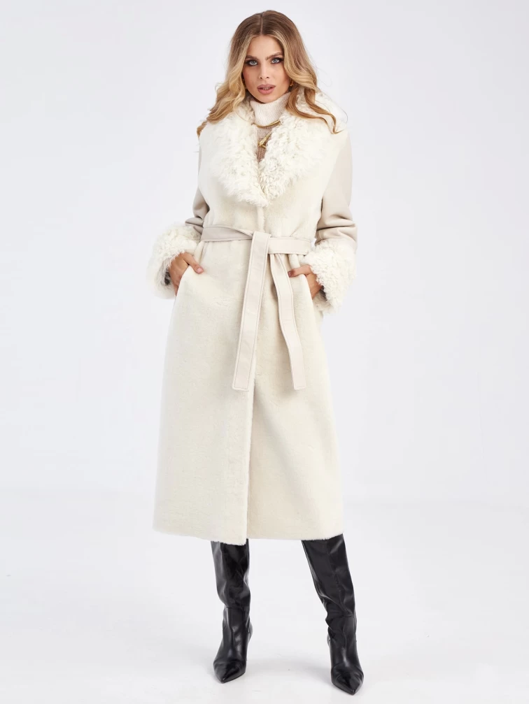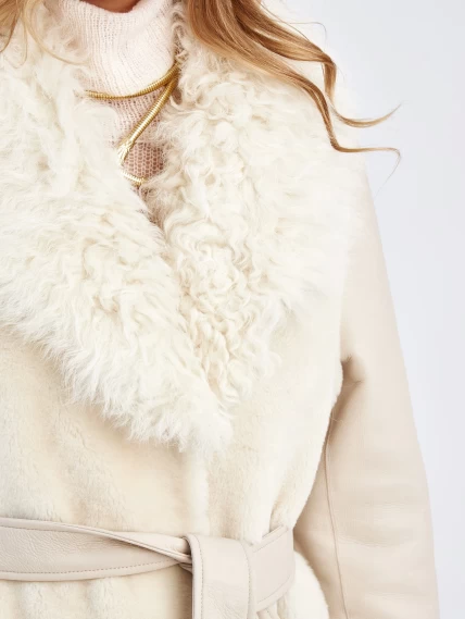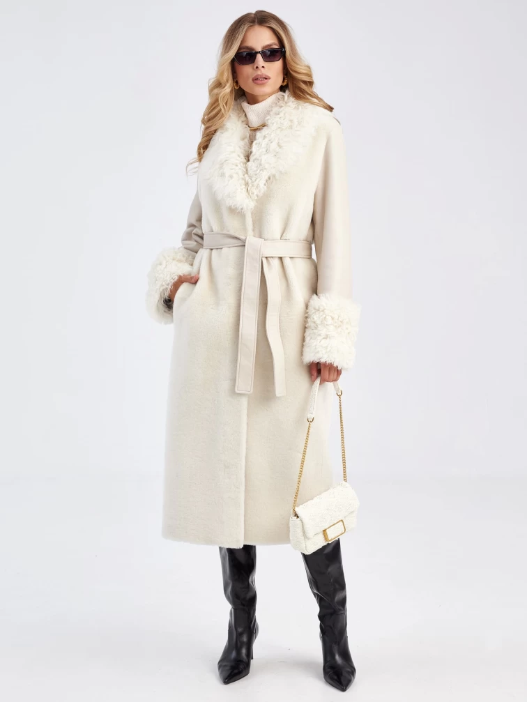 Модное длинное пальто из натуральной овчины в белом цвете прямого кроя, не уступает в сдержаности классическому пальто. Модель выполнили из плотной овчины, которая особенно хорошо удерживает тепло. Изнаночную сторону обработали так, чтобы она стала гладкой. На отделку шалевидного воротника и манжет использовали густой мягкий мех тиградо. Кожаный пояс поможет изменить силуэт, сделав его приталенным.