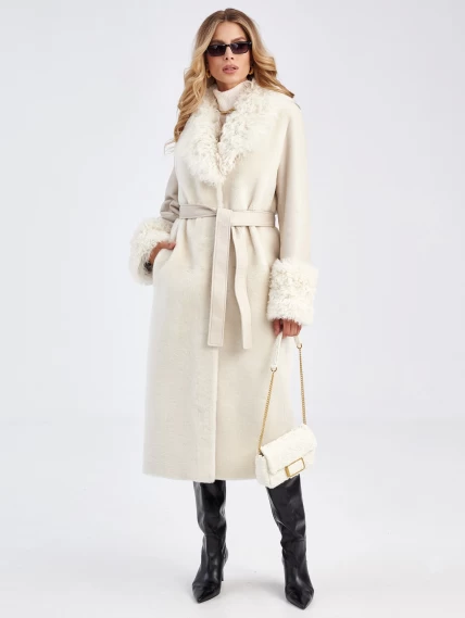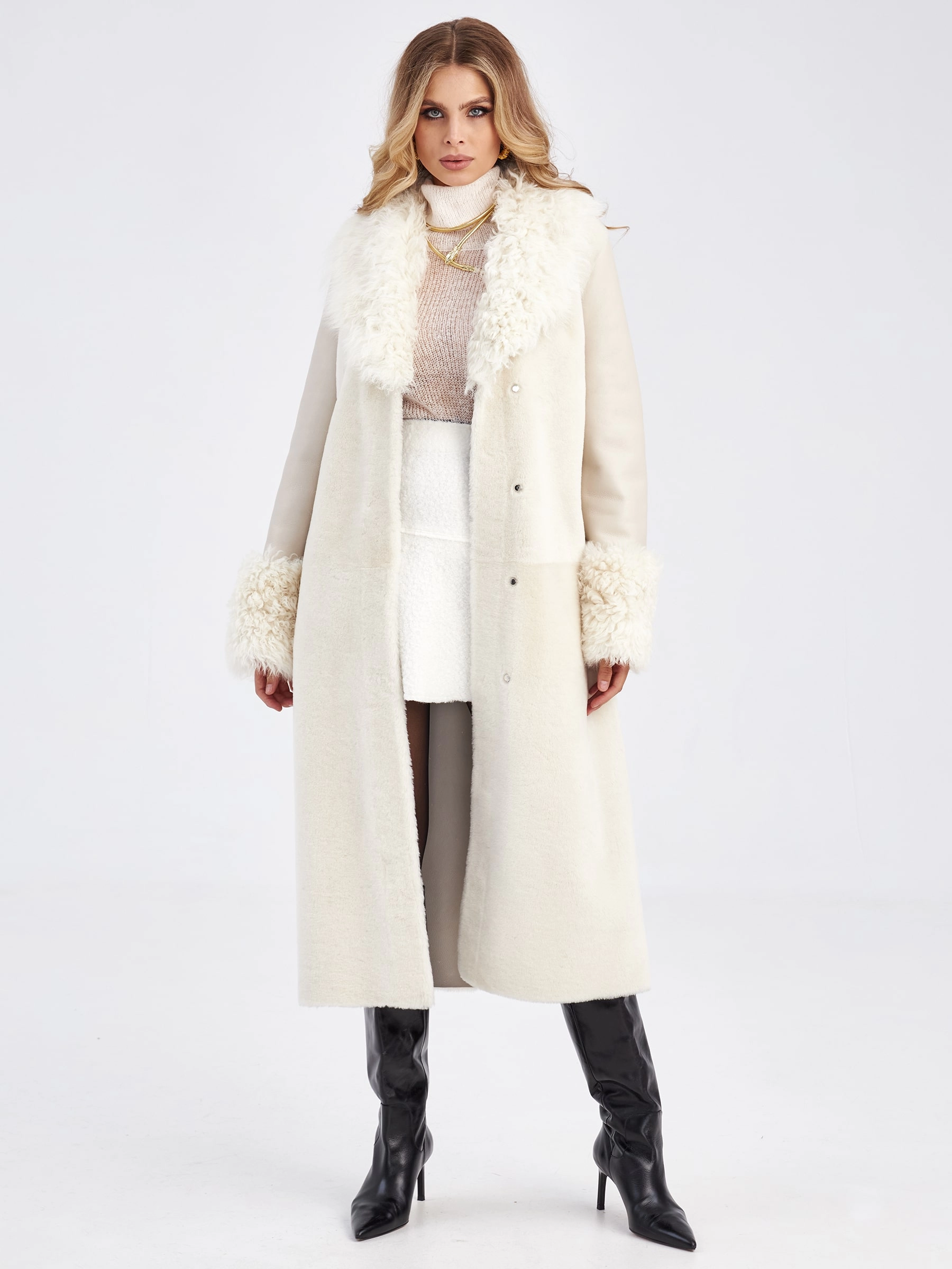 Товар модное женское пальто из меховой овчины с воротником тиградо премиум класса 2031, белое, размер 44, артикул 63930 выполнен из овчина "мерино" с застежкой кнопки. Рассчитан на сезон: осень-зима. Длина изделия 120 см, силуэт прямой.