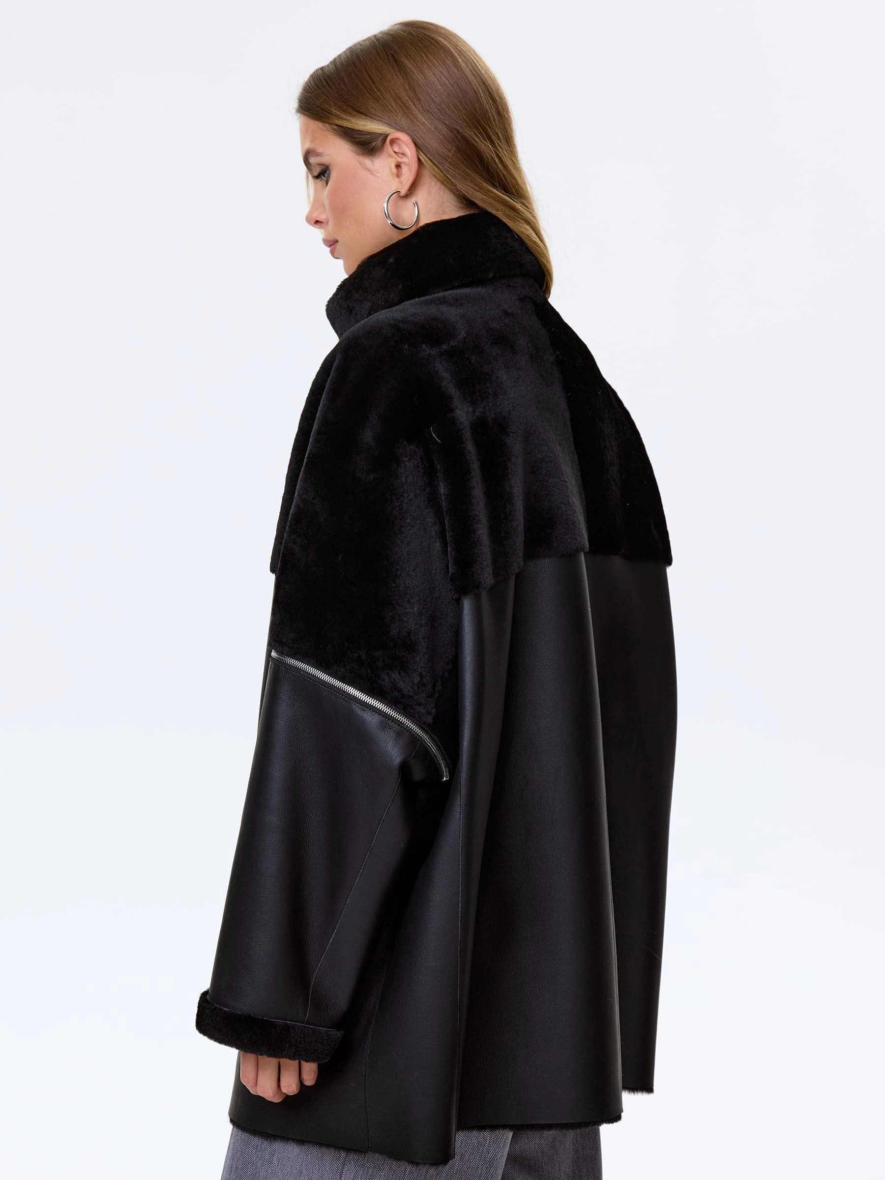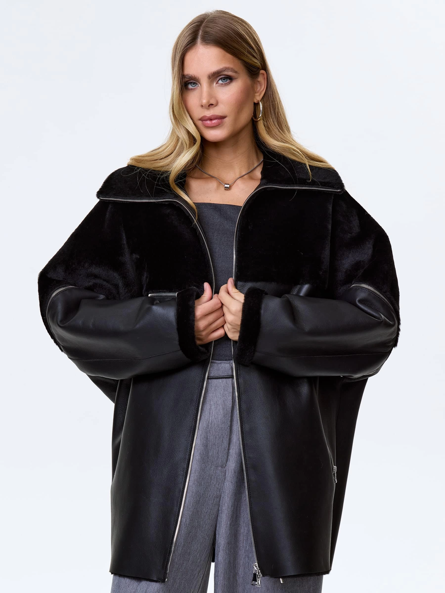 Молодежная дубленка оверсайз для женщин премиум класса 2051, черная, размер 48, артикул 64160