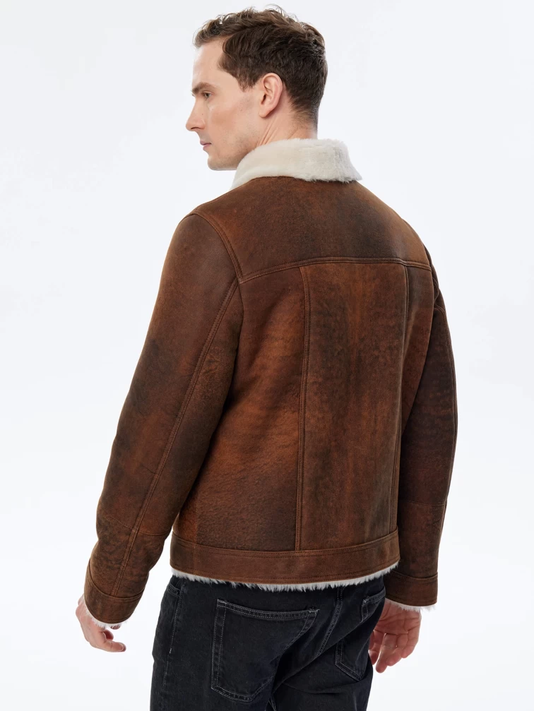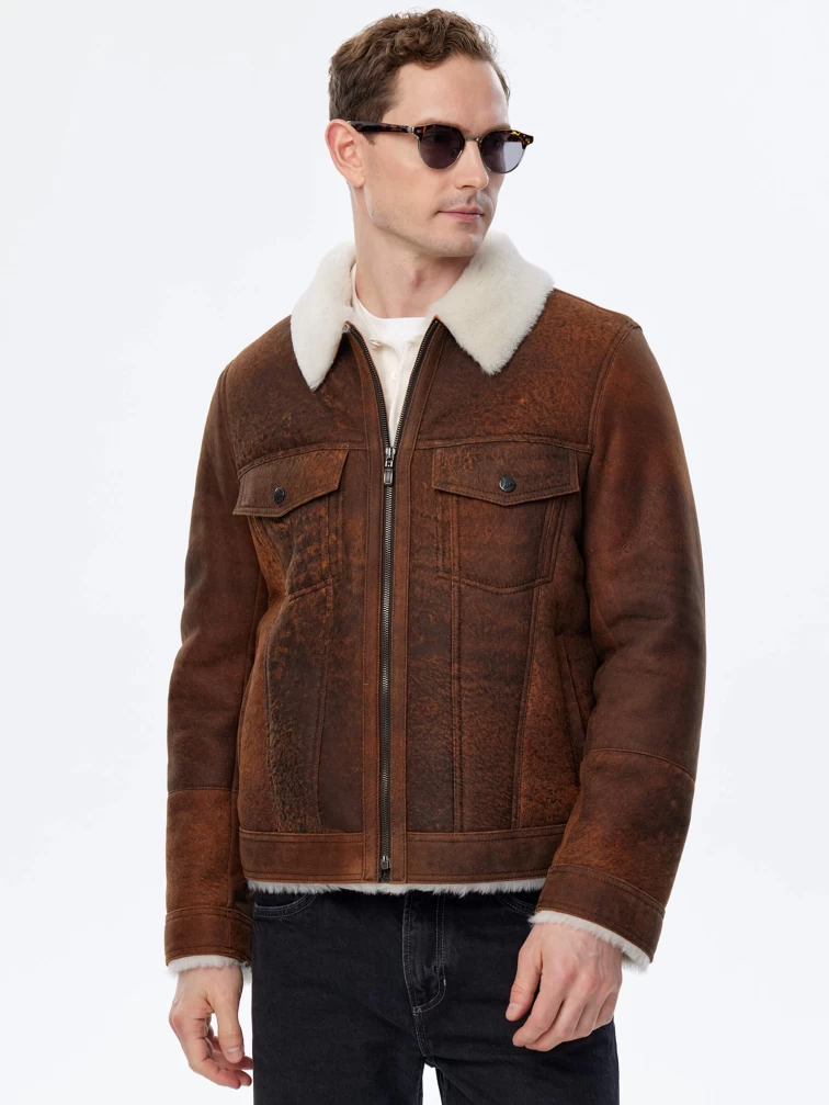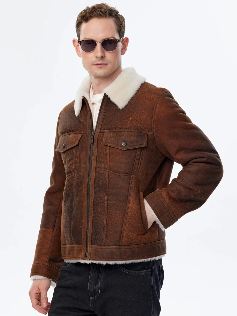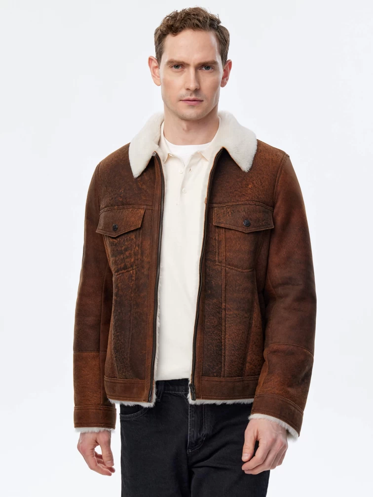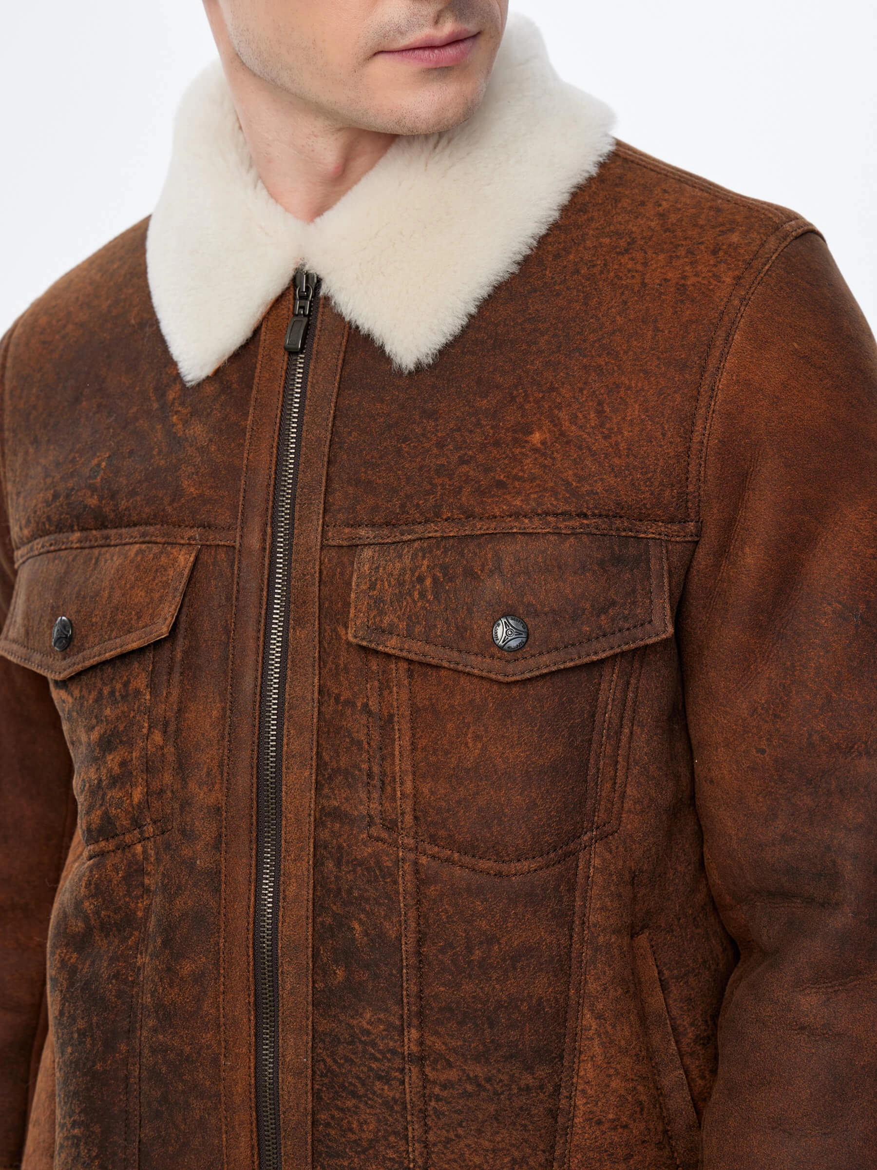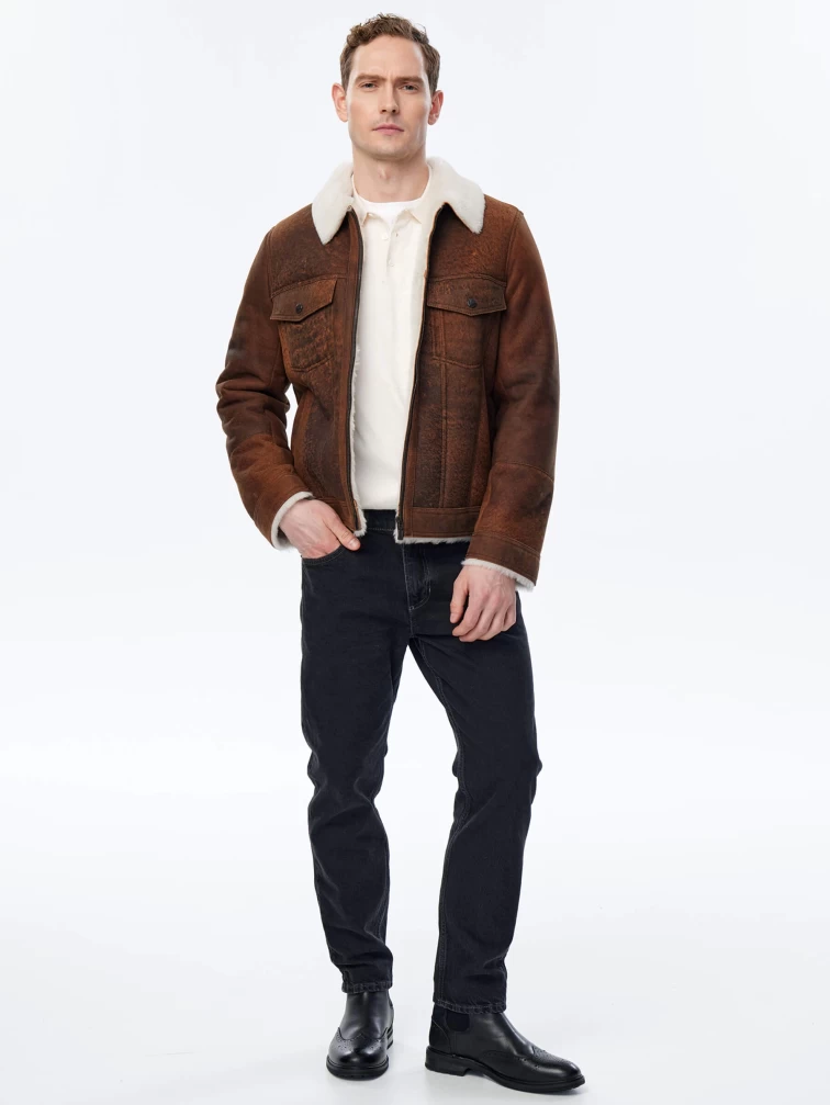 Товар мужская дубленка в джинсовом стиле премиум класса 437, коричневая, размер 50, артикул 71490 выполнен из овчина "мерино" с застежкой пуговицы. Рассчитан на сезон: осень-зима. Длина изделия 65 см, силуэт прямой.