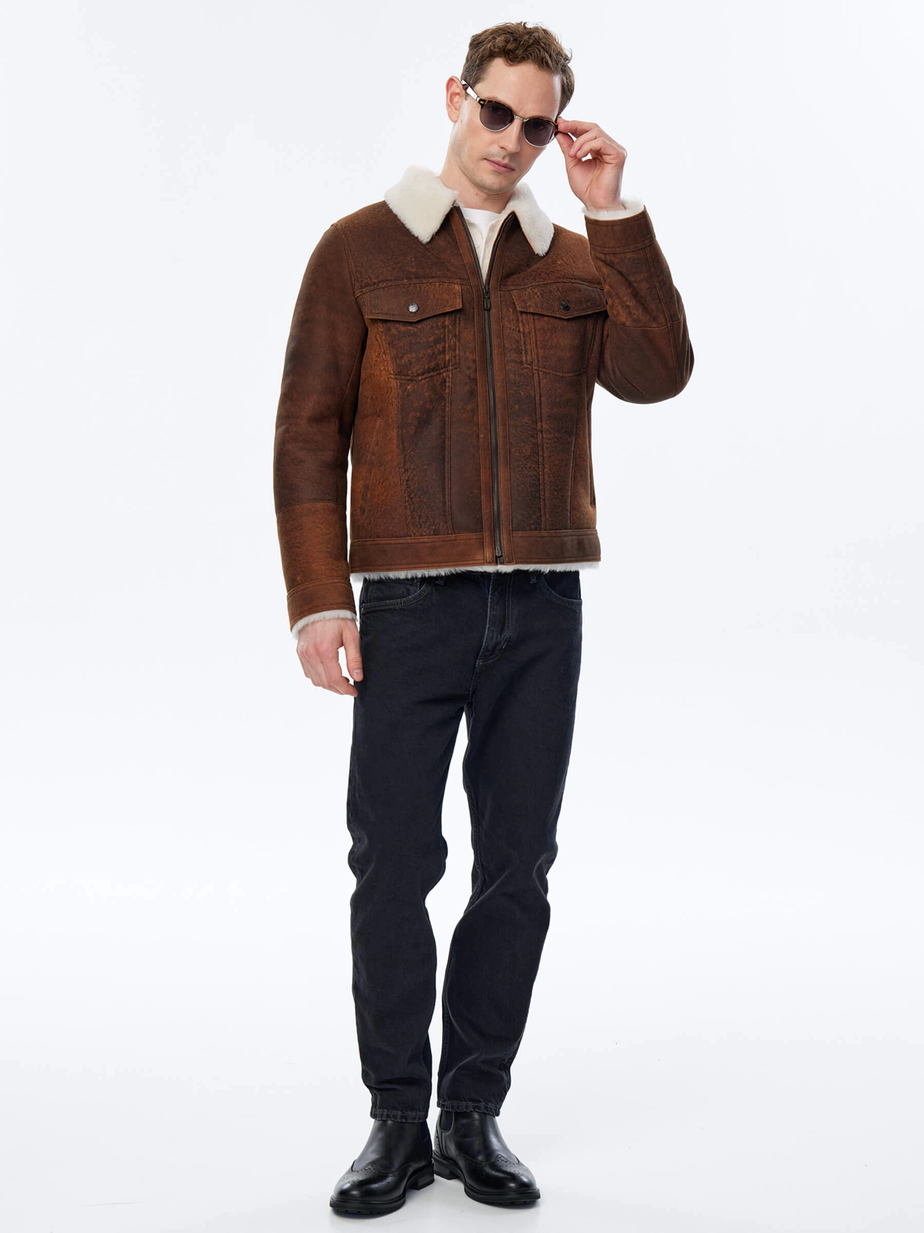 Эта дубленка прямого кроя четко повторяет дизайн классических курток из деним. Отложной воротник, те же нагрудные карманы закрывающиеся клапанами с кнопкой, отстрочки рельефов полочек. Для пошива модели выбрали мягкую овчину премиум класса.Максимально густой мех отлично защищает от холода. Высочайший уровень качества подчёркивают безупречная работа портных и комфортная посадка по фигуре.
