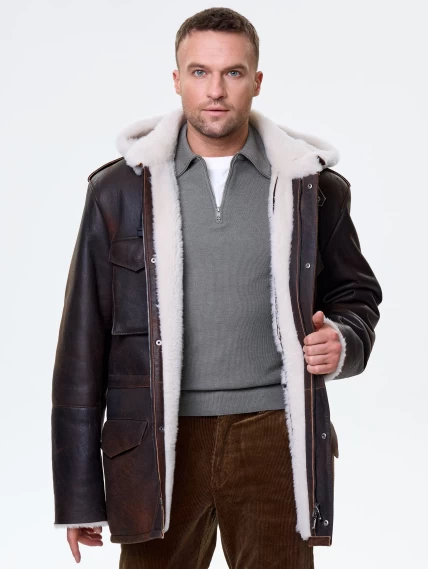 Товар мужское полупальто из натуральной овчины с капюшоном премиум класса 433, коричневая, размер 48, артикул 72000 выполнен из овчина "мерино" с застежкой молния. Рассчитан на сезон: осень-зима. Длина изделия 81 см, силуэт прямой.