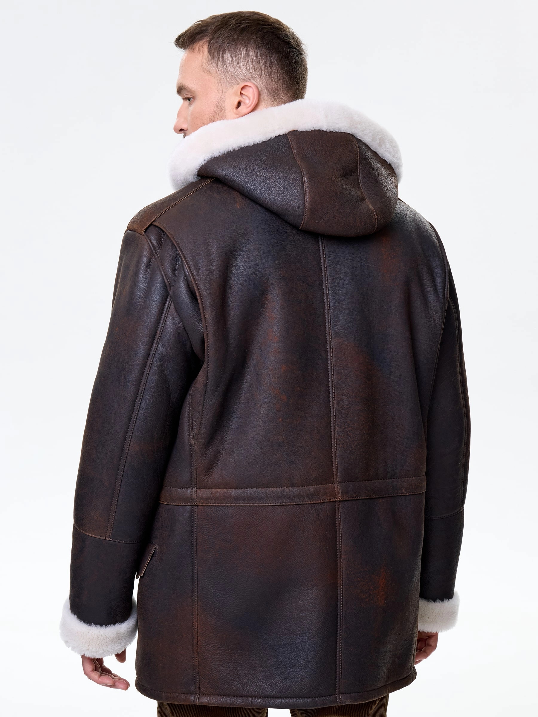 Мужское полупальто из натуральной овчины с капюшоном премиум класса 433, коричневая, размер 48, артикул 72000