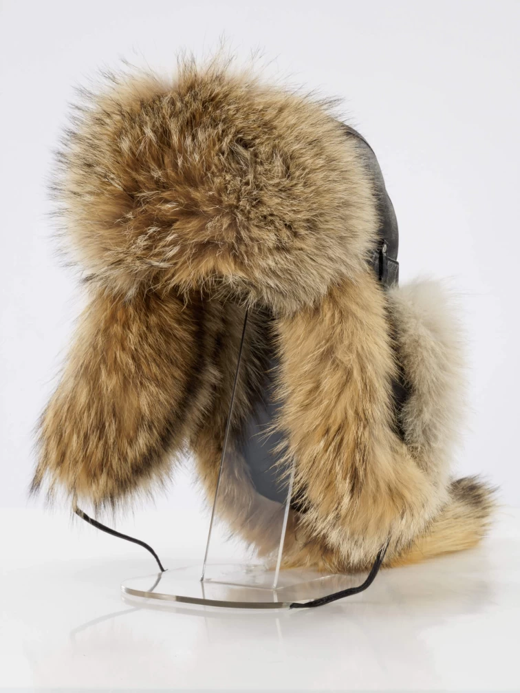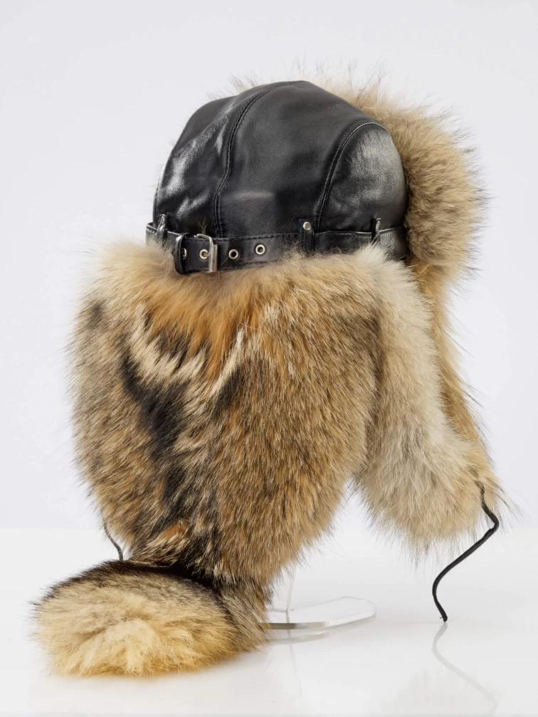 Комбинированная шапка Малахай ПК001КВ изготовлена из натуральной итальянской кожи и меха койота. Меховое изделие не формованное, имеет мягкую основу. Меховые «уши» опускаются. Задняя часть шеи закрыта длинным меховым хвостом, изнутри усиленным натуральной кожей. Объем шапки регулируется изнутри фиксатором-лентой, а снаружи кожаным ремешком.