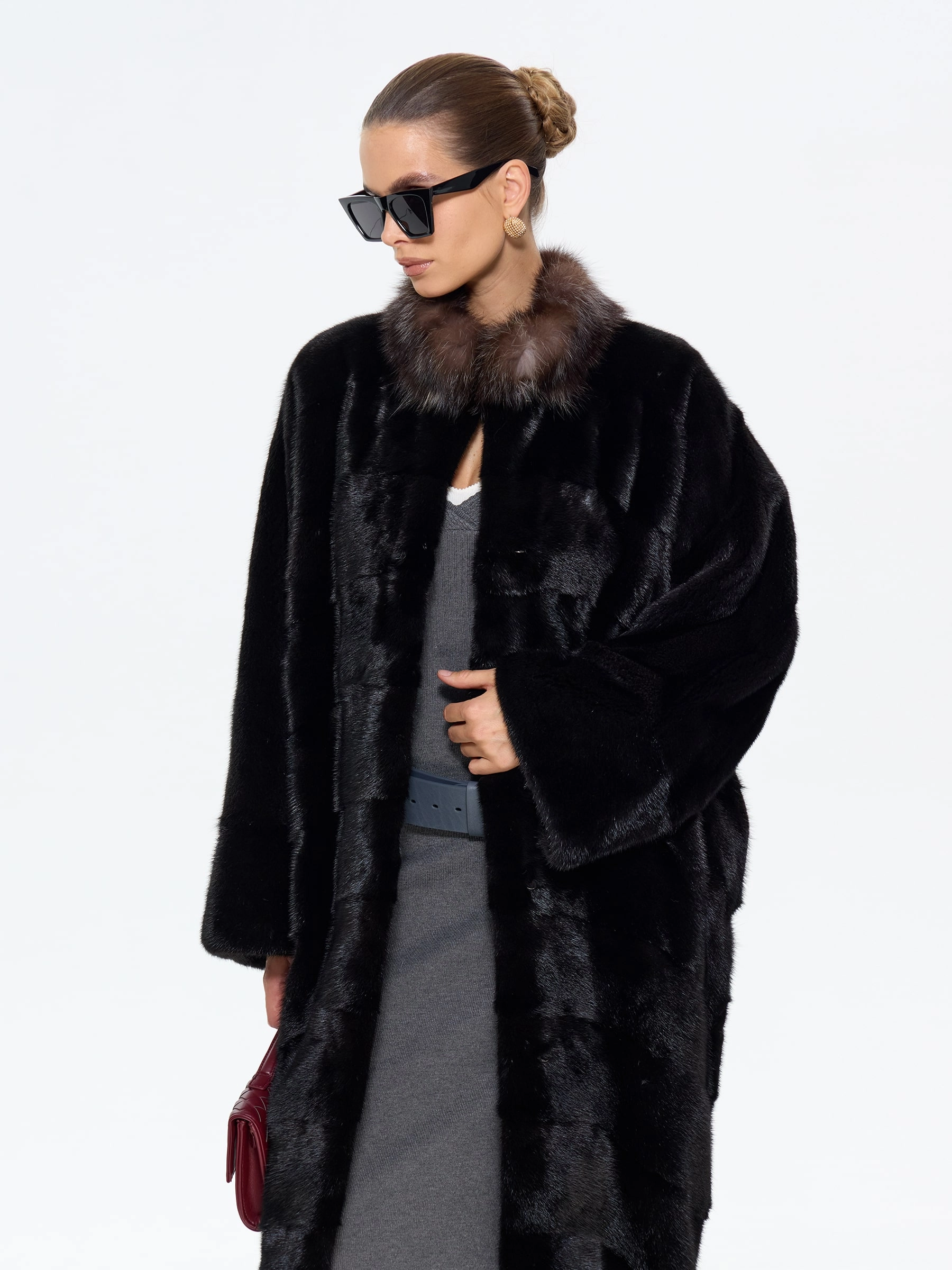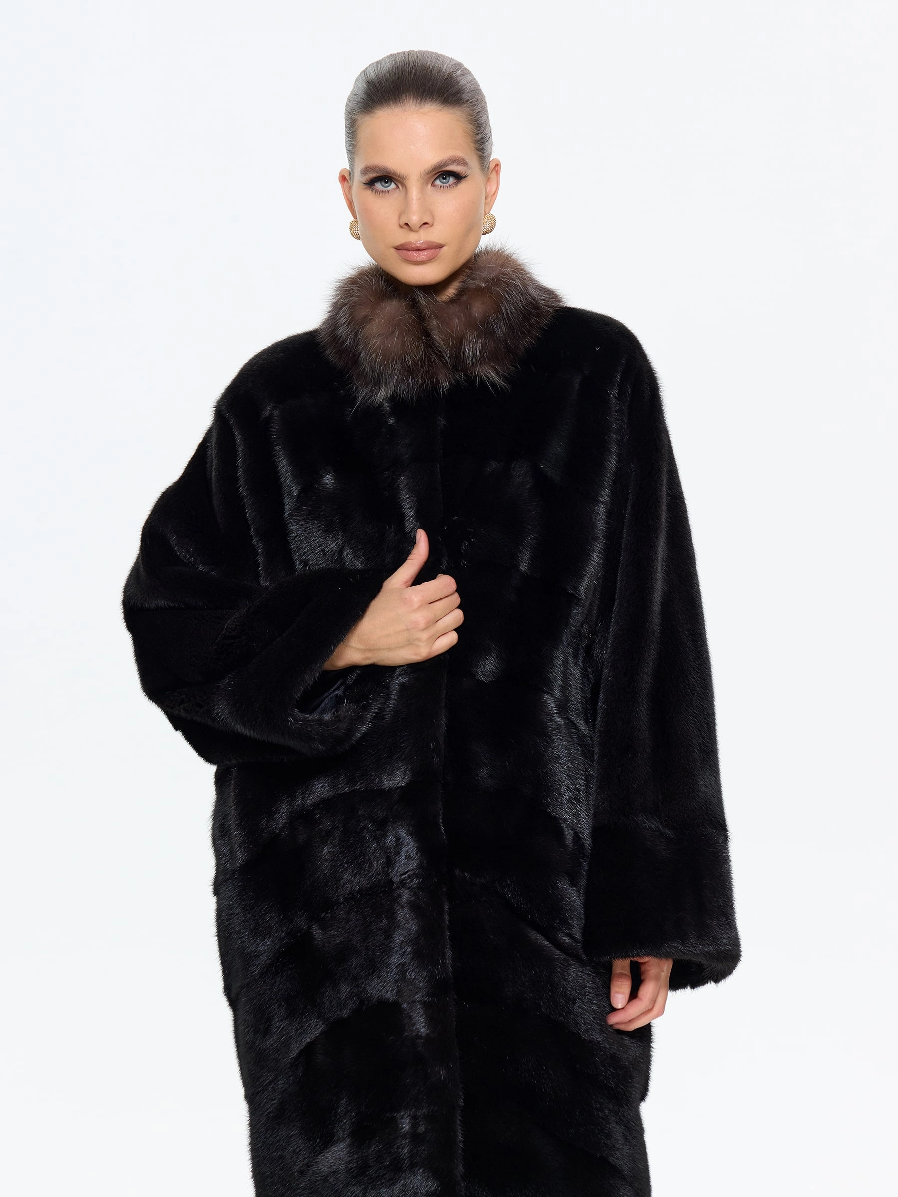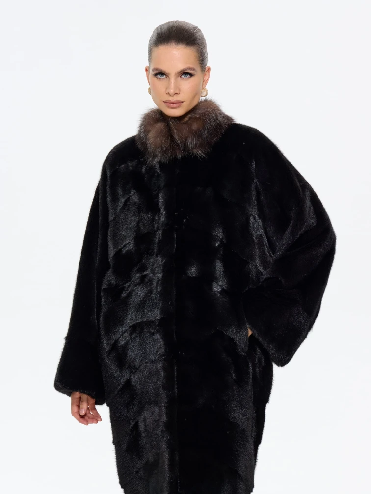 Роскошная длинная шуба из меха норки премиум-класса в шоколадном оттенке "какао" с элегантной стойкой, отделанной мехом соболя. Модель прямого силуэта длиной 110 см с диагональной раскладкой меха и свободным рукавом кимоно подчеркивает аристократическую элегантность и неповторимый шарм. Стилисты рекомендуют носить эту шубу с кожаными сапогами-челси и узкими брюками для повседневного образа или с платьем-футляром и жемчужными серьгами для вечернего выхода. Идеальное сочетание вечной классики и современной роскоши для истинных ценительниц утонченного стиля.
