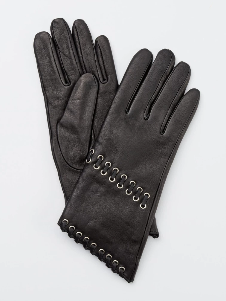 Перчатки женские торговой марки ELEGANZZA из натуральной кожи ягненка. Производство Италия. Отделка - стежка тонким кожаным шнурком через люверсы на лицевой части, манжета скошена. Длина манжеты от нижней точки большого пальца до края перчаток - 7 см.