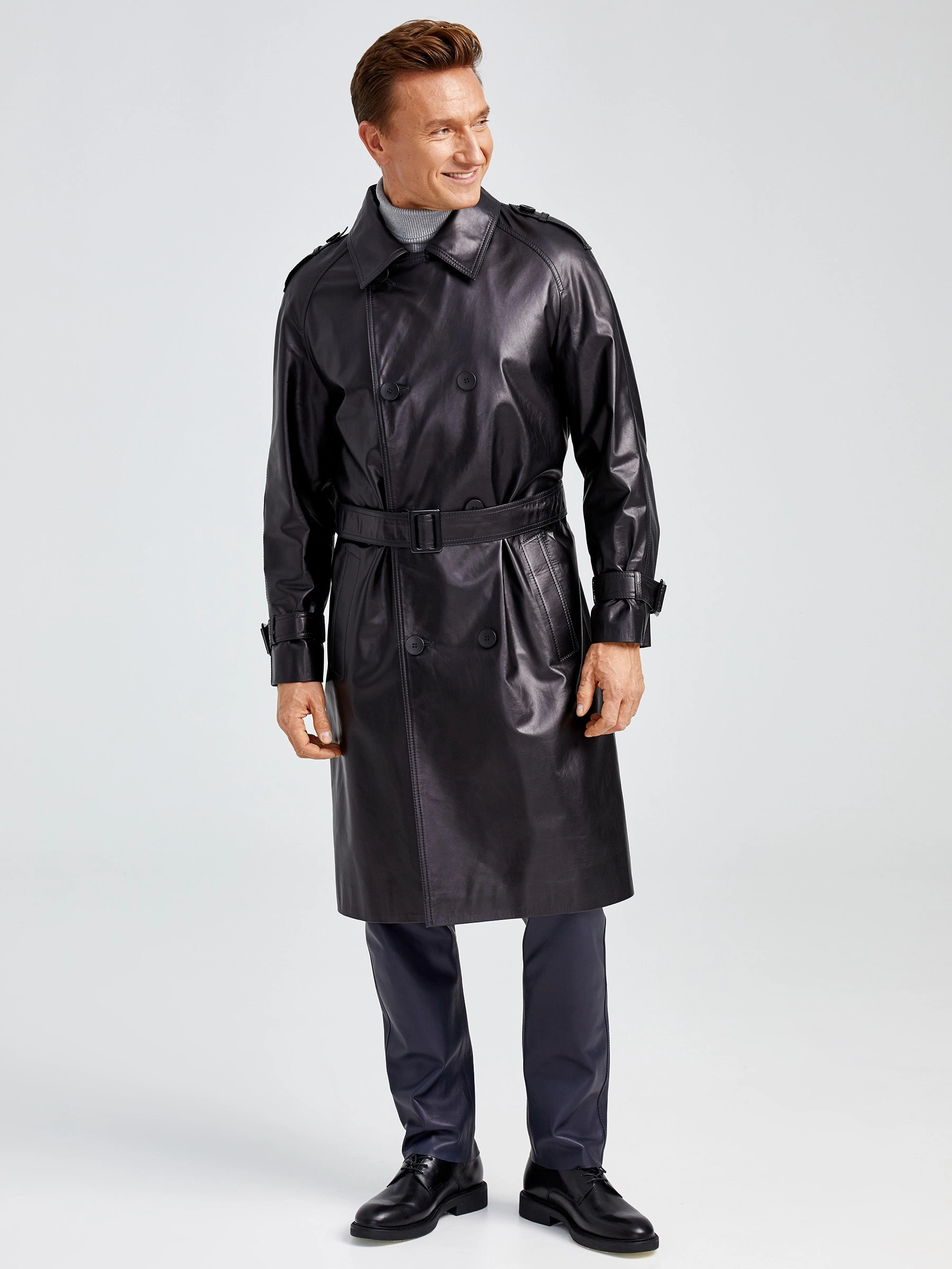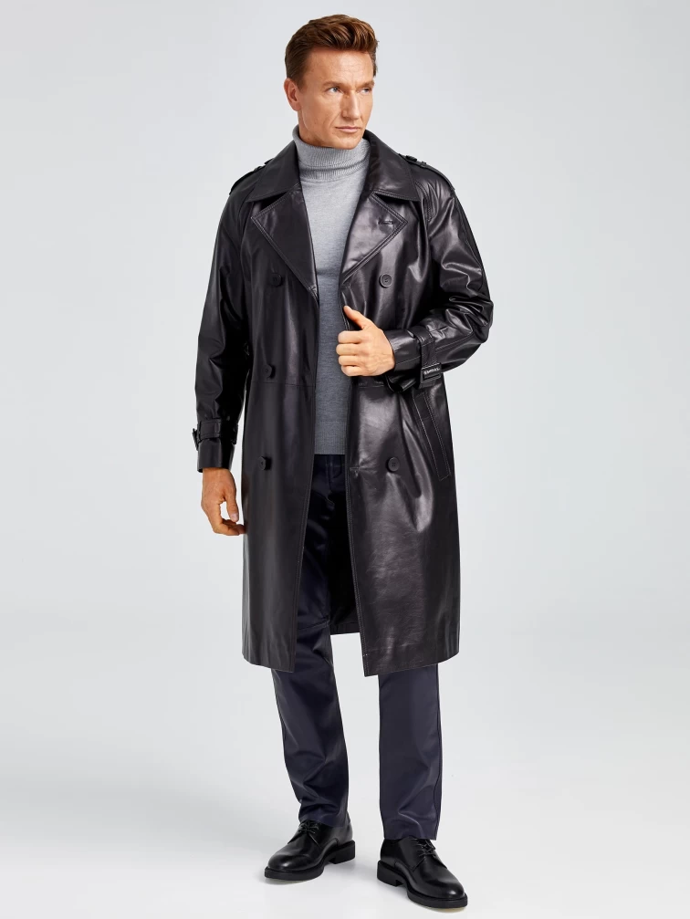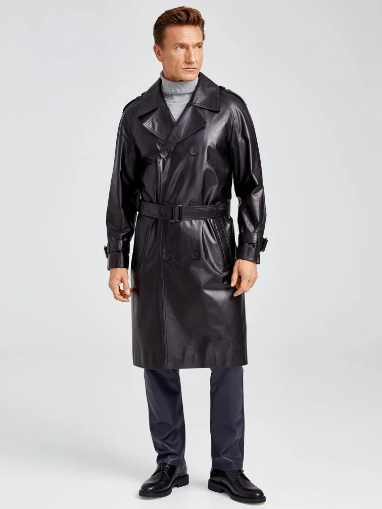 Двубортный кожаный плащ для уверенных в себе мужчин. Рукав - реглан, обеспечивают комфорт в движении. Сочетается по стилю как со свободной одеждой, так и со строгим деловым костюмом. Рекомендуется мужчинам, для которых важен дресс - код.