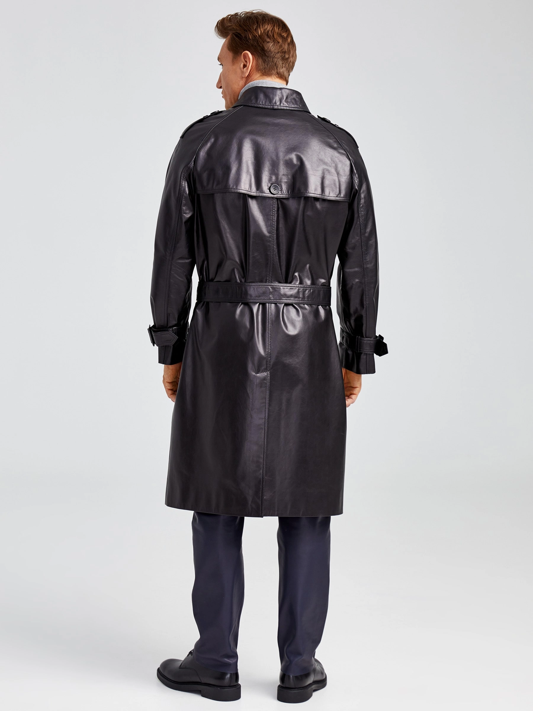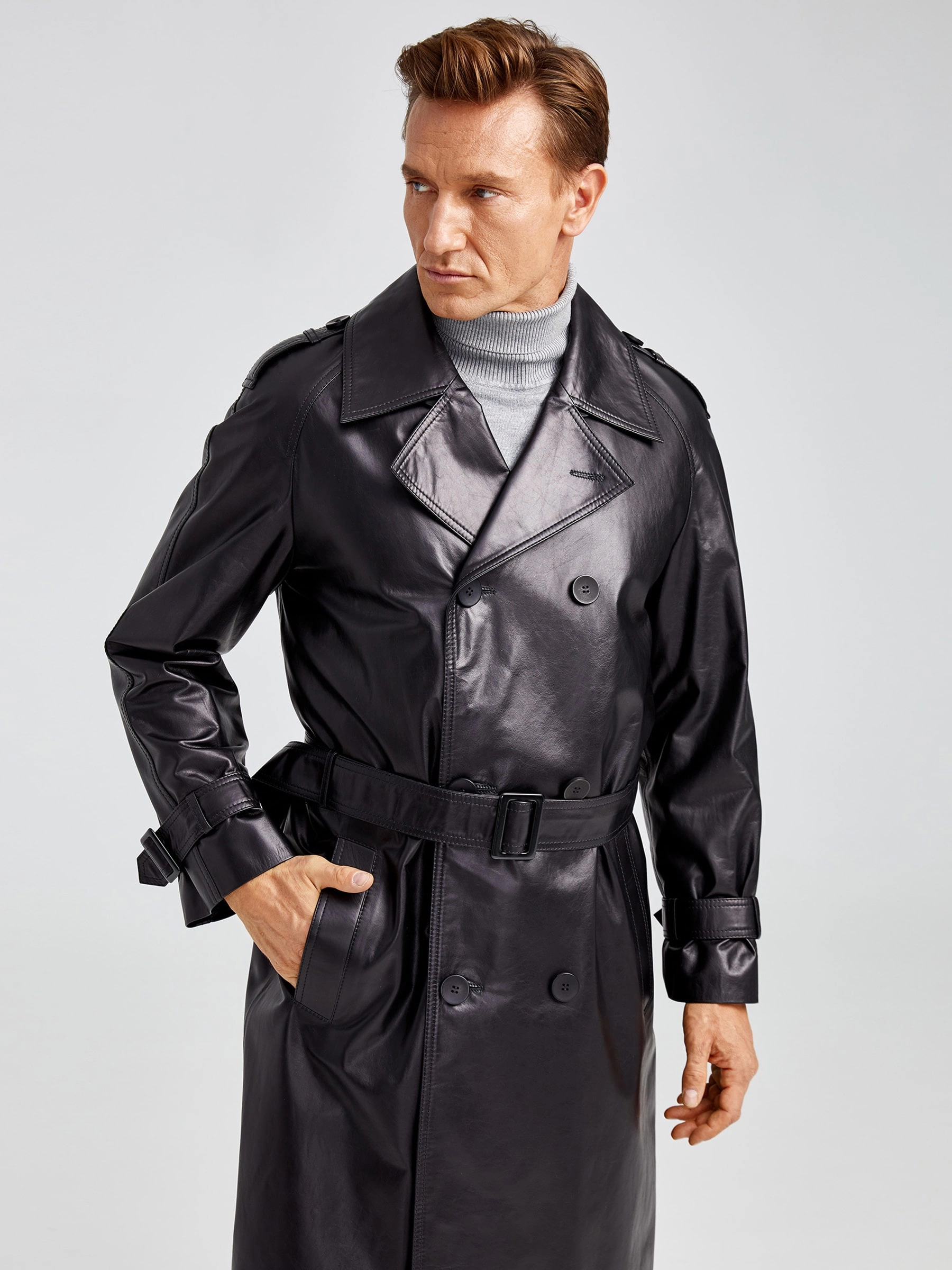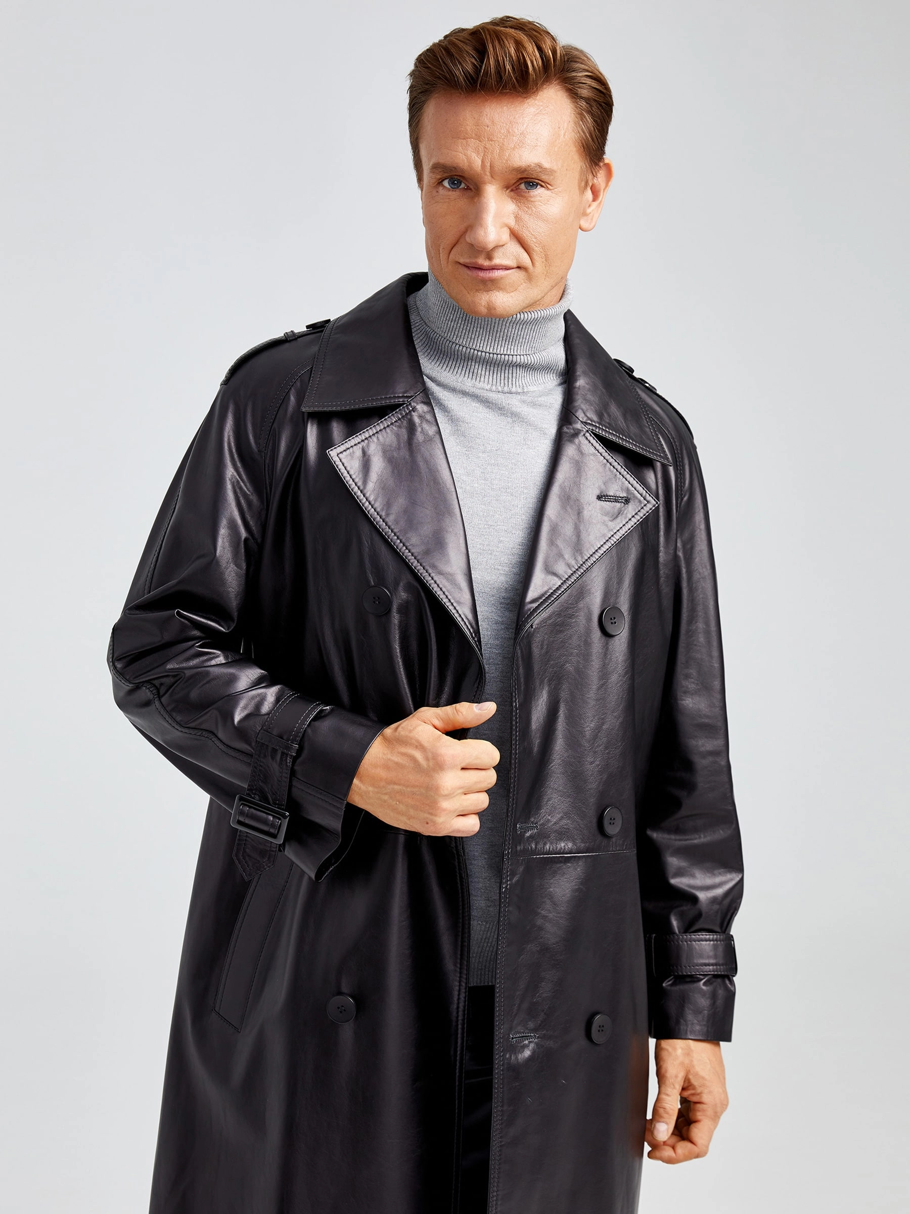 Двубортный кожаный плащ для уверенных в себе мужчин. Рукав - реглан, обеспечивают комфорт в движении. Сочетается по стилю как со свободной одеждой, так и со строгим деловым костюмом. Рекомендуется мужчинам, для которых важен дресс - код.