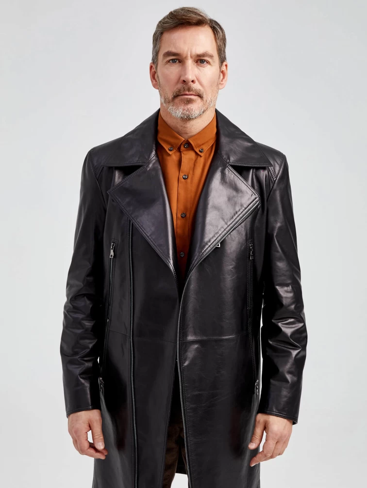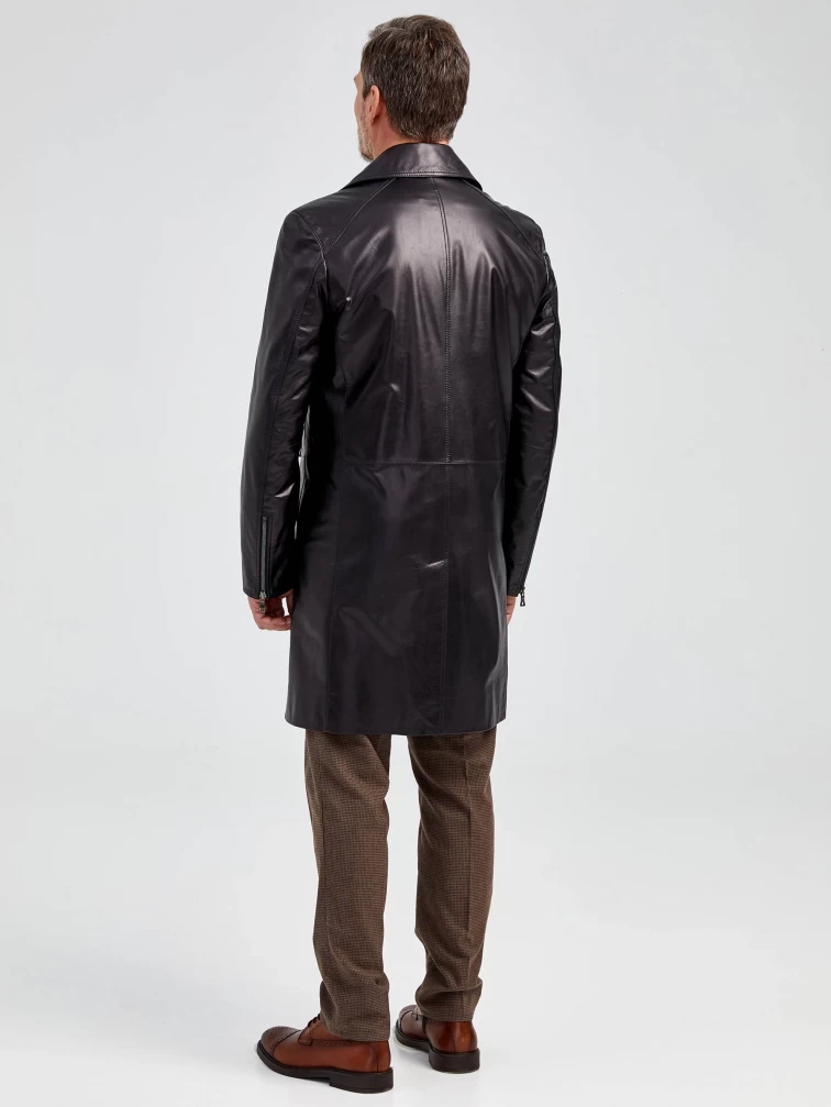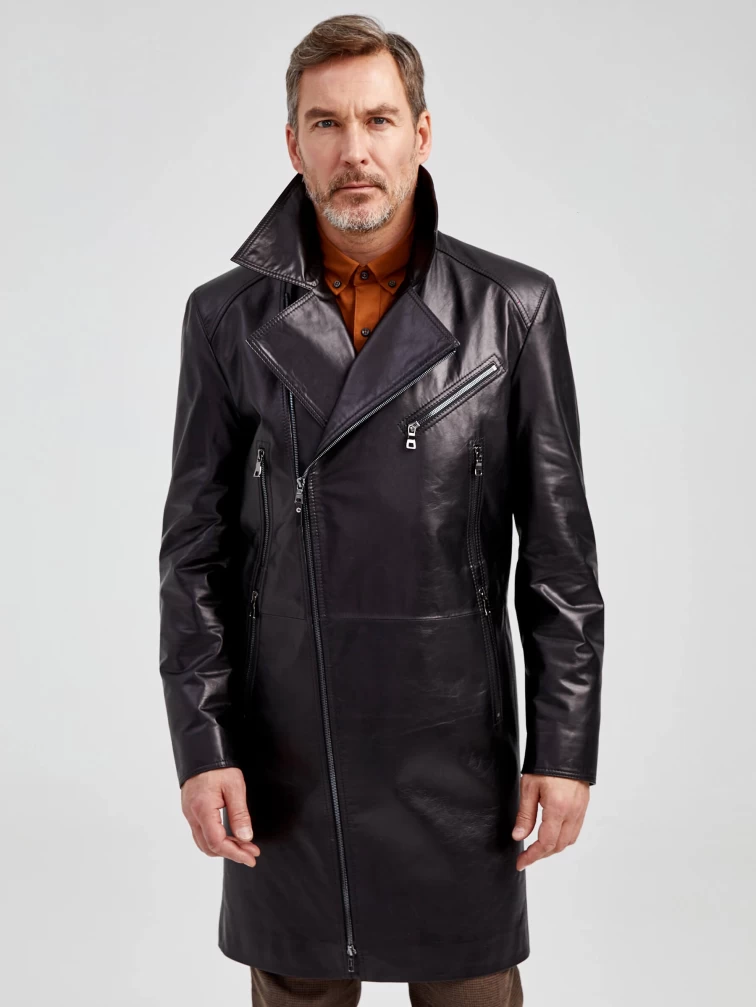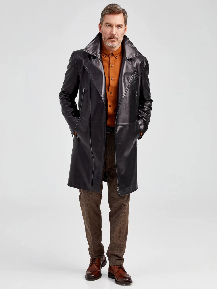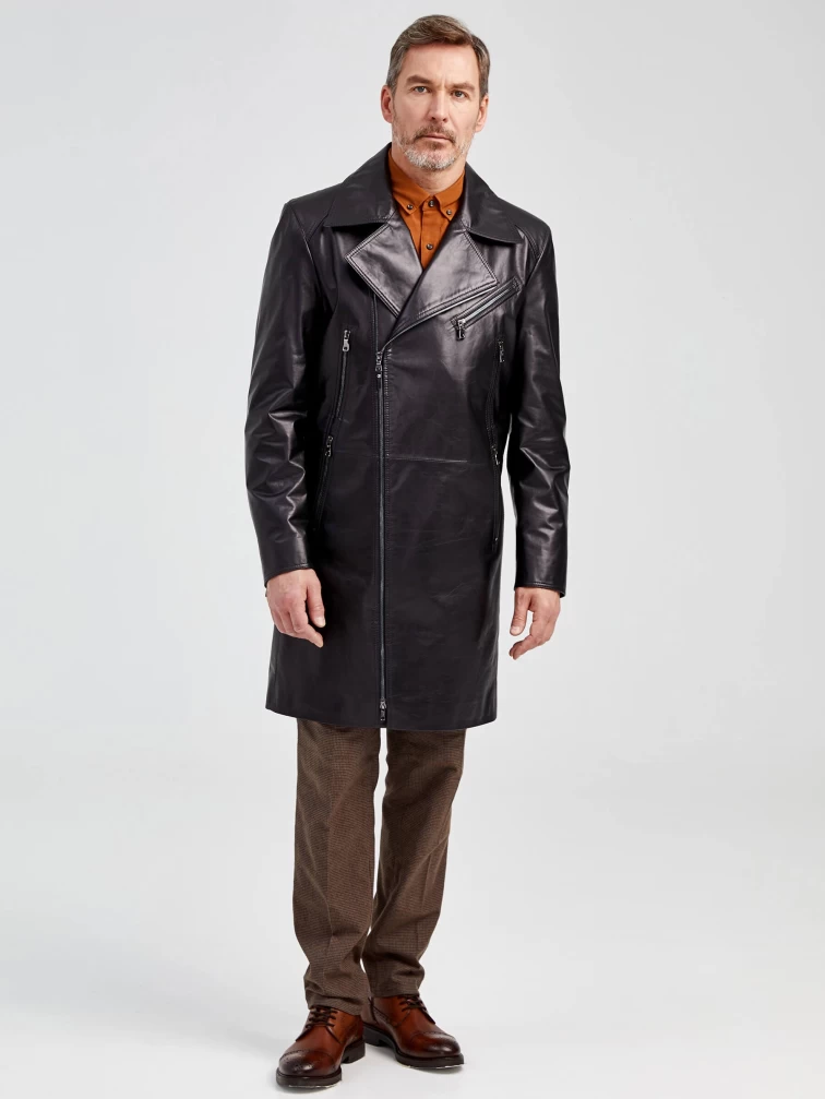 Товар мужской кожаный плащ косуха премиум класса 554, черный, размер 54, артикул 40551 выполнен из натуральной кожи с застежкой молния. Рассчитан на сезон: демисезон. Длина изделия 98 см, силуэт прямой.