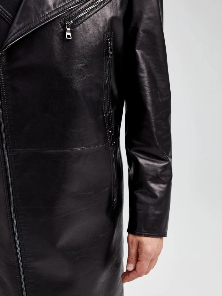 Мужской кожаный плащ в спортивном стиле с элементами классической куртки - косухи. Ассиметричная застежка-молния с боковыми и нагрудными карманами на молниях. Молнии украшают и втачные рукава. Комфортную свободу движений обеспечивает шлица внизу центрального шва спинки.