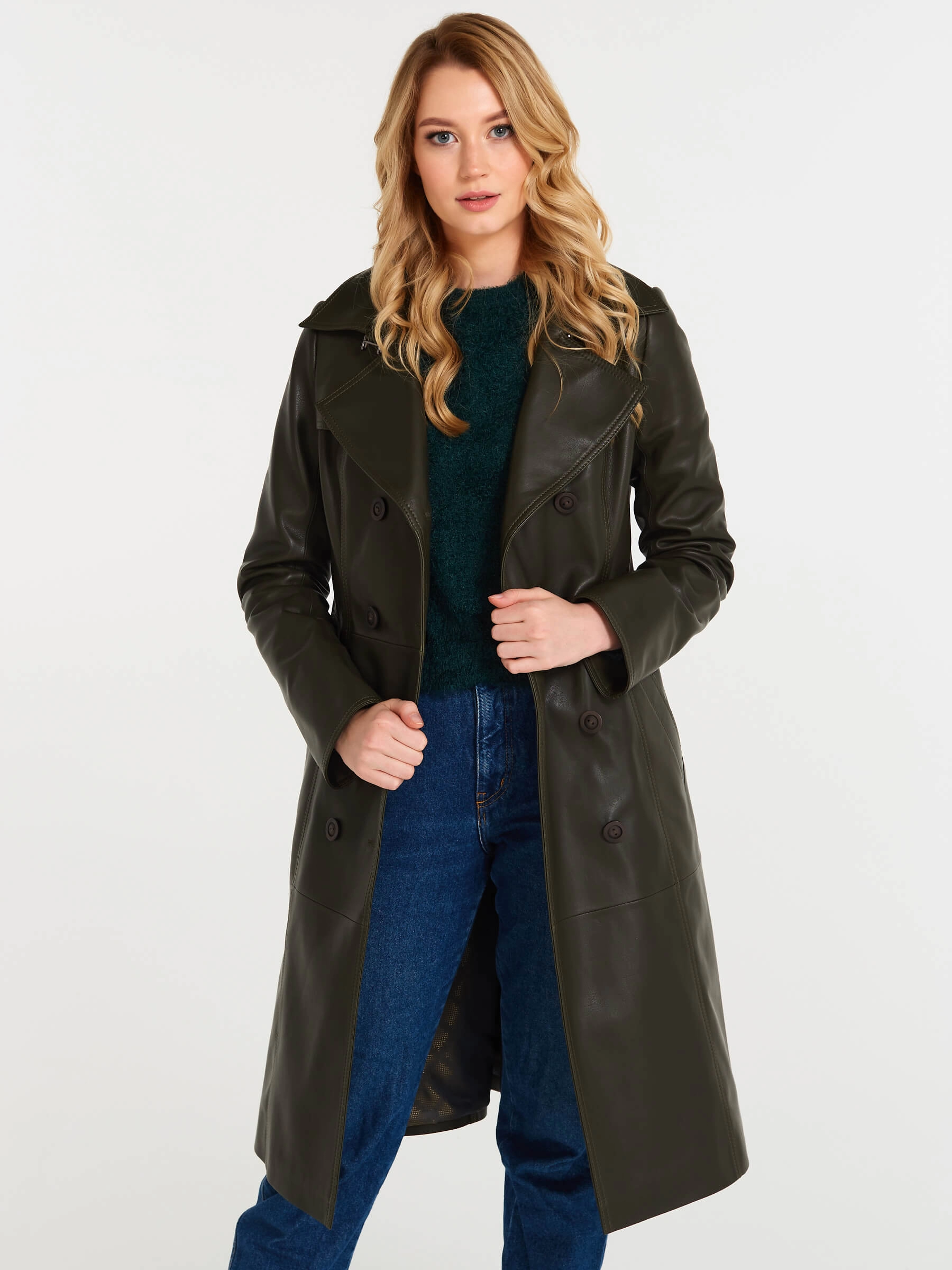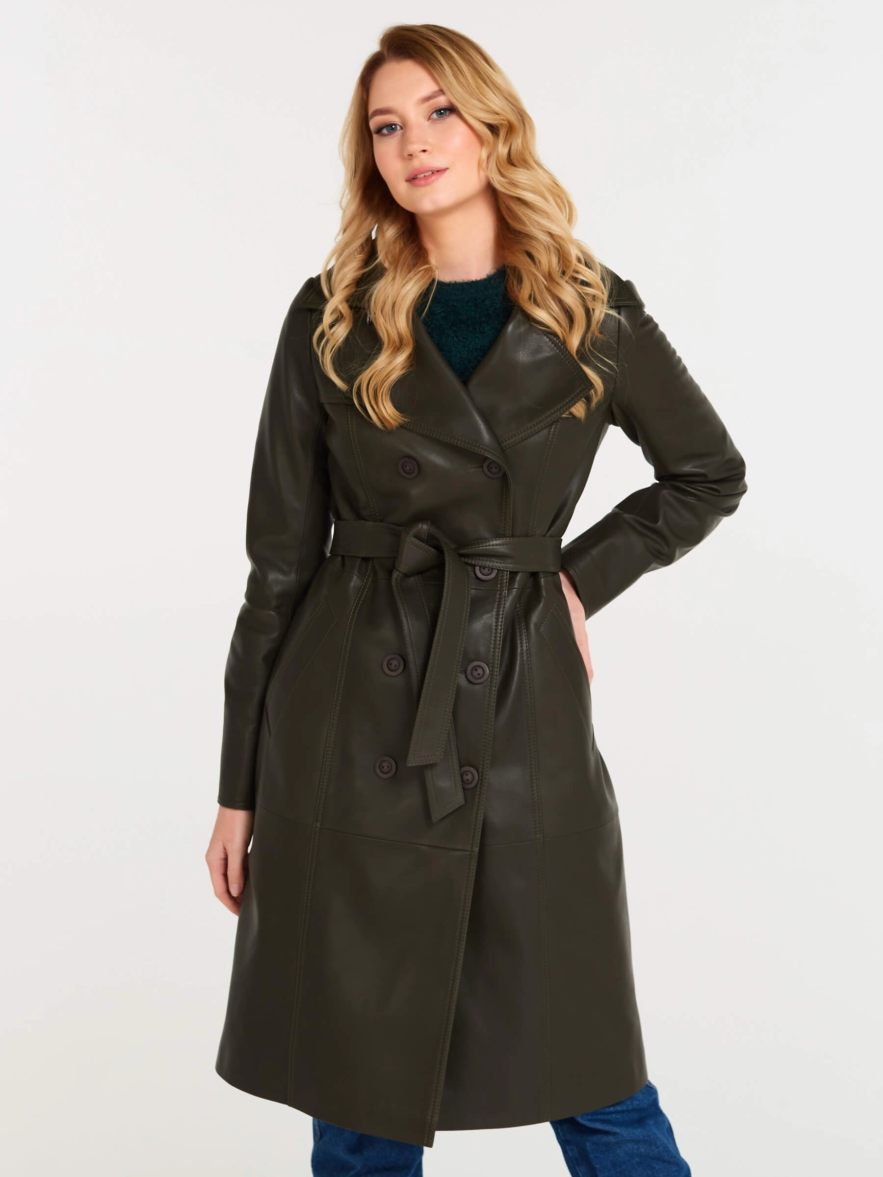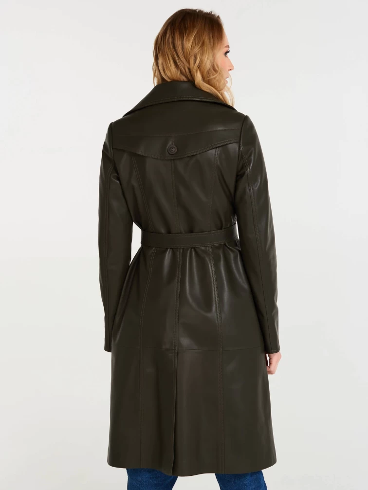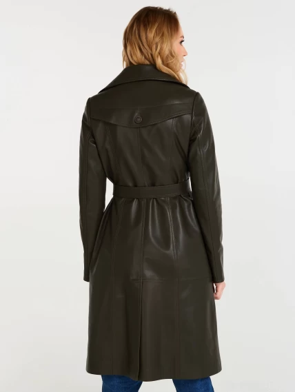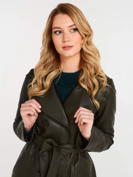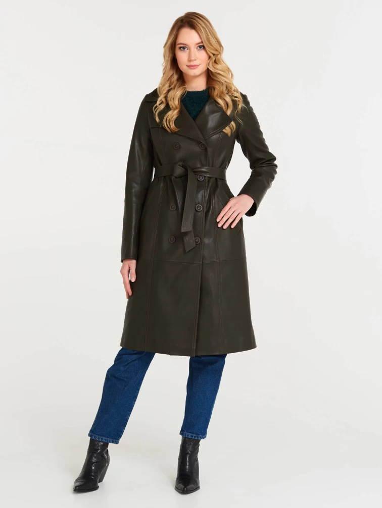 Кожаный двубортный женский плащ с поясом 3003, оливковый, размер 48, артикул 60551