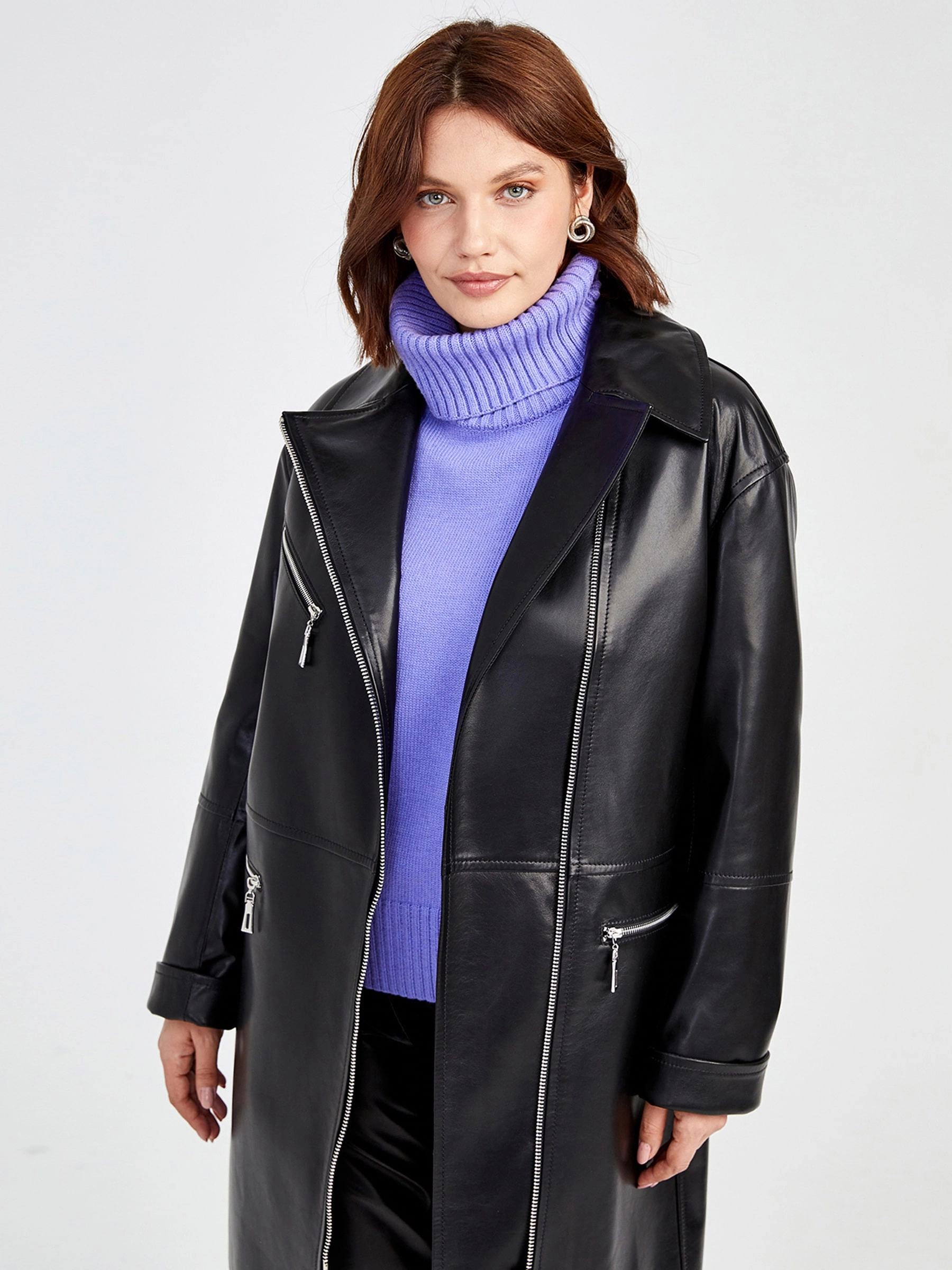 Товар кожаный женский плащ косуха оверсайз 3015, черный, размер 46, артикул 91610 выполнен из натуральной кожи с застежкой молния. Рассчитан на сезон: весна-лето. Длина изделия 97 см, силуэт свободный.