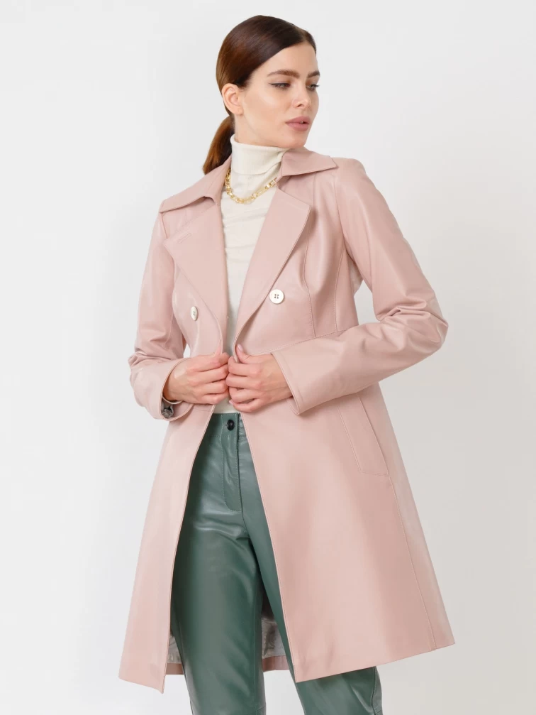 Товар кожаный двубортный женский плащ с поясом 338, пудровый, размер 44, артикул 90971 выполнен из натуральной кожи с застежкой пуговицы. Рассчитан на сезон: весна-лето. Длина изделия 95 см, силуэт приталенный .