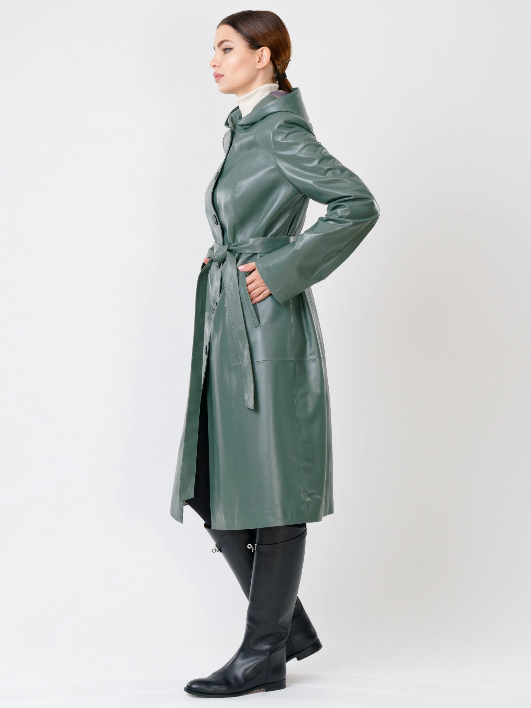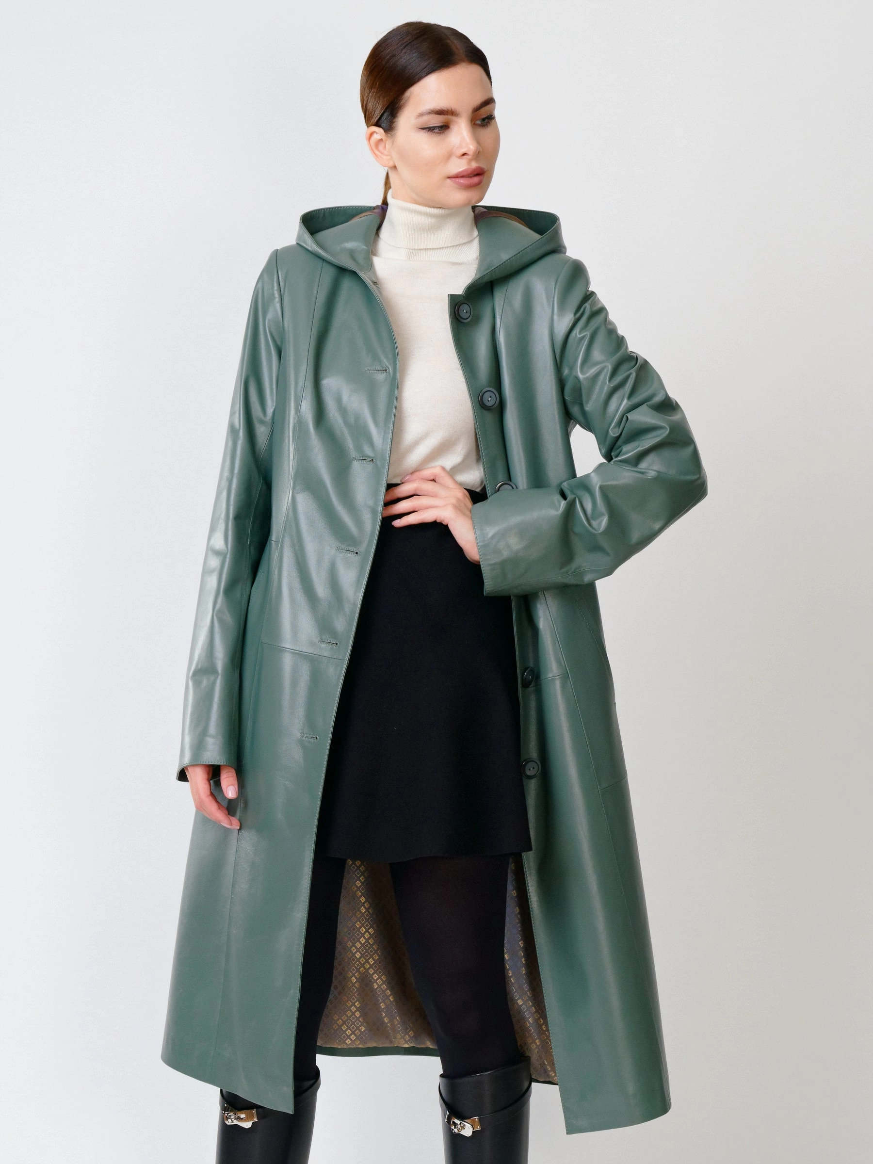 Кожаный женский утепленный плащ с капюшоном 380нш, размер 50, оливковый, артикул 91391