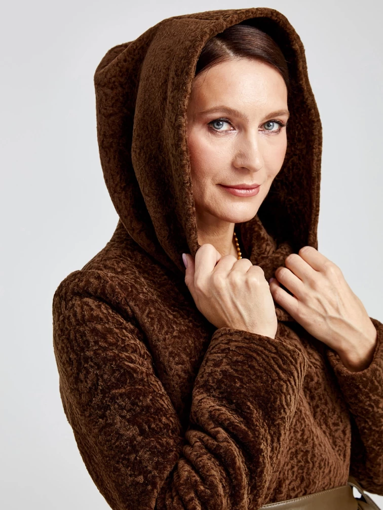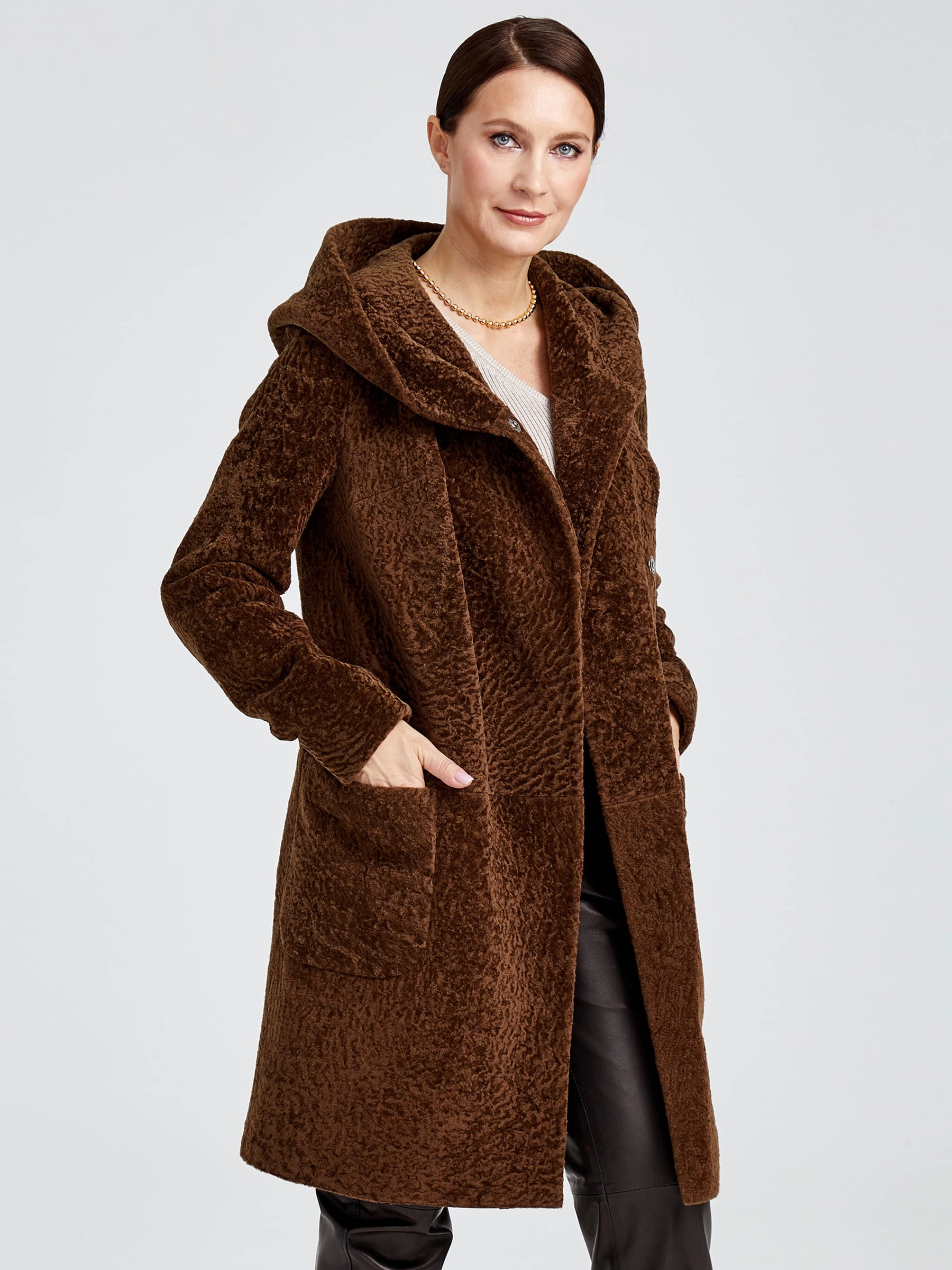 Дубленка с капюшоном из астрагана для женщин 32мех, горчичная, размер 44, артикул 62350