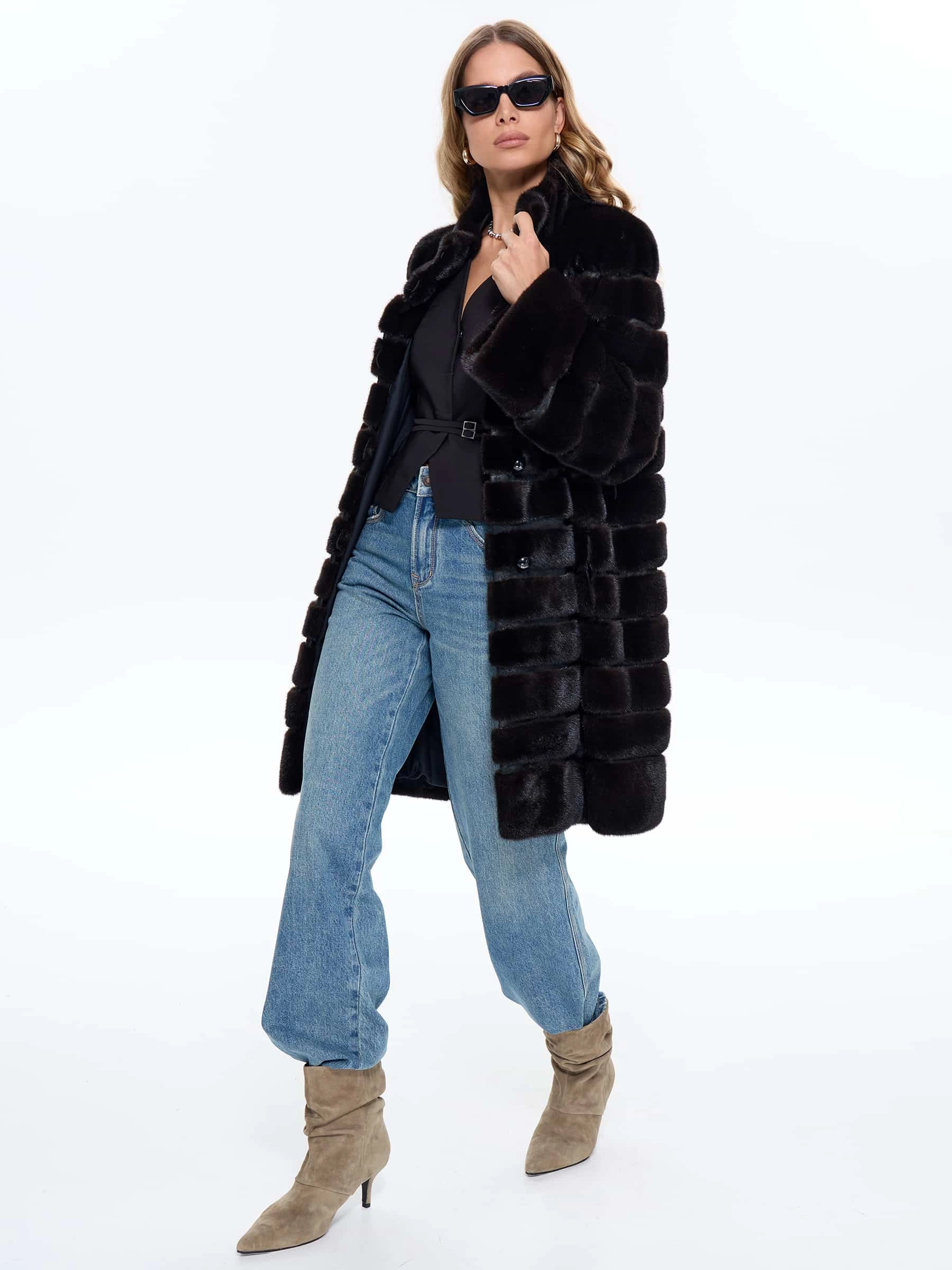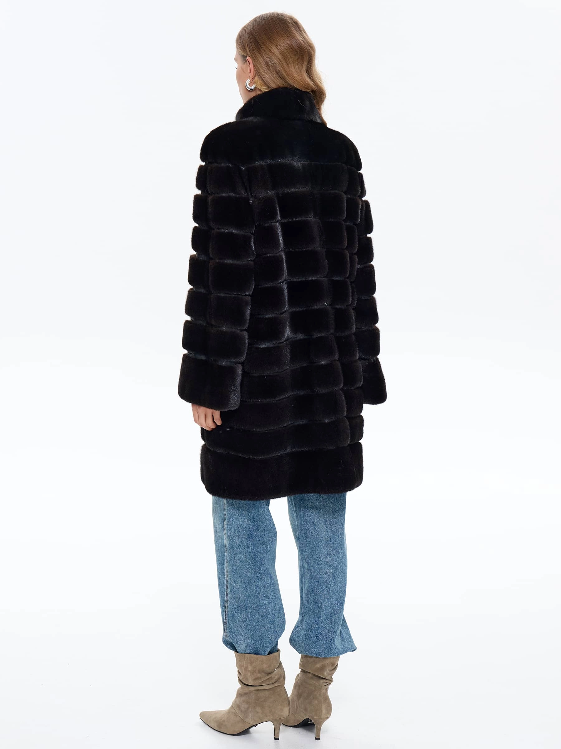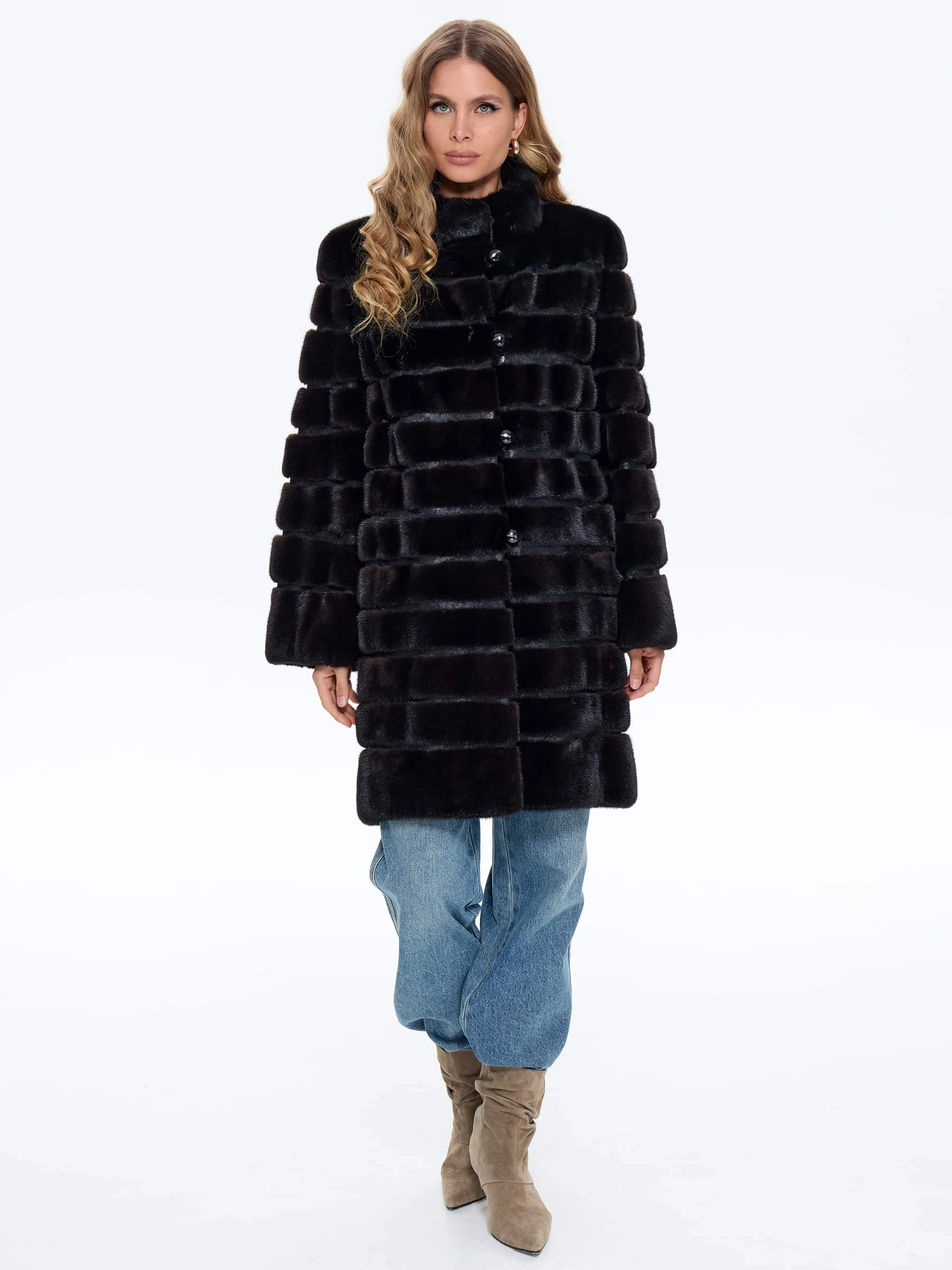 Женская шуба BRASCHI из натурального меха норки выполнена по уникальной технологии поперечной укладки меха, представленная в классическом прямом силуэте универсальной длины миди около 90 см. Поперечное расположение шкурок создает эффектный пледовый рисунок, обеспечивая невероятную мягкость, пластичность и роскошный объем. Модель оснащена строгим вертикальным воротником-стойкой без капюшона, а отсутствие декоративной отделки подчеркивает красоту натурального меха. Шуба застегивается на крупные пуговицы и имеет комфортную вискозную подкладку, выполненная в глубоком теплом оттенке мокко, который особенно выигрышно сочетается с уникальной поперечной укладкой меха, что делает ее идеальным выбором для холодной зимы.