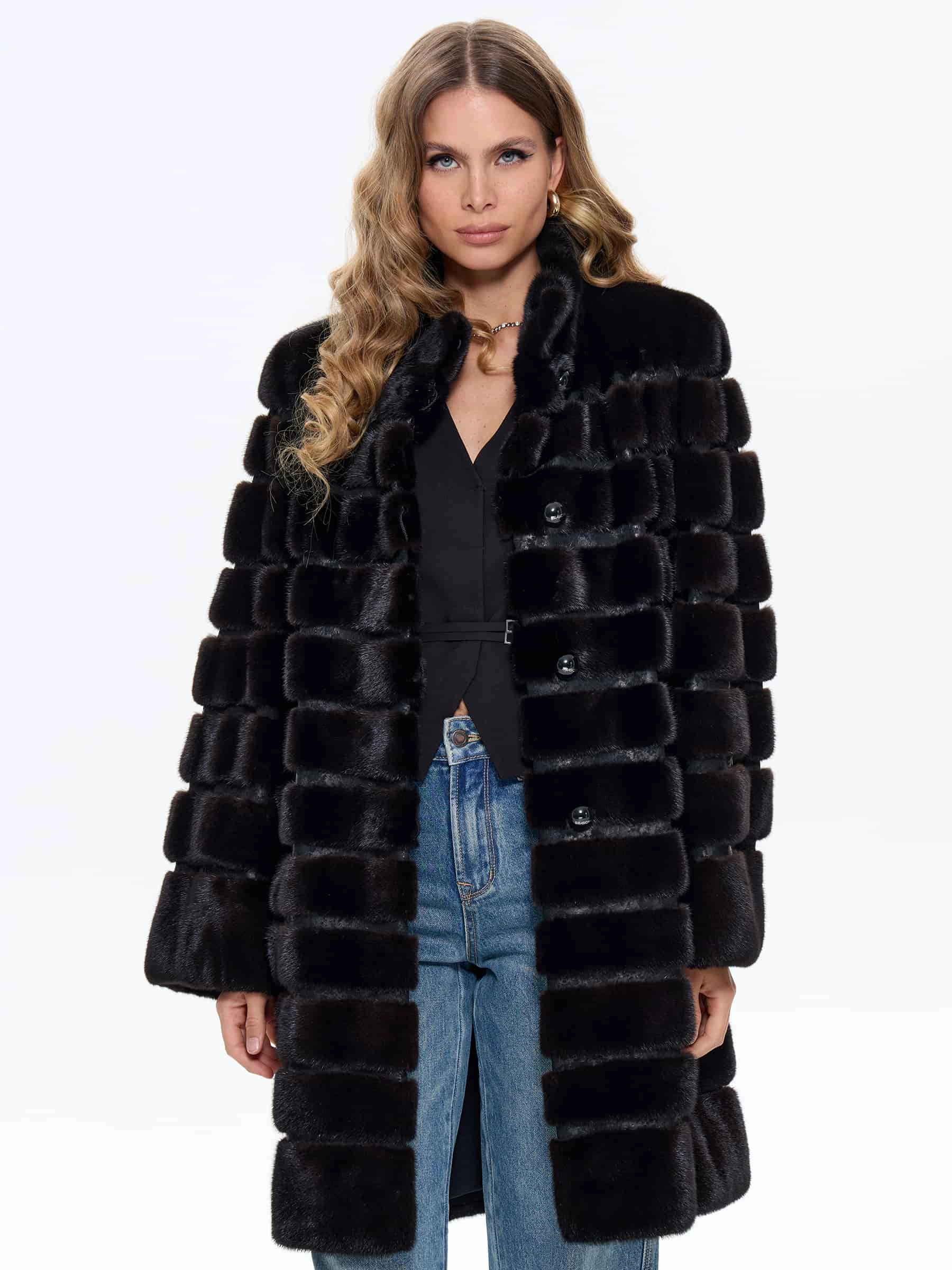 Поперечная женская шуба из меха норки BRASCHI ELM 047, черная, размер 46, артикул 34430