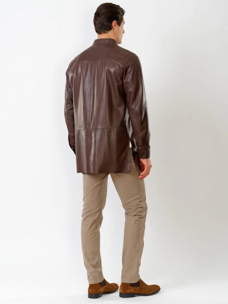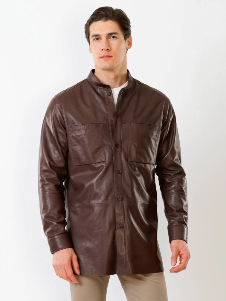 Товар рубашка из натуральной кожи премиум класса для мужчин 01, коричневая, размер 48, артикул 130010 выполнен из натуральной кожи с застежкой пуговицы. Рассчитан на сезон: демисезон. Длина изделия 85 см, силуэт прямой.