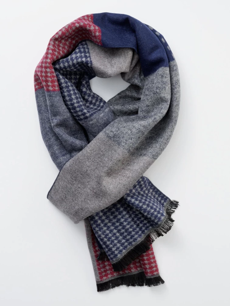 Длинный, широкий шарф выполненный из нежного кашемира в паре с экологически чистым и современным материалом Modal. Модель выглядит динамично за счет широких квадратных вставок разного цвета. Аксессуар не только защитит шею от холода и ветра, но и дополнит Ваш образ.