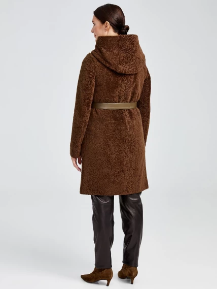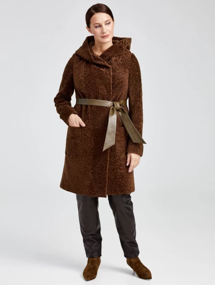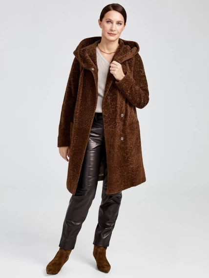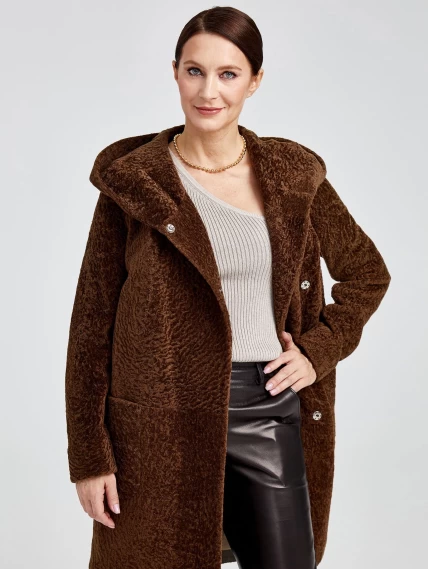 Длинная женская шуба из астрагана с капюшоном 32мех, горчичная, размер 44, артикул 13550