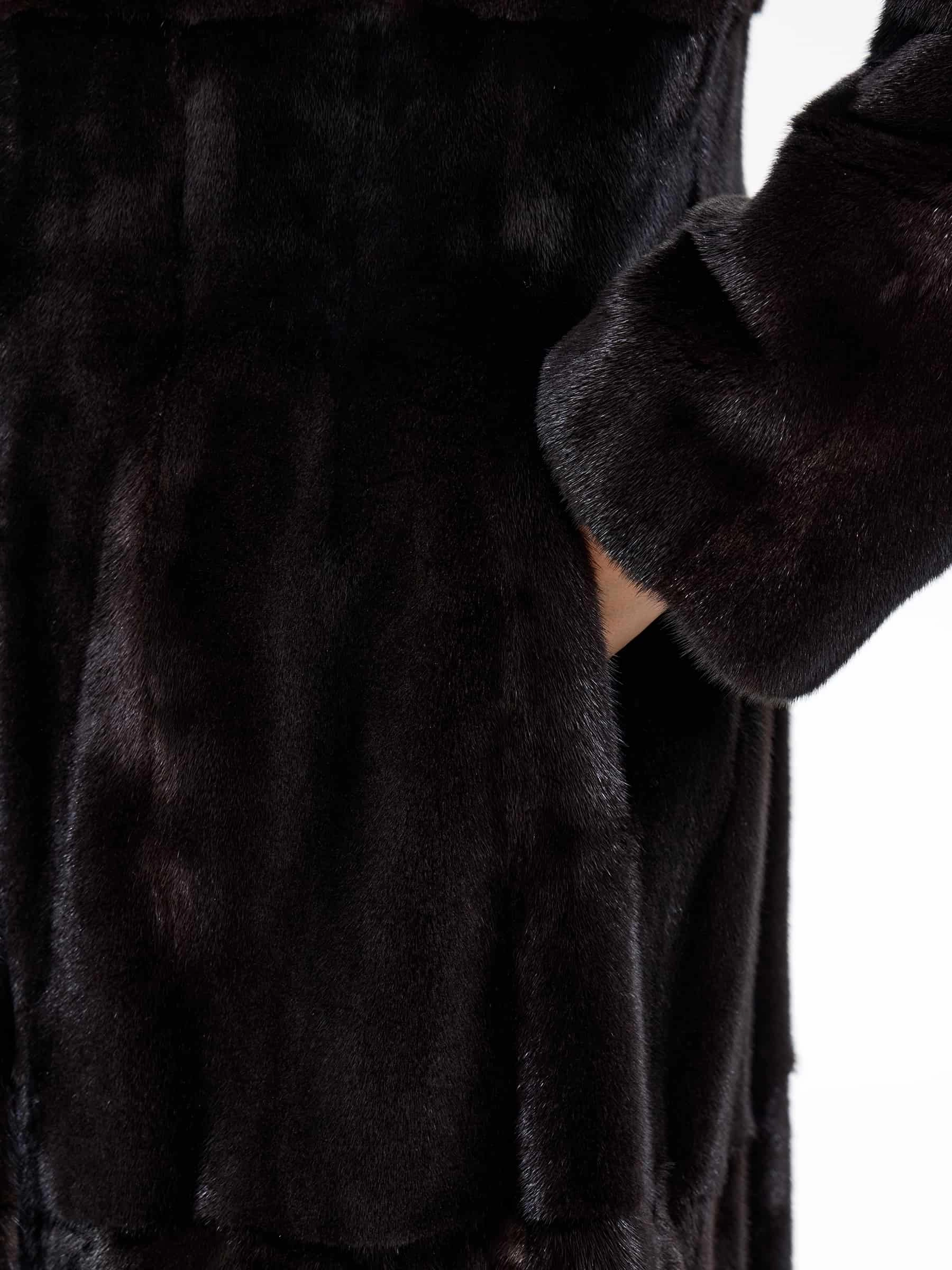 Для пошива длинной классической шубы мастера использовали нежный густой мех норки глубокого черного цвета. Полуприлегающий крой с анатомическими вытачками в талии подчеркивает силуэт, не стягивая фигуру, и дополнен двумя боковыми карманами. Строгая шалевидная стойка обеспечивает защиту в ветреную погоду, а свободный крой от бедра мягко маскирует особенности фигуры. Изделие отлично сохраняет тепло в зимние морозы. Застёжка выполнена на невидимых клипсах с прочным титановым покрытием.
