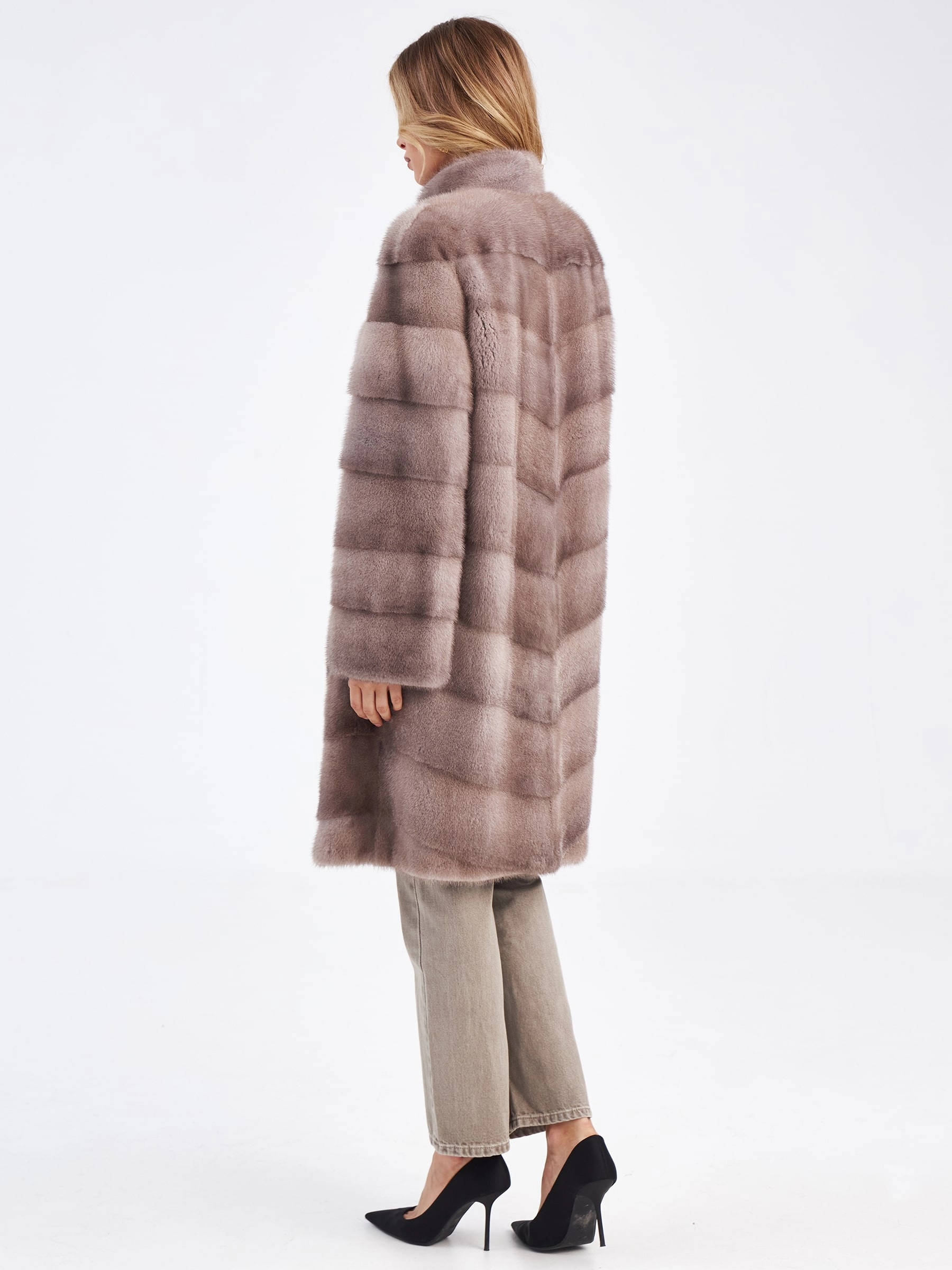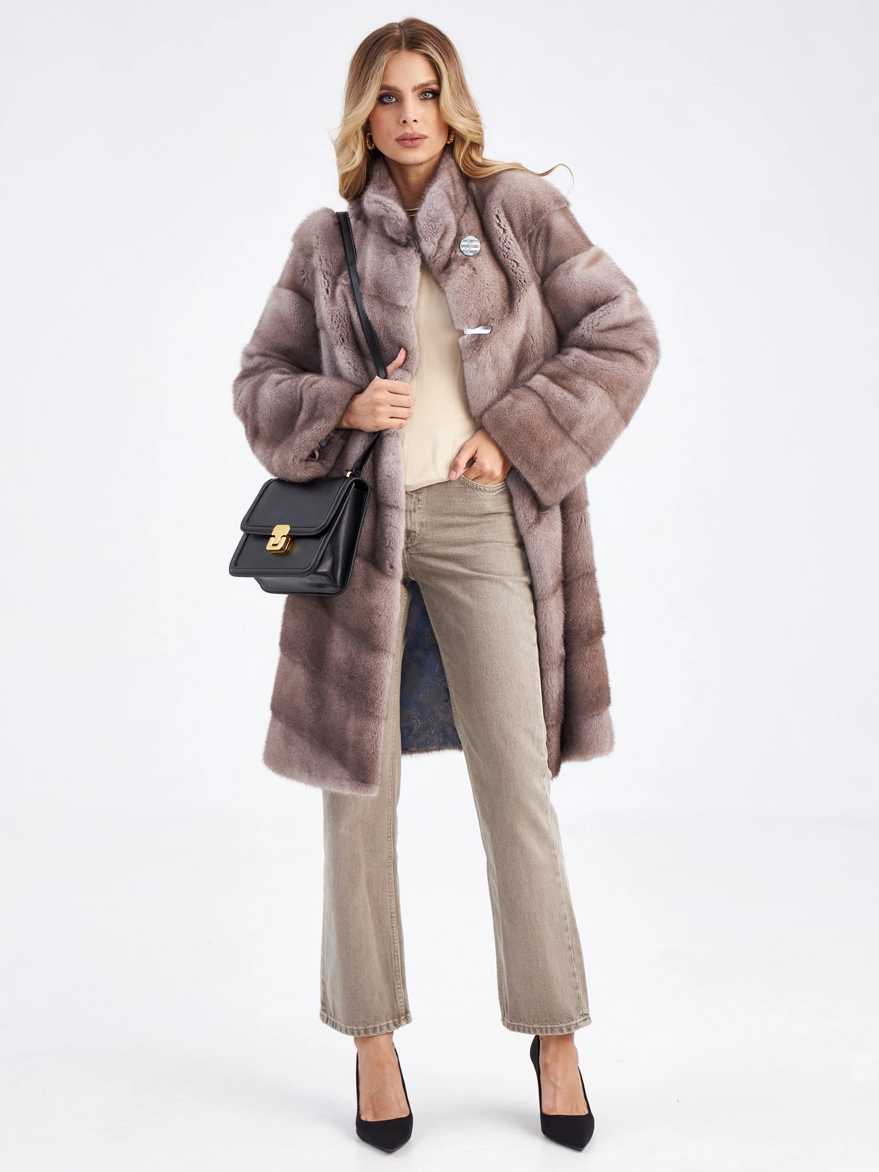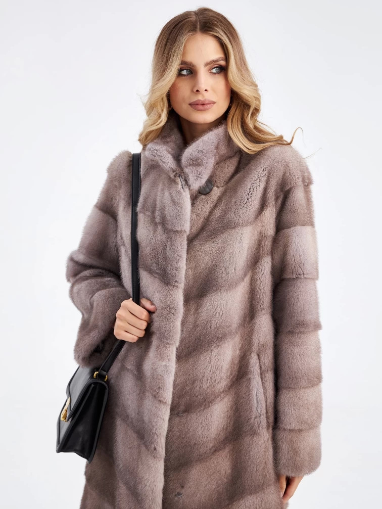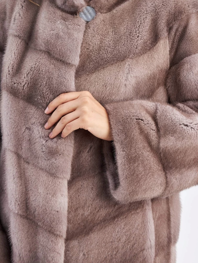 Удобное и комфортное шуба из нежной низковорсовой норки в цвете сергол станет отличным решением для холодной зимы. Прямой крой, горизонтальная раскладка меха. Воротник-стойка. Изделие получилось теплым и легким.