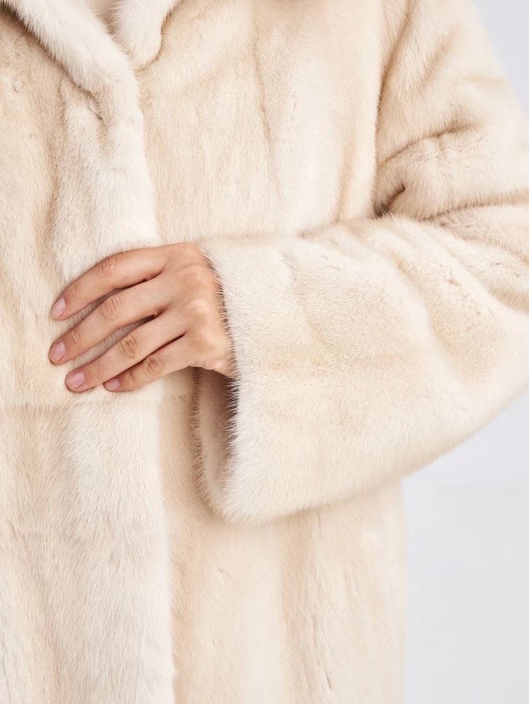 Товар длинная норковая шуба с капюшоном для женщин премиум класса марина(к), жемчужная, размер 56, артикул 33750 выполнен из норка с застежкой клипсы. Рассчитан на сезон: зима. Длина изделия 110 см, силуэт трапеция.