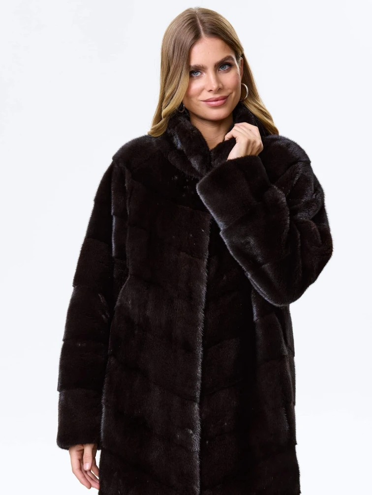 Для пошива модели с воротником - стойка использовали густой шелковистый мех норки. Прямой крой, диагональная раскладка меха, застежка- клипсы. Простое и одновременно элегантное изделие подчеркнет не только вашу женственность, но и согреет в суровые морозы.