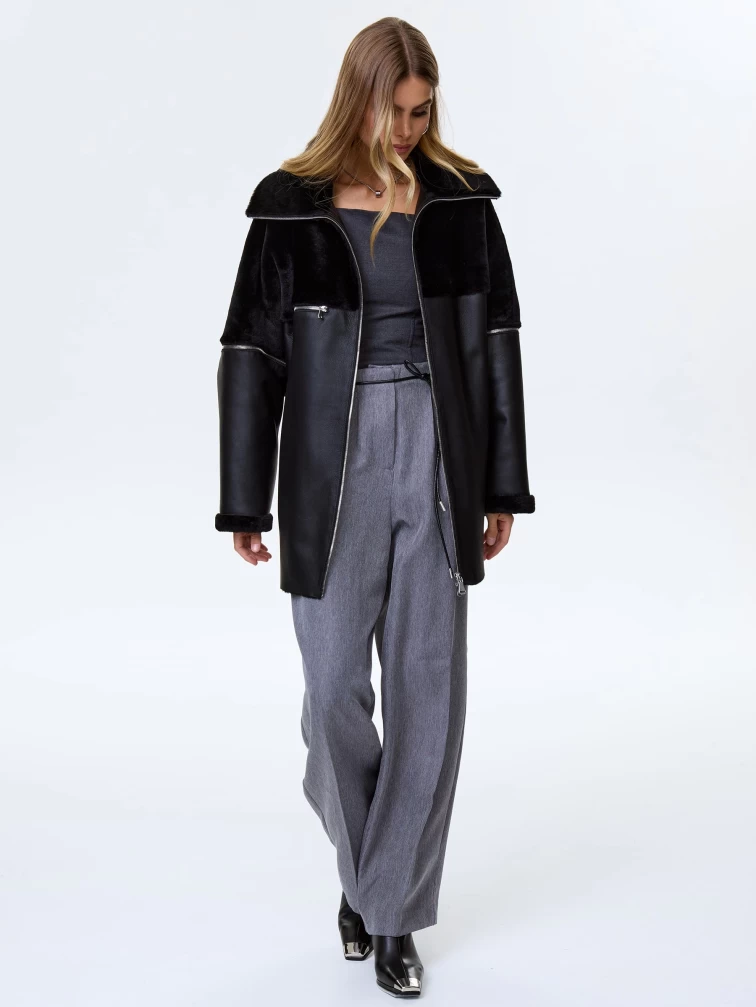 Стильное женское полупальто из натуральной овчины премиум класса 2051, черное, размер 48, артикул 64380