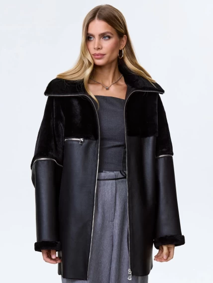 Товар стильное женское полупальто из натуральной овчины премиум класса 2051, черное, размер 48, артикул 64380 выполнен из овчина "мерино" с застежкой молния. Рассчитан на сезон: осень-зима. Длина изделия 80 см, силуэт свободный.