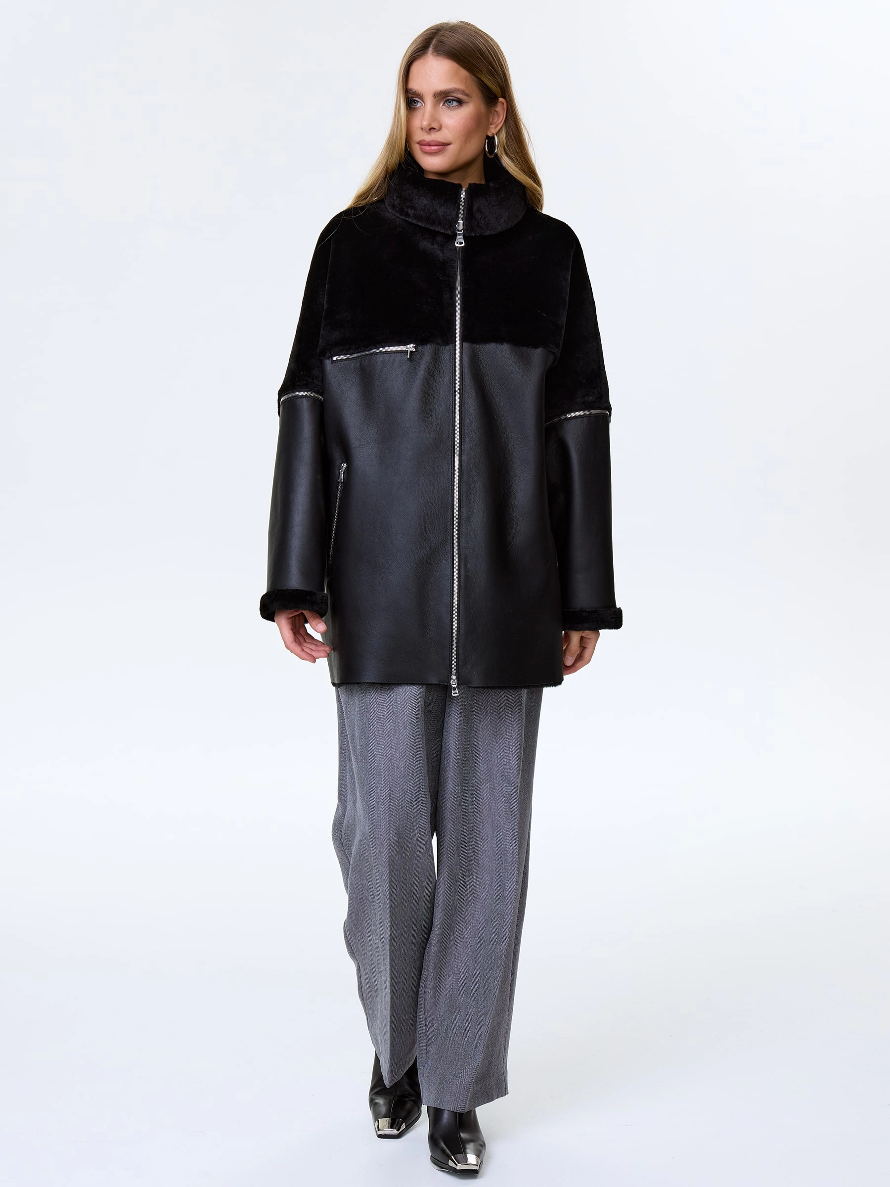 Это полупальто выполнили из натуральной стриженной овчины. Свободный крой, высокий воротник-стойка легко трансформируется в отложной. Изменить модель можно при помощи отстегивающихся рукавов. Карманы как и само изделие застегиваются молниями.