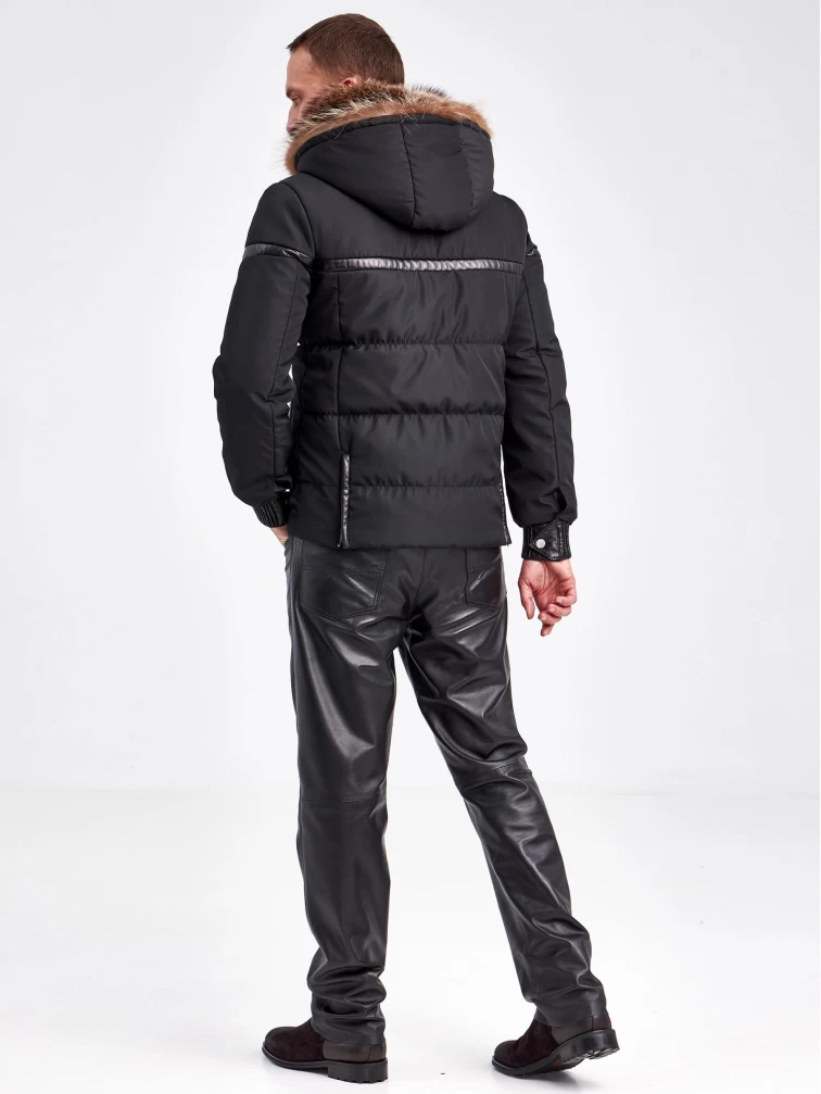 Текстильный зимний мужской пуховик с капюшоном и отделкой меха енота 5468, черный, размер 46, артикул 40870