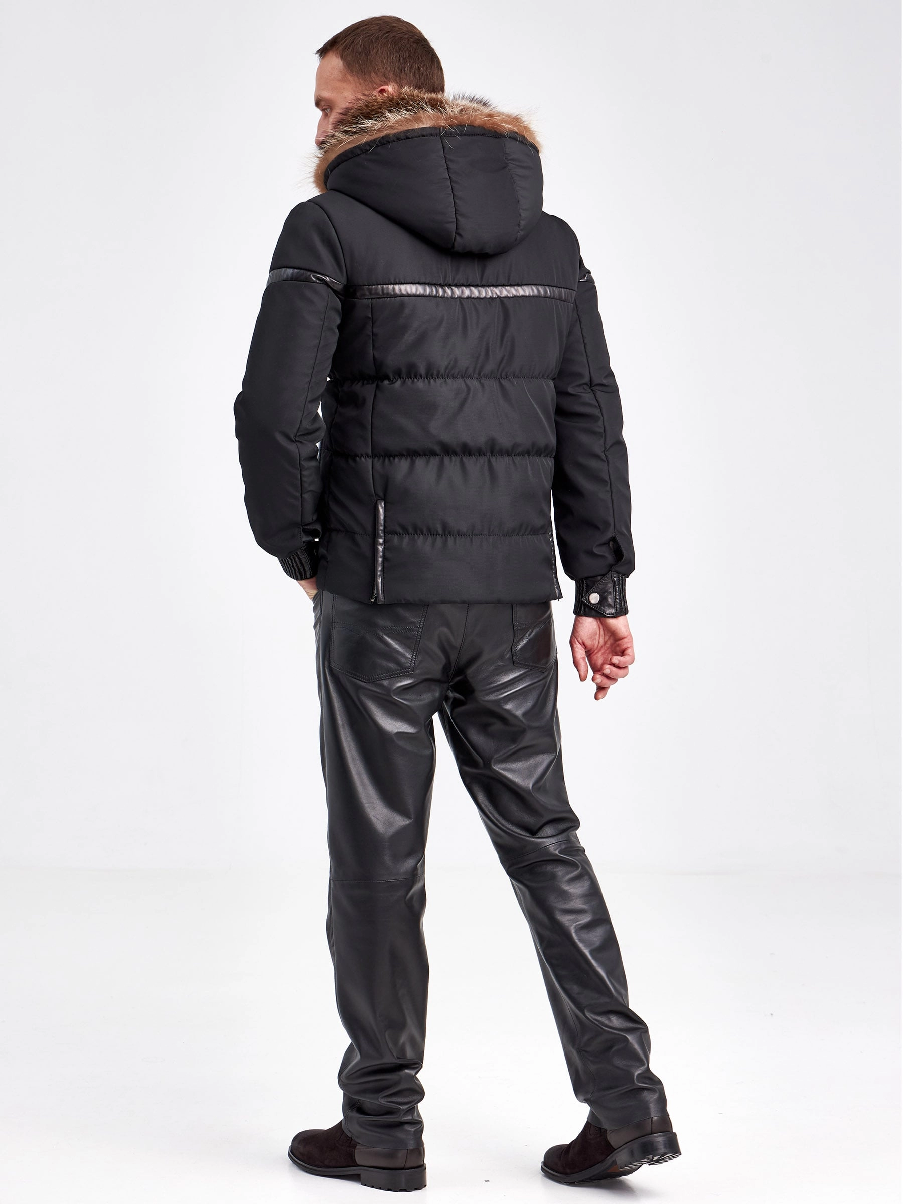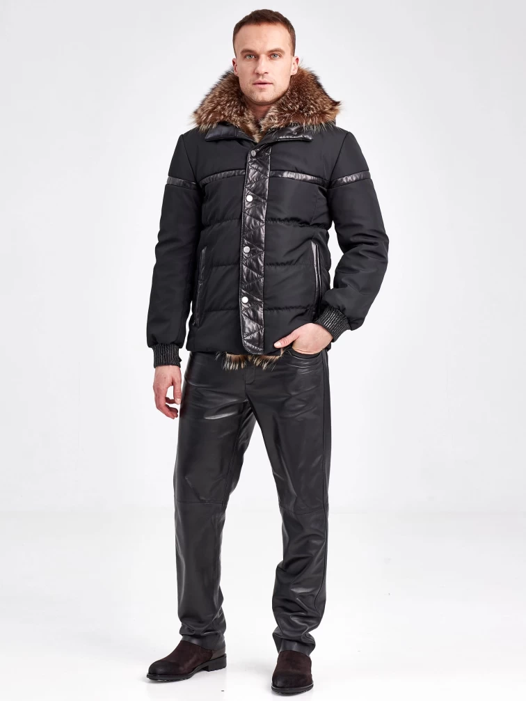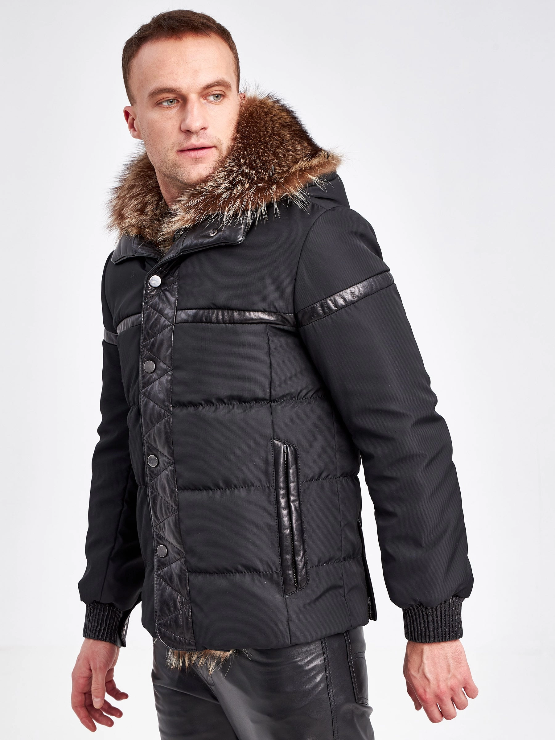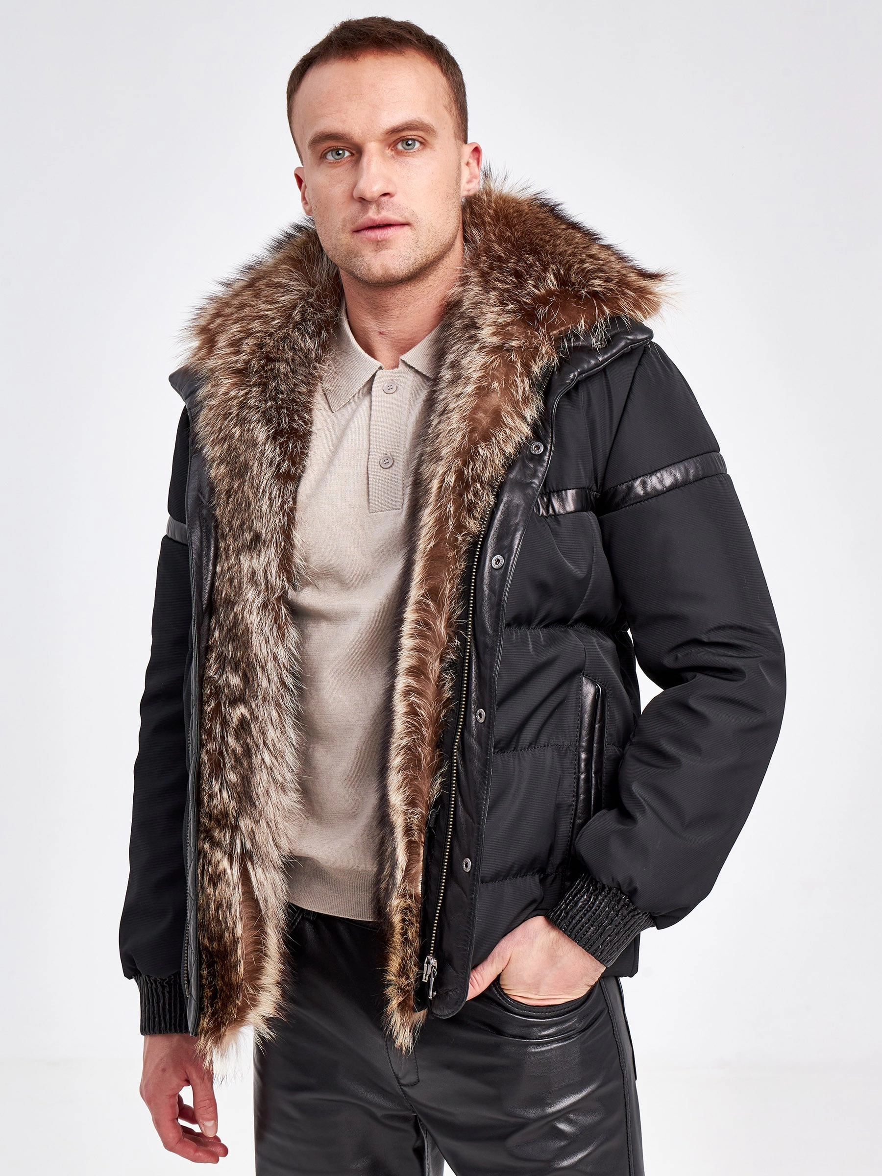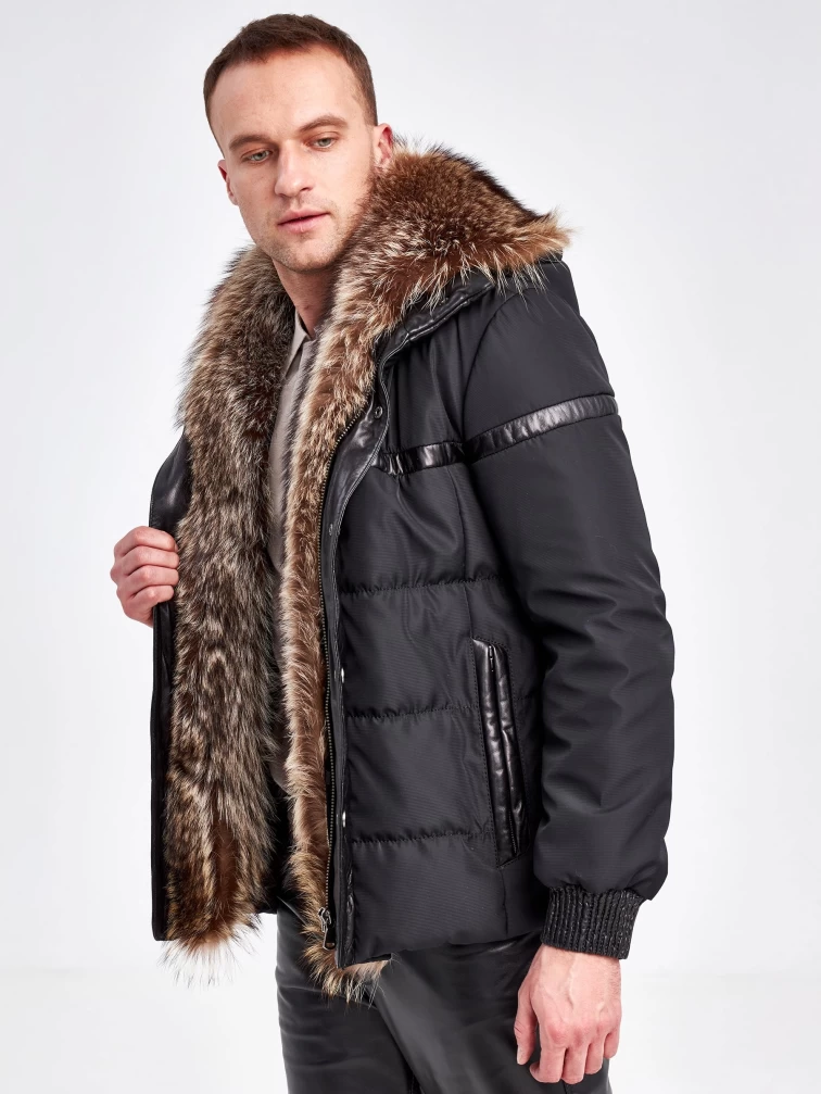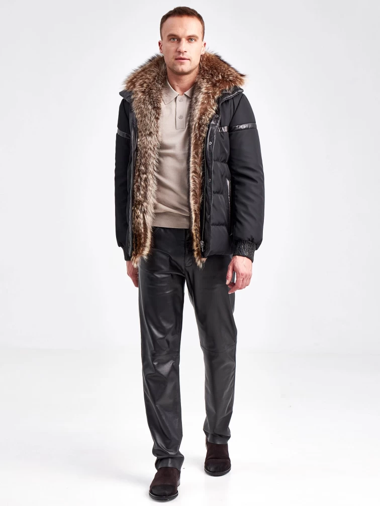 Куртка мужская премиального качества из мембранной ткани с отделками из натуральной кожи, большим сьемным енотовым капюшоном и отделкой мехом серебристого енота на передней планке.