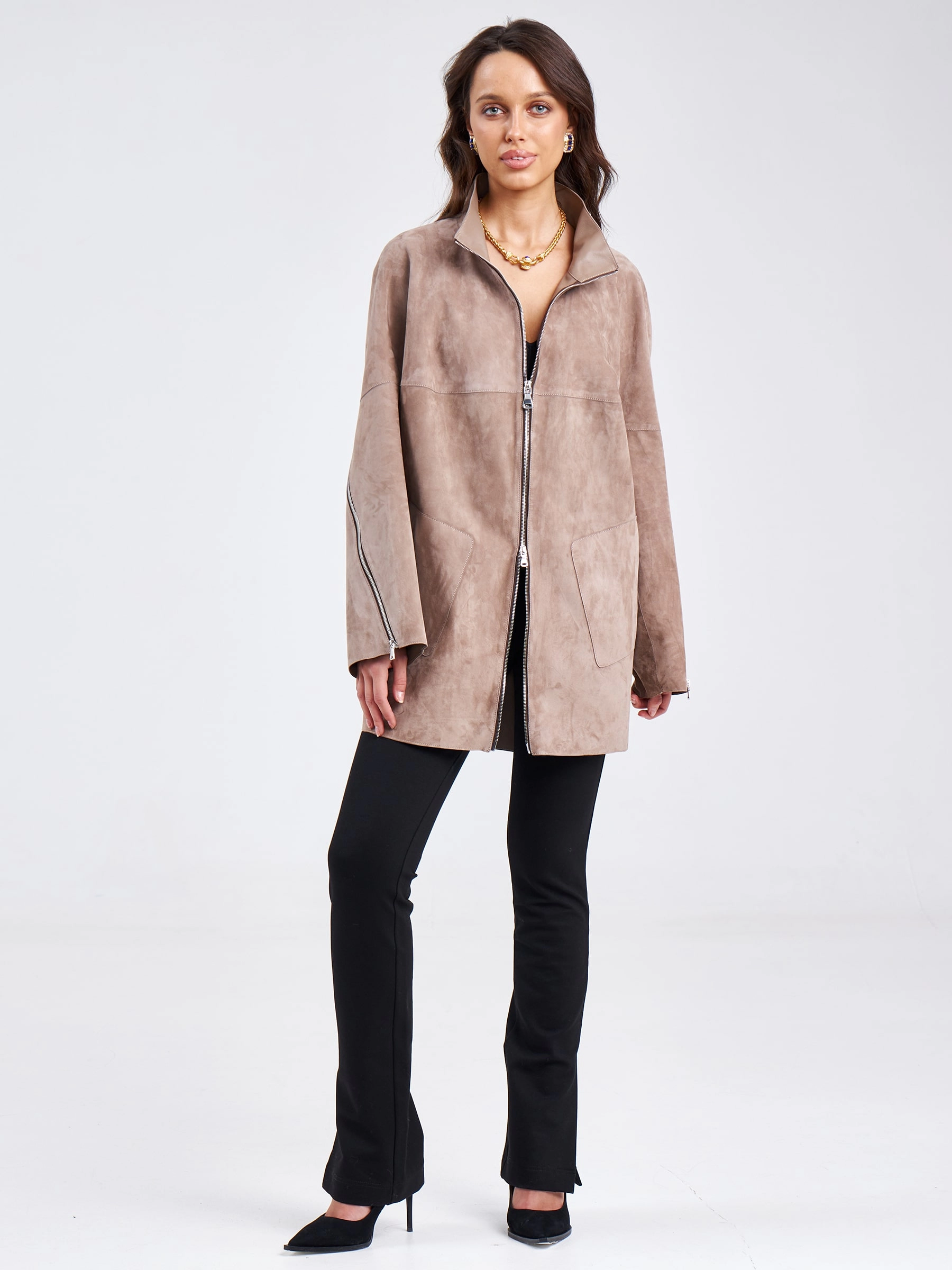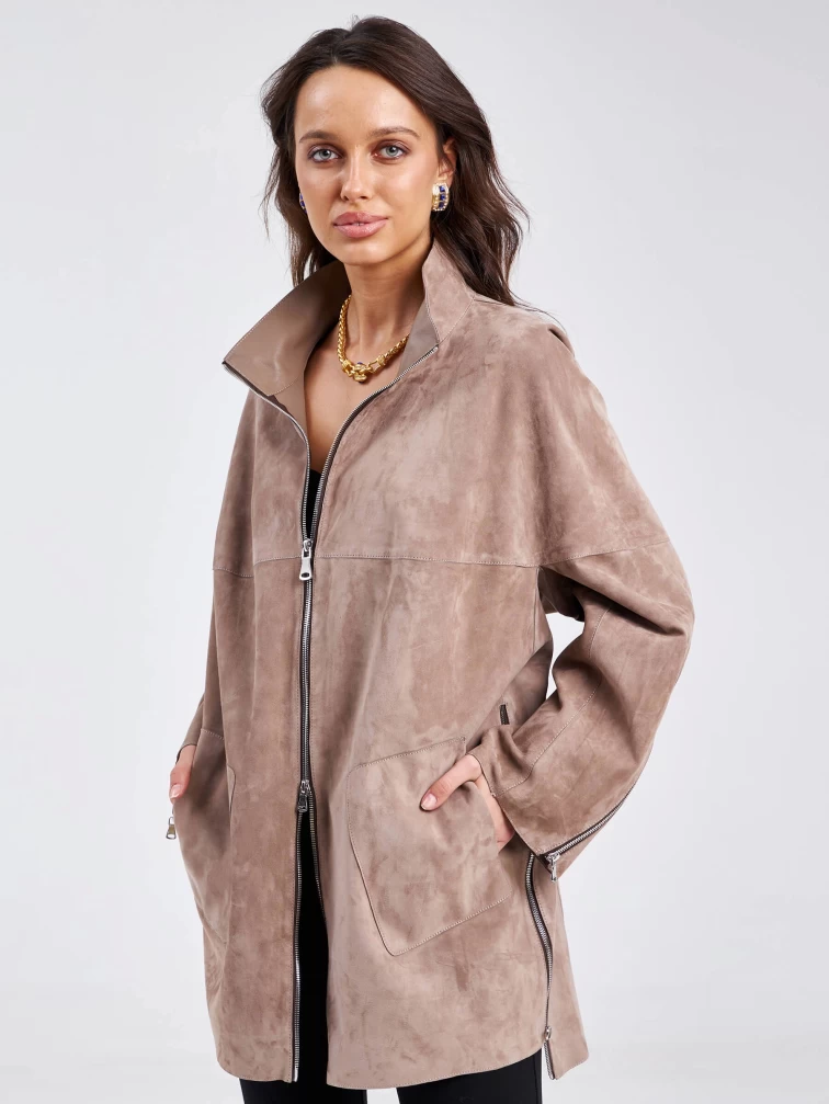 Товар замшевая женская куртка оверсайз премиум класса 3037, светло-коричневая, размер 46, артикул 23160 выполнен из натуральной замши с застежкой молния. Рассчитан на сезон: весна-лето. Длина изделия 84 см, силуэт свободный.