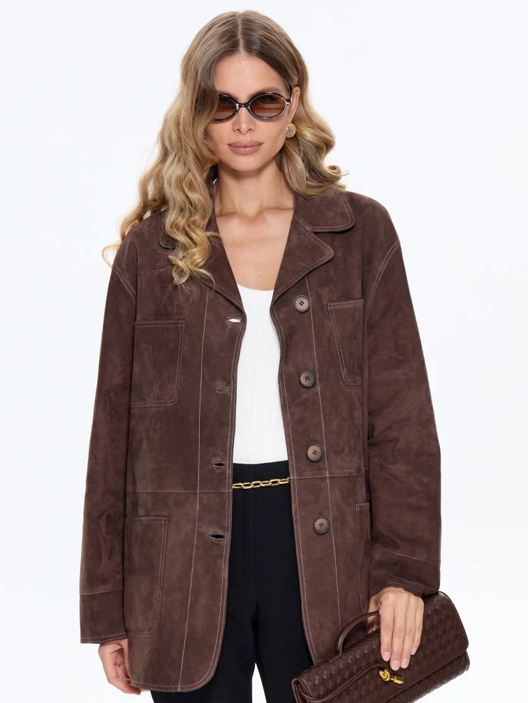 Пиджак с английским воротником выполнен из светло-коричневой замши с контрастной отстрочкой премиум-класса. Прямой силуэт изделия комфортно сидит по фигуре, не сковывая движений. Застёжка на пуговицы. Модель дополнена четырьмя накладными карманами.