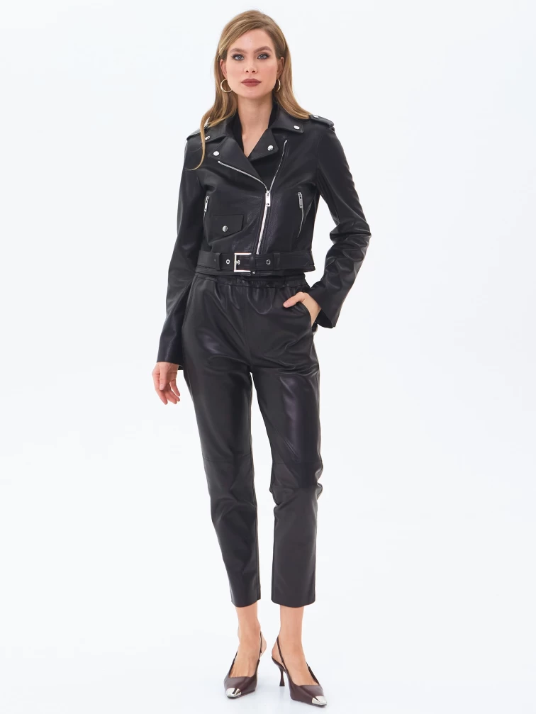 Товар женская кожаная куртка косуха с поясом премиум класса 3080, черная, размер 42, артикул 24540 выполнен из натуральной кожи с застежкой молния. Рассчитан на сезон: весна-лето. Длина изделия 46 см, силуэт прямой.