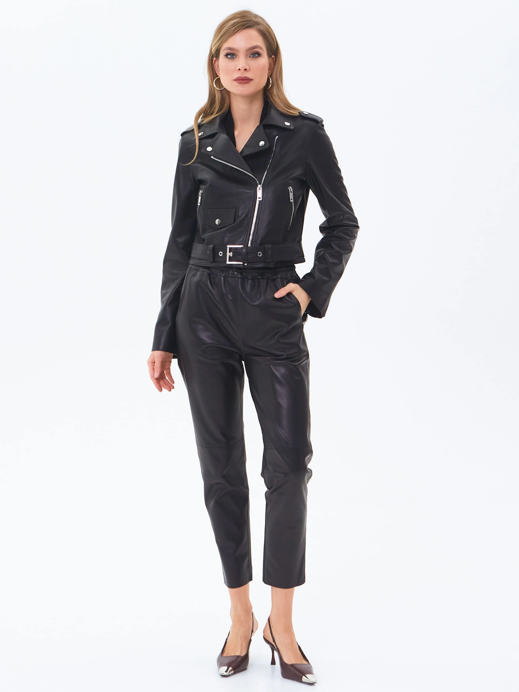 Женская кожаная куртка косуха с поясом премиум класса 3080, черная, размер 42, артикул 24540