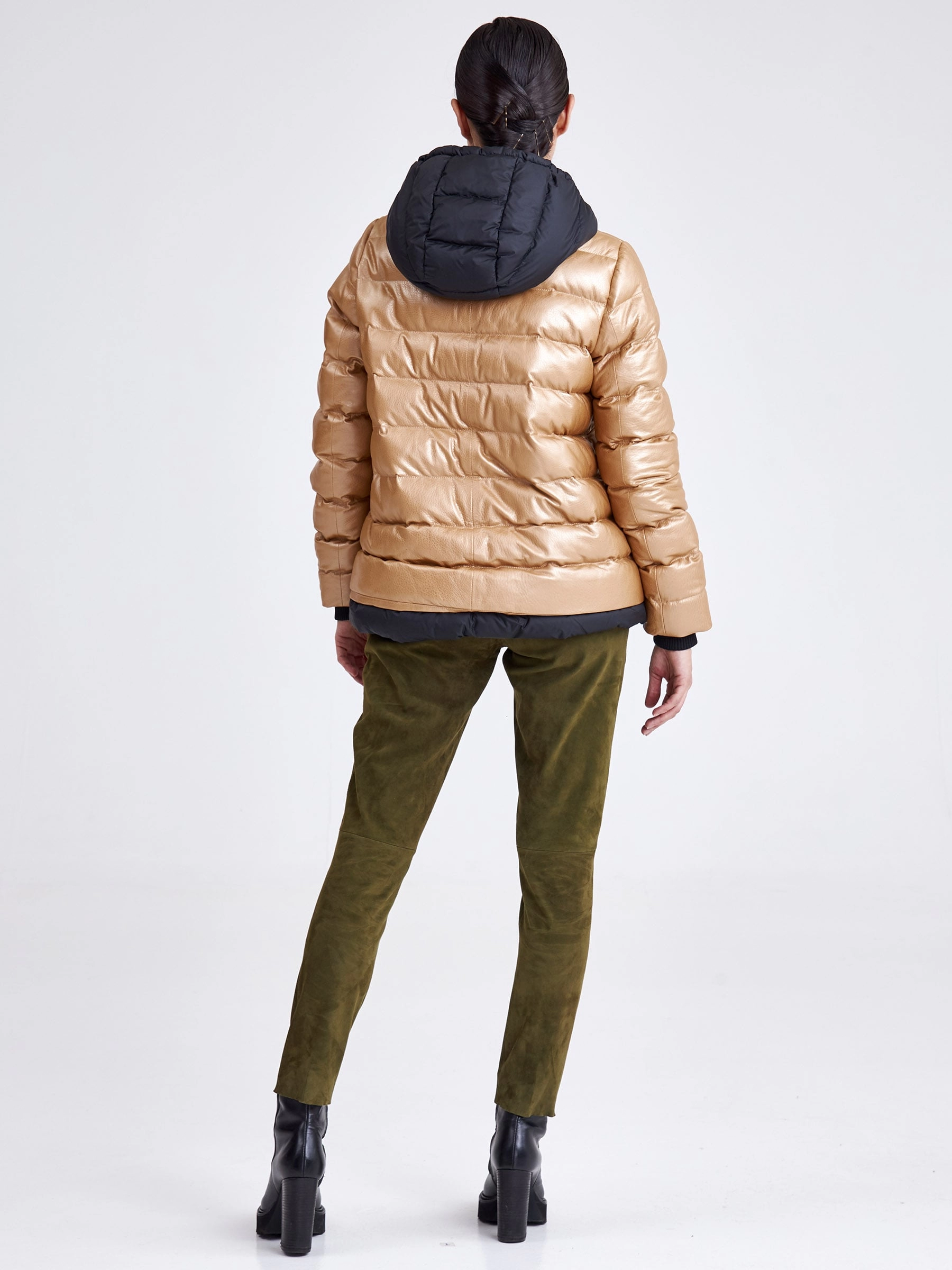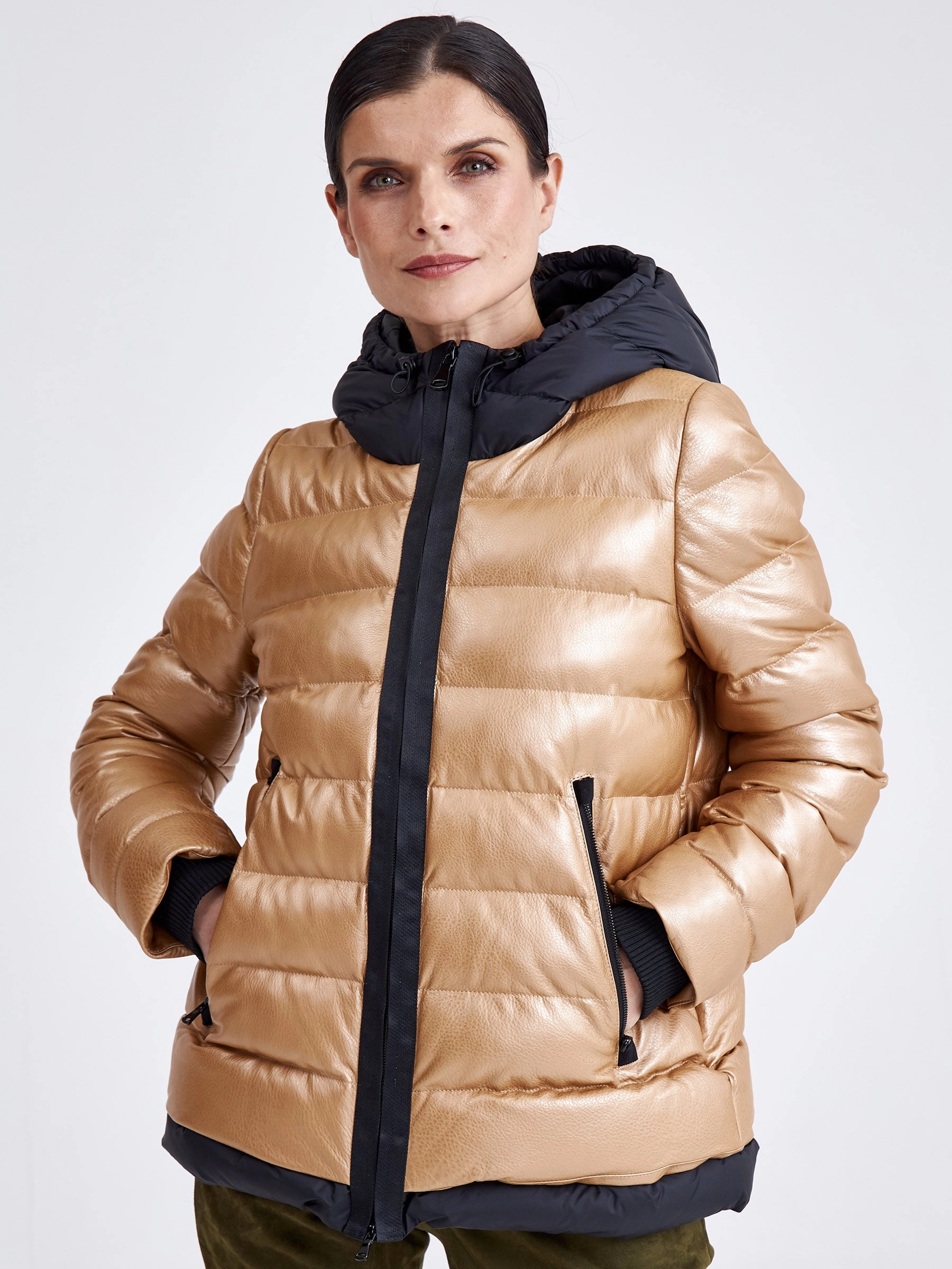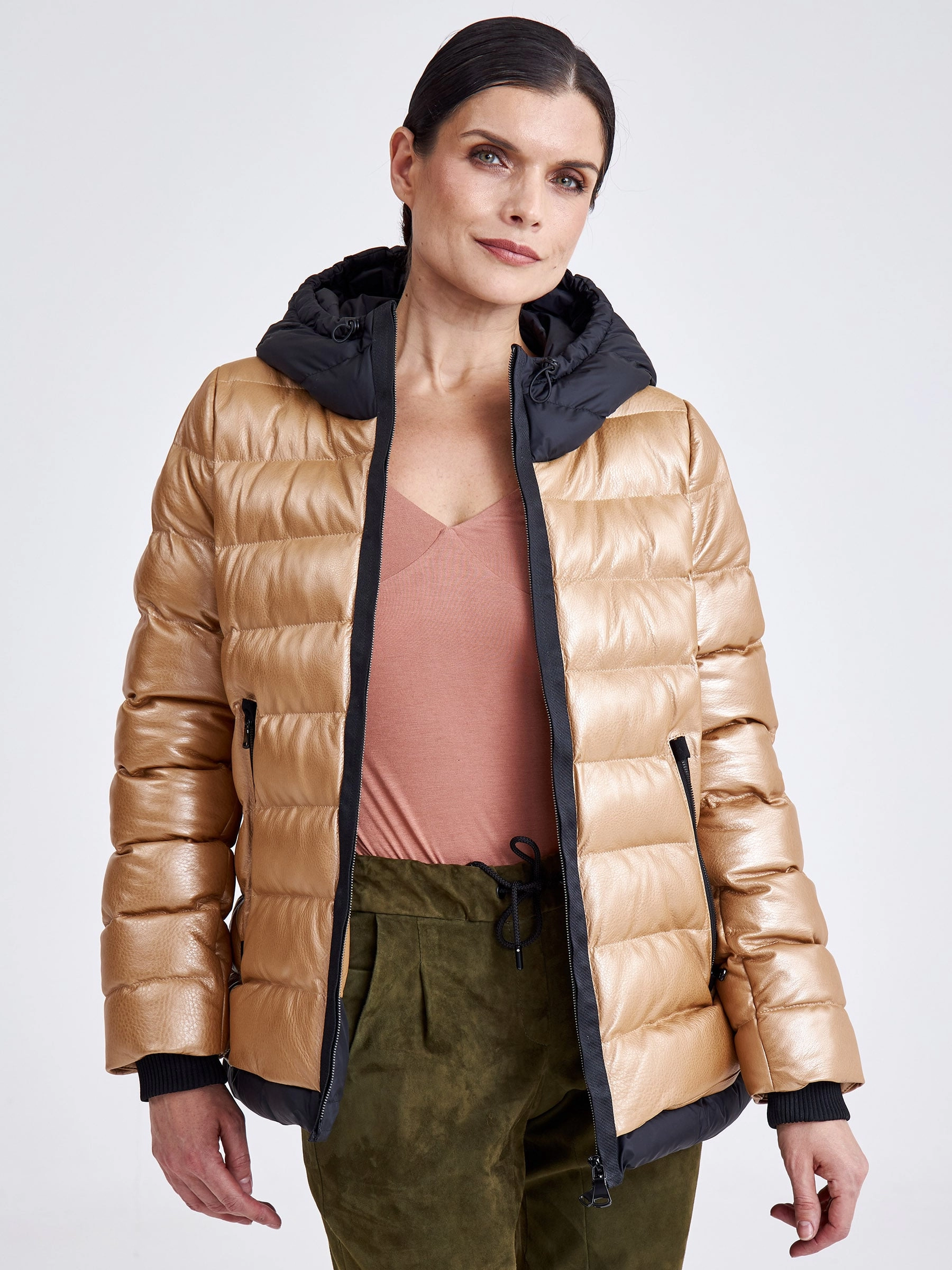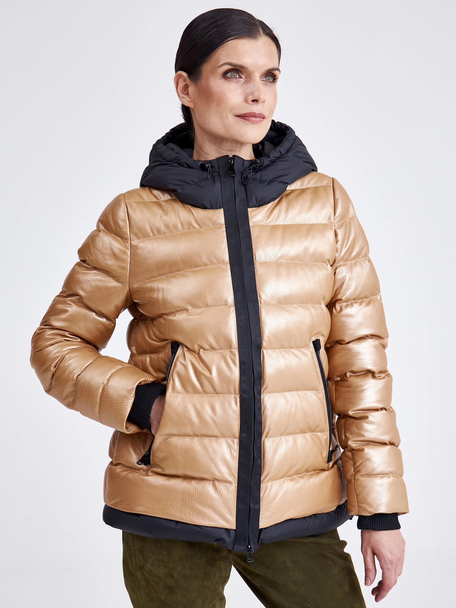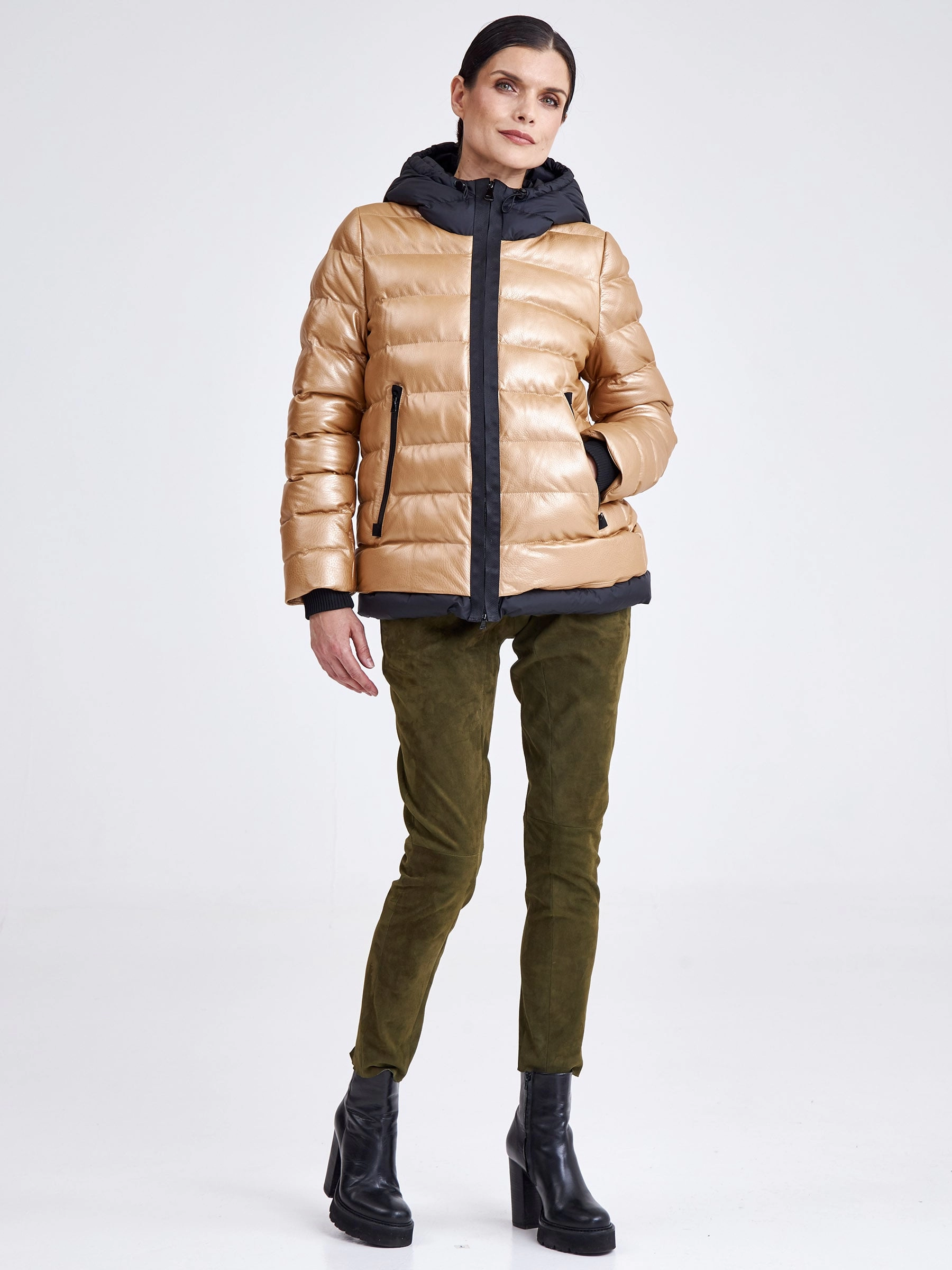 Утепленная короткая кожаная куртка в теплом бежевом цвете из натуральной коже в тандеме с черной водоотталкивающей тканью. Глубокий капюшон, позволяет обойтись без головного убора в ненастную погоду. Утеплитель - немецкий синтепон Френденберг. Отличная теплоизоляция, превосходная парапроницаемость, простой уход.