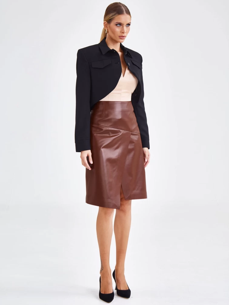 Элегантная юбка-миди из натуральной кожи табачного оттенка покоряет прямым силуэтом и дерзкой асимметрией подола. Задняя потайная молния обеспечивает чистые линии, а высокий разрез спереди добавляет динамики, заменяя традиционную шлицу. Эта универсальная и женственная вещь станет основой стильных образов: сочетайте ее с легкими блузами, массивными свитерами или кожаными жакетами для создания неповторимого лука.
