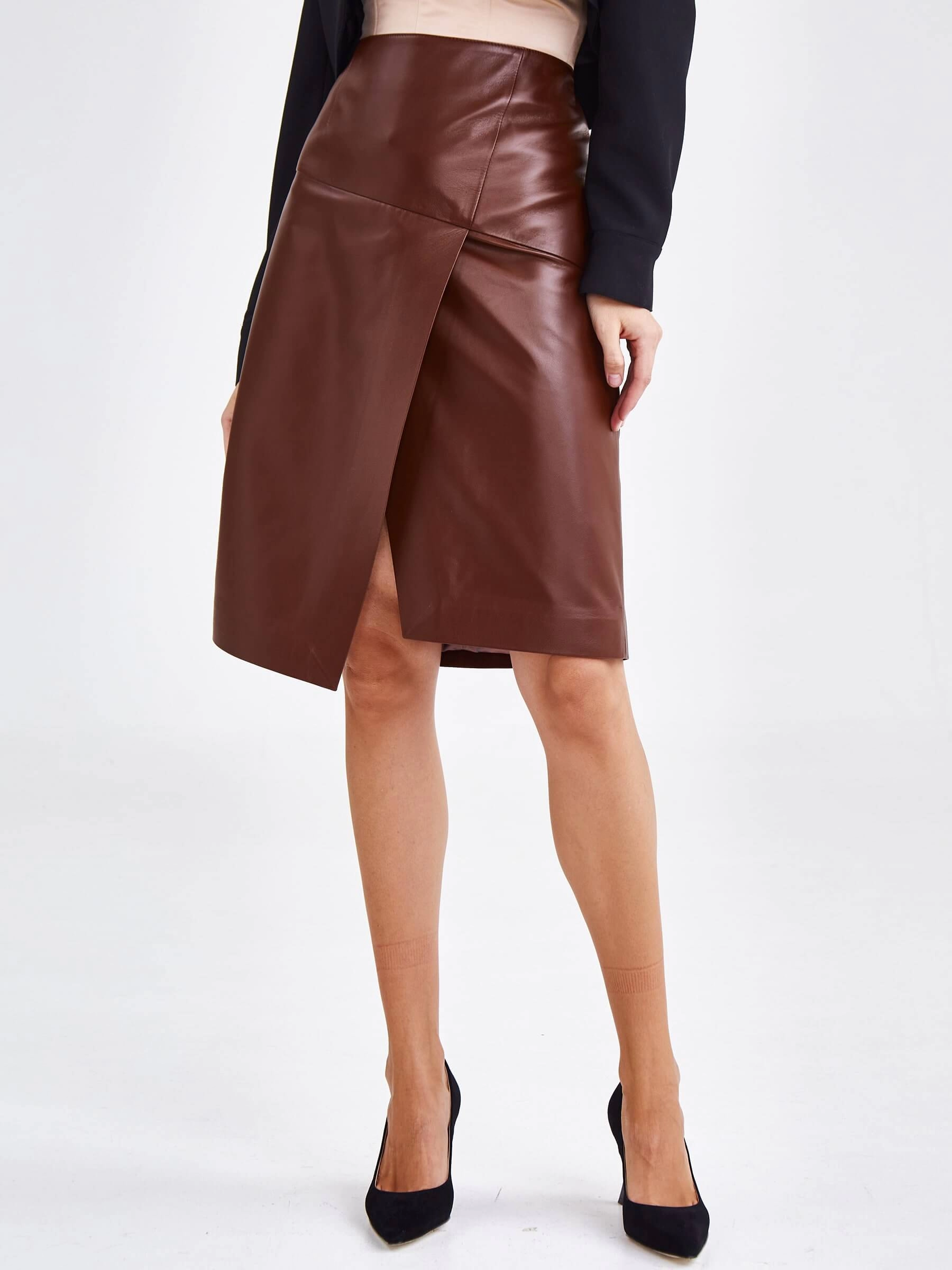 Товар юбка миди из натуральной кожи 15, табачная, размер 44, артикул 85890 выполнен из натуральной кожи с застежкой молния. Рассчитан на сезон: весна-осень. Длина изделия 62 см, силуэт прямой.