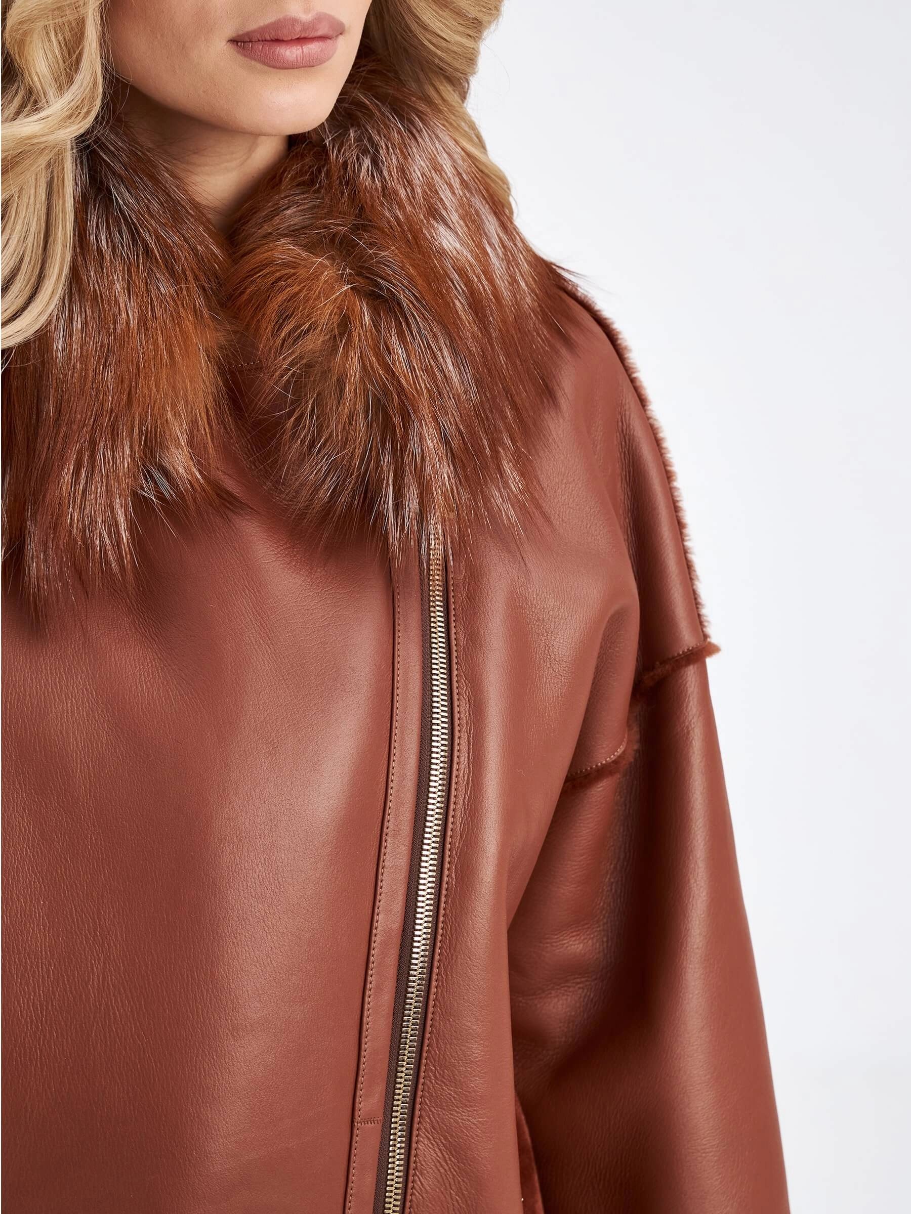 Женская куртка оверсайз из натуральной овчины с воротником из меха лисицы премиум класса 2042, виски, размер 42, артикул 63510