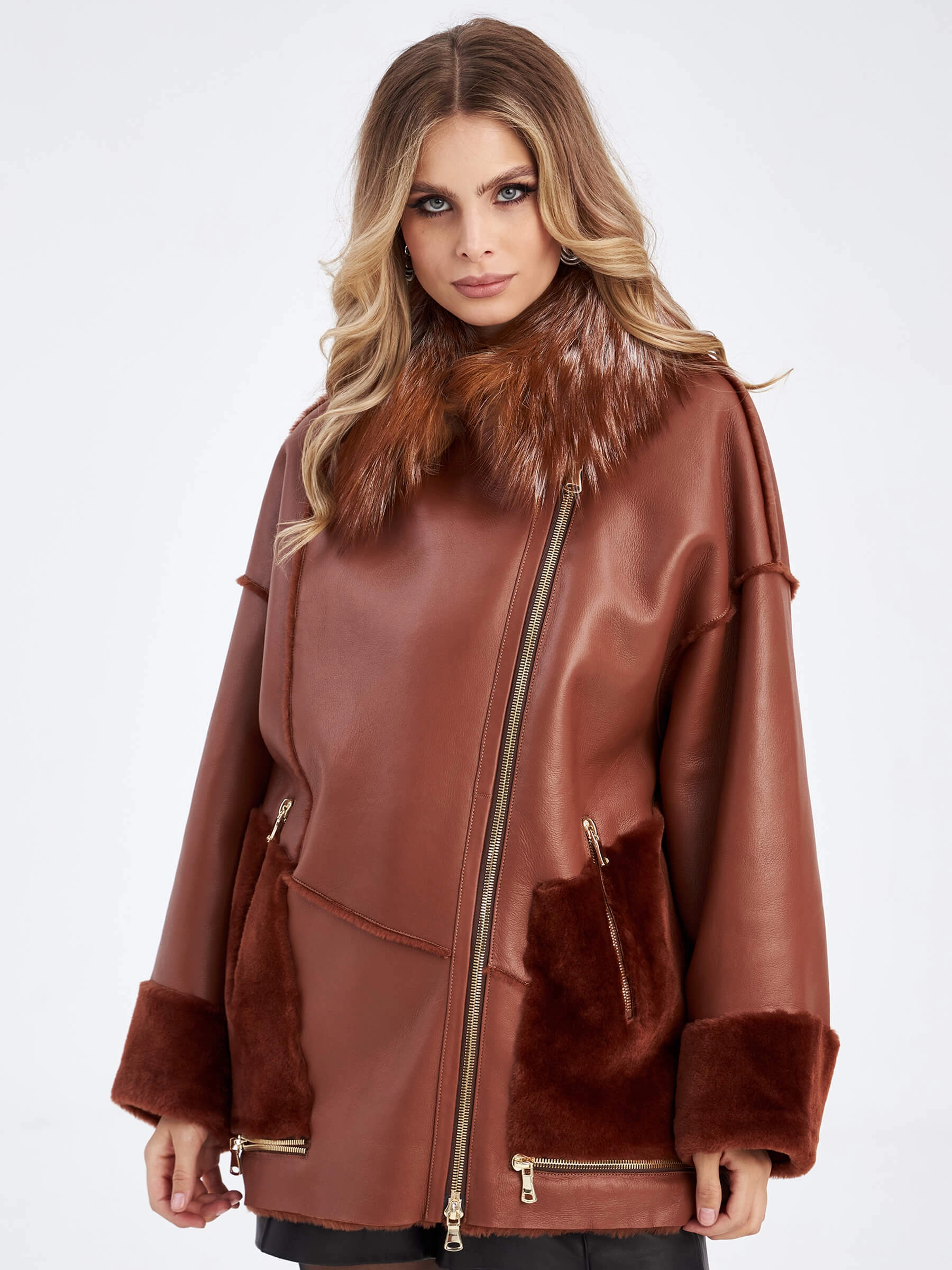 Товар женская куртка оверсайз из натуральной овчины с воротником из меха лисицы премиум класса 2042, виски, размер 42, артикул 63510 выполнен из овчина "мерино" с застежкой кнопки. Рассчитан на сезон: осень-зима. Длина изделия 70 см, силуэт прямой.