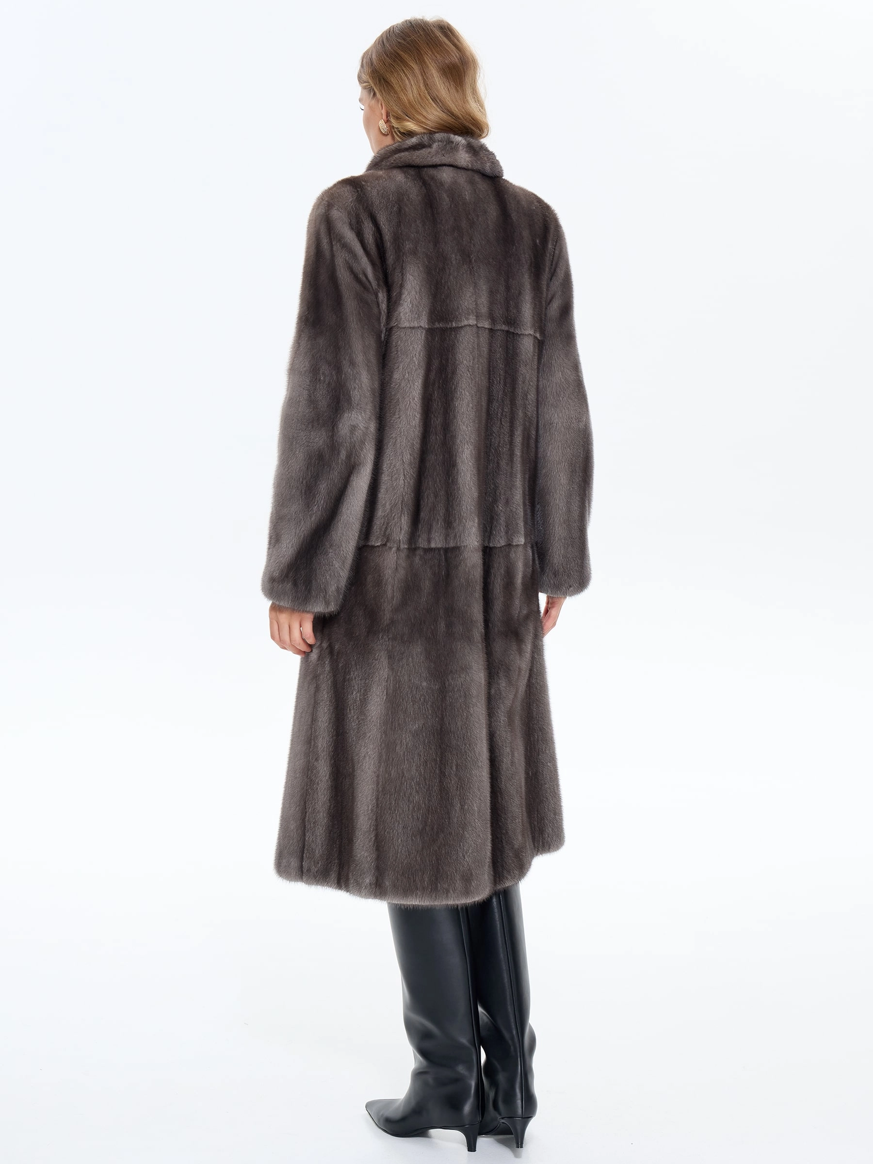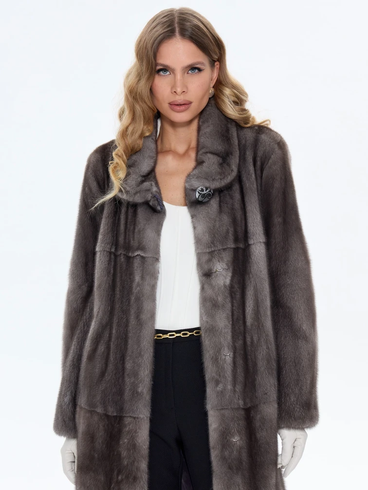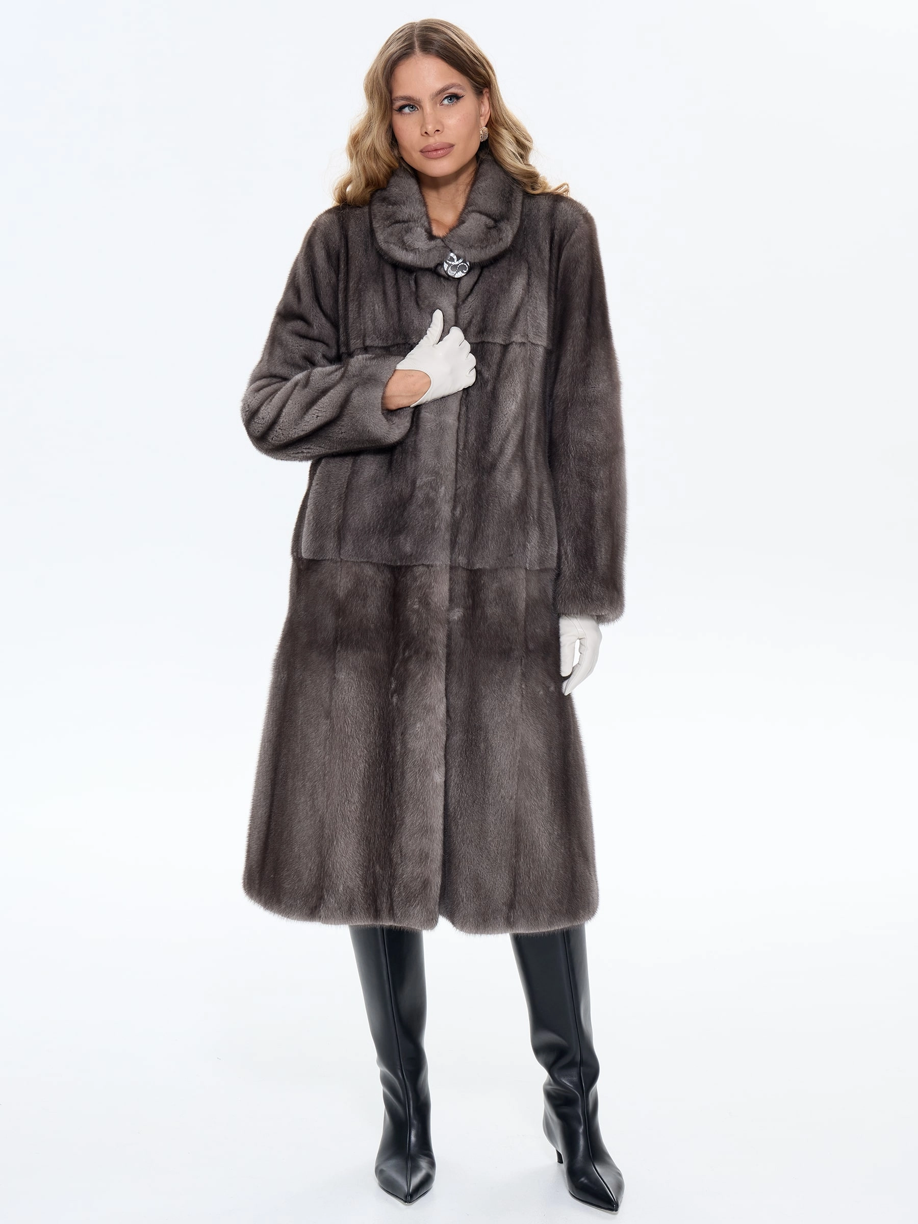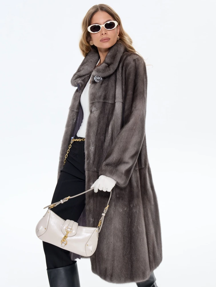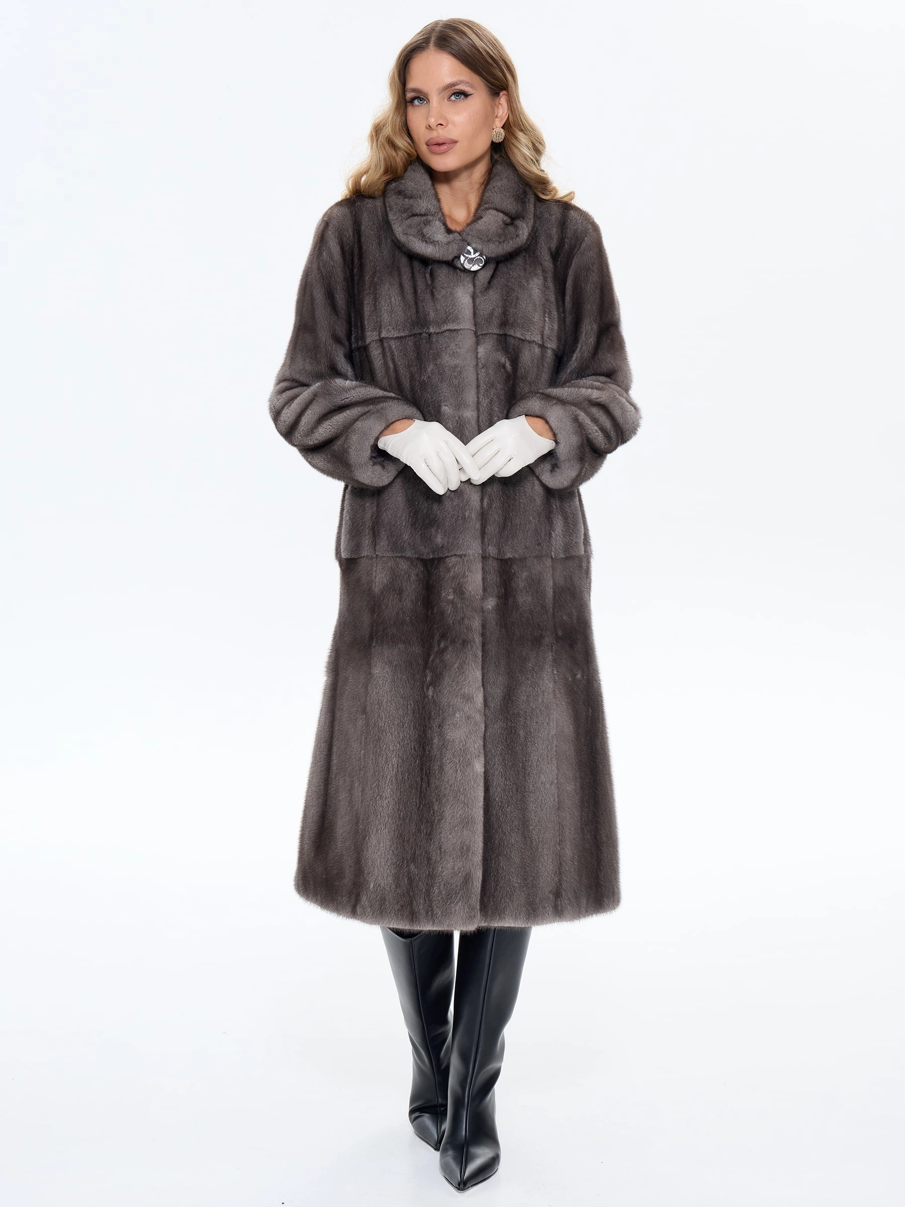 Классическую шубу с футуристичным металлическим отливом выполнили из низковорсовой густой серой натуральной норки. Полуприлегающий силуэт мягко подчеркивает талию, сохраняя свободу движений. Широкий отложной воротник драпируется в элегантные волны и может трансформироваться в строгую стойку. Уникальная особенность модели — металлический отлив, который меняет тон в зависимости от освещения: днем проявляется благородное серебро, а вечером — глубокий глянцевый графит. Максимальная длина до щиколотки обеспечивает надежную защиту от холода. Модель отличается идеальной посадкой по фигуре и оснащена скрытыми клипсами для безупречного силуэта