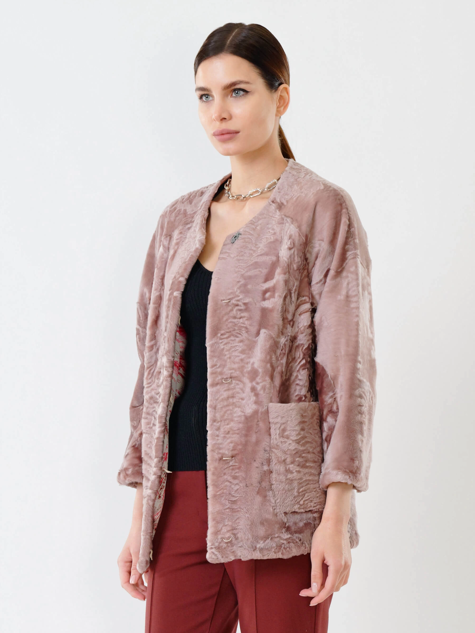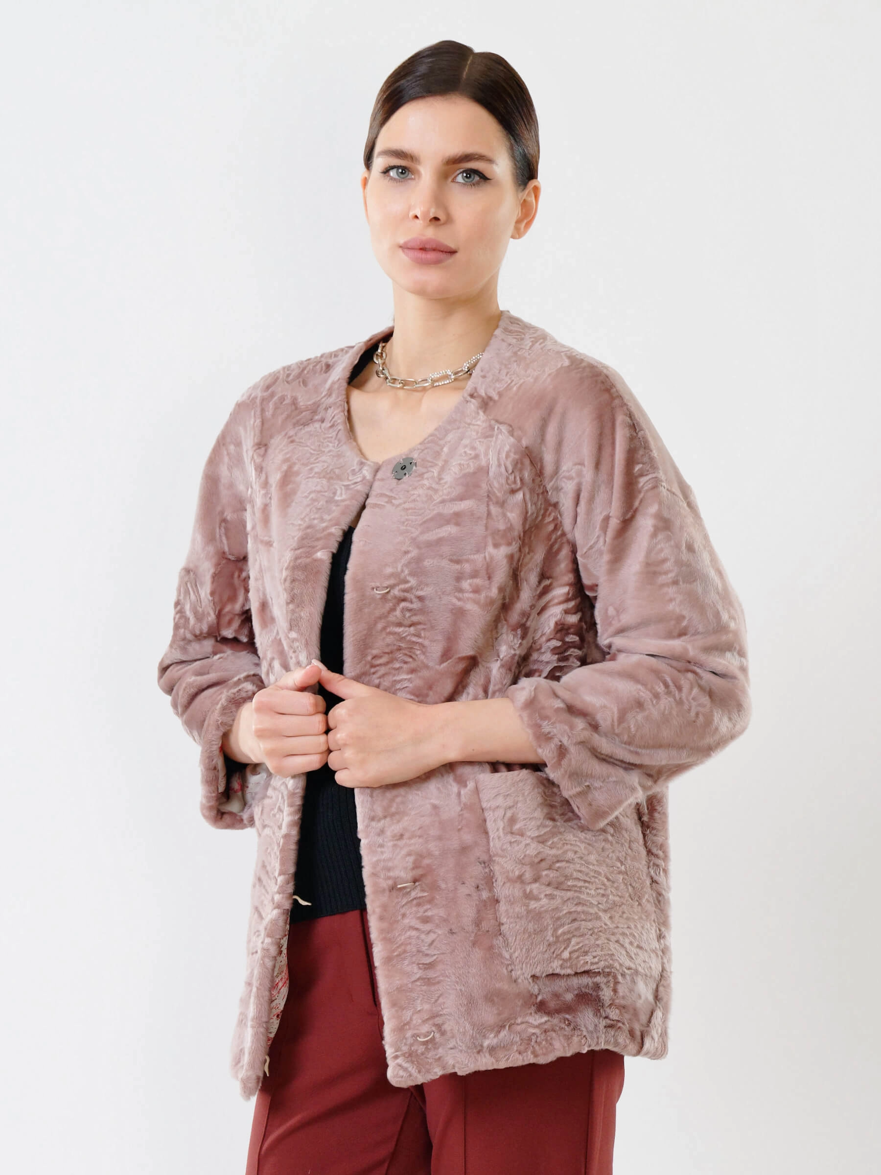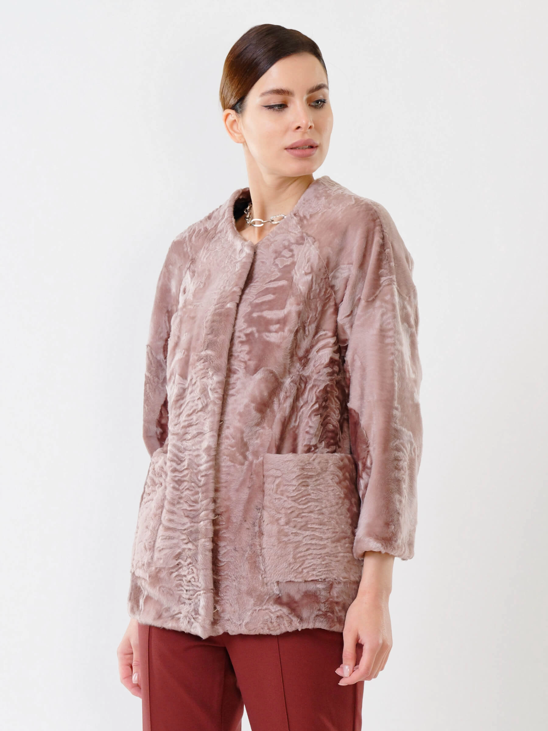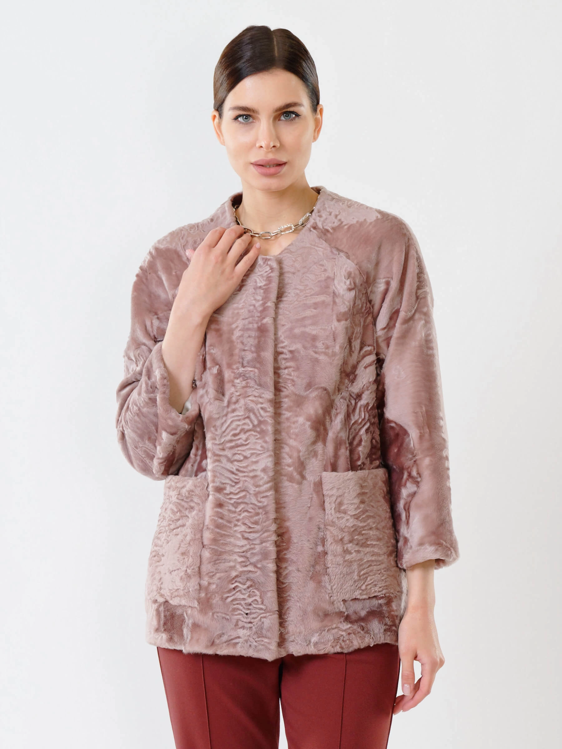 Товар куртка из каракуля женская 17309, розовая, размер 48, артикул 22530 выполнен из каракуль с застежкой клипсы. Рассчитан на сезон: осень-зима. Длина изделия 75-90 см, силуэт прямой.