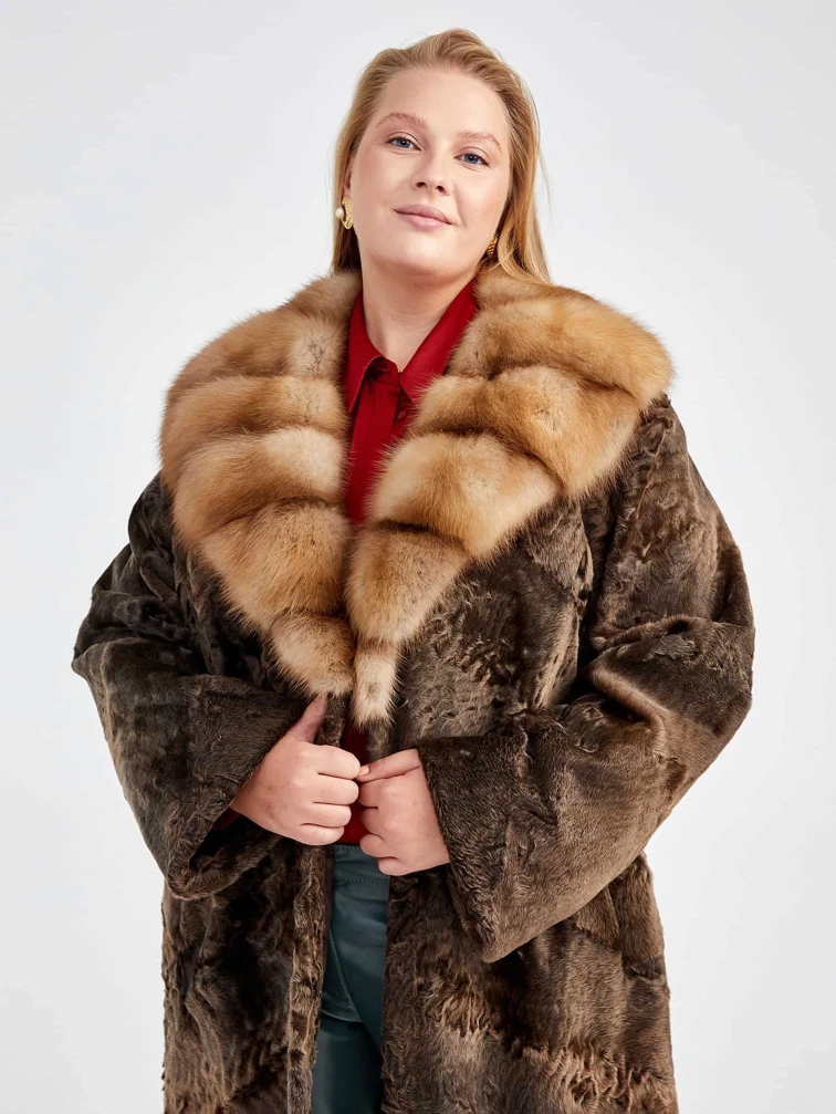Шуба женская из меха каракуля с мехом куницы Екатерина(вк), коричневая сур, размер 54, артикул 22740